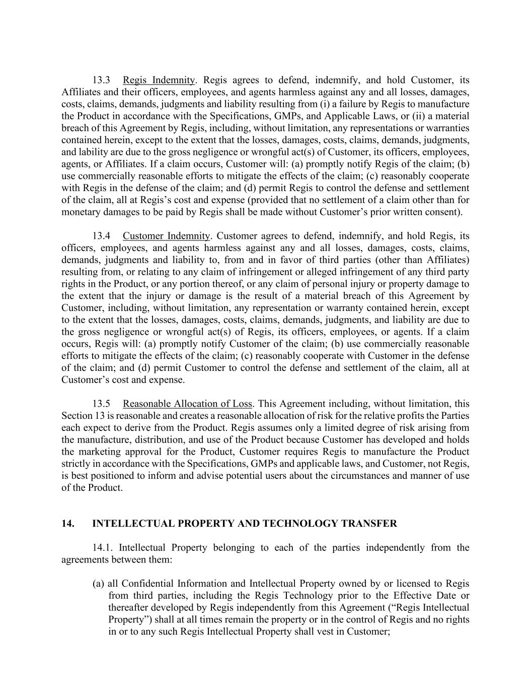 13.3 Regis Indemnity. Regis agrees to defend, indemnify, and hold Customer, its Affiliates and their officers, employees, and agents harmless against any and all losses, damages, costs, claims, demands, judgments and liability resulting from (i) a failure by Regis to manufacture the Product in accordance with the Specifications, GMPs, and Applicable Laws, or (ii) a material breach of this Agreement by Regis, including, without limitation, any representations or warranties contained herein, except to the extent that the losses, damages, costs, claims, demands, judgments, and lability are due to the gross negligence or wrongful act(s) of Customer, its officers, employees, agents, or Affiliates. If a claim occurs, Customer will: (a) promptly notify Regis of the claim; (b) use commercially reasonable efforts to mitigate the effects of the claim; (c) reasonably cooperate with Regis in the defense of the claim; and (d) permit Regis to control the defense and settlement of the claim, all at Regis’s cost and expense (provided that no settlement of a claim other than for monetary damages to be paid by Regis shall be made without Customer’s prior written consent). 13.4 Customer Indemnity. Customer agrees to defend, indemnify, and hold Regis, its officers, employees, and agents harmless against any and all losses, damages, costs, claims, demands, judgments and liability to, from and in favor of third parties (other than Affiliates) resulting from, or relating to any claim of infringement or alleged infringement of any third party rights in the Product, or any portion thereof, or any claim of personal injury or property damage to the extent that the injury or damage is the result of a material breach of this Agreement by Customer, including, without limitation, any representation or warranty contained herein, except to the extent that the losses, damages, costs, claims, demands, judgments, and liability are due to the gross negligence or wrongful act(s) of Regis, its officers, employees, or agents. If a claim occurs, Regis will: (a) promptly notify Customer of the claim; (b) use commercially reasonable efforts to mitigate the effects of the claim; (c) reasonably cooperate with Customer in the defense of the claim; and (d) permit Customer to control the defense and settlement of the claim, all at Customer’s cost and expense. 13.5 Reasonable Allocation of Loss. This Agreement including, without limitation, this Section 13 is reasonable and creates a reasonable allocation of risk for the relative profits the Parties each expect to derive from the Product. Regis assumes only a limited degree of risk arising from the manufacture, distribution, and use of the Product because Customer has developed and holds the marketing approval for the Product, Customer requires Regis to manufacture the Product strictly in accordance with the Specifications, GMPs and applicable laws, and Customer, not Regis, is best positioned to inform and advise potential users about the circumstances and manner of use of the Product. 14. INTELLECTUAL PROPERTY AND TECHNOLOGY TRANSFER 14.1. Intellectual Property belonging to each of the parties independently from the agreements between them: (a) all Confidential Information and Intellectual Property owned by or licensed to Regis from third parties, including the Regis Technology prior to the Effective Date or thereafter developed by Regis independently from this Agreement (“Regis Intellectual Property”) shall at all times remain the property or in the control of Regis and no rights in or to any such Regis Intellectual Property shall vest in Customer;