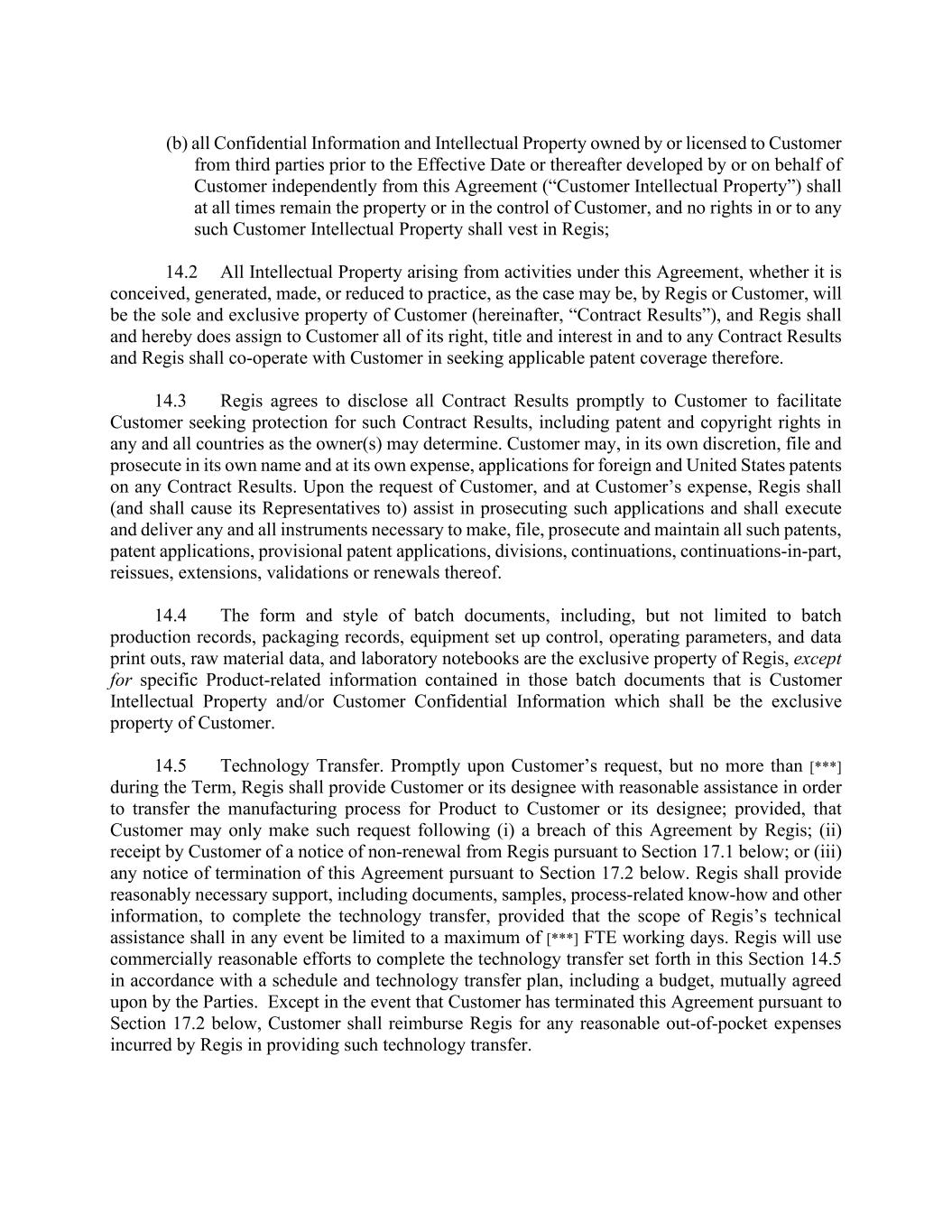 (b) all Confidential Information and Intellectual Property owned by or licensed to Customer from third parties prior to the Effective Date or thereafter developed by or on behalf of Customer independently from this Agreement (“Customer Intellectual Property”) shall at all times remain the property or in the control of Customer, and no rights in or to any such Customer Intellectual Property shall vest in Regis; 14.2 All Intellectual Property arising from activities under this Agreement, whether it is conceived, generated, made, or reduced to practice, as the case may be, by Regis or Customer, will be the sole and exclusive property of Customer (hereinafter, “Contract Results”), and Regis shall and hereby does assign to Customer all of its right, title and interest in and to any Contract Results and Regis shall co-operate with Customer in seeking applicable patent coverage therefore. 14.3 Regis agrees to disclose all Contract Results promptly to Customer to facilitate Customer seeking protection for such Contract Results, including patent and copyright rights in any and all countries as the owner(s) may determine. Customer may, in its own discretion, file and prosecute in its own name and at its own expense, applications for foreign and United States patents on any Contract Results. Upon the request of Customer, and at Customer’s expense, Regis shall (and shall cause its Representatives to) assist in prosecuting such applications and shall execute and deliver any and all instruments necessary to make, file, prosecute and maintain all such patents, patent applications, provisional patent applications, divisions, continuations, continuations-in-part, reissues, extensions, validations or renewals thereof. 14.4 The form and style of batch documents, including, but not limited to batch production records, packaging records, equipment set up control, operating parameters, and data print outs, raw material data, and laboratory notebooks are the exclusive property of Regis, except for specific Product-related information contained in those batch documents that is Customer Intellectual Property and/or Customer Confidential Information which shall be the exclusive property of Customer. 14.5 Technology Transfer. Promptly upon Customer’s request, but no more than [***] during the Term, Regis shall provide Customer or its designee with reasonable assistance in order to transfer the manufacturing process for Product to Customer or its designee; provided, that Customer may only make such request following (i) a breach of this Agreement by Regis; (ii) receipt by Customer of a notice of non-renewal from Regis pursuant to Section 17.1 below; or (iii) any notice of termination of this Agreement pursuant to Section 17.2 below. Regis shall provide reasonably necessary support, including documents, samples, process-related know-how and other information, to complete the technology transfer, provided that the scope of Regis’s technical assistance shall in any event be limited to a maximum of [***] FTE working days. Regis will use commercially reasonable efforts to complete the technology transfer set forth in this Section 14.5 in accordance with a schedule and technology transfer plan, including a budget, mutually agreed upon by the Parties. Except in the event that Customer has terminated this Agreement pursuant to Section 17.2 below, Customer shall reimburse Regis for any reasonable out-of-pocket expenses incurred by Regis in providing such technology transfer.