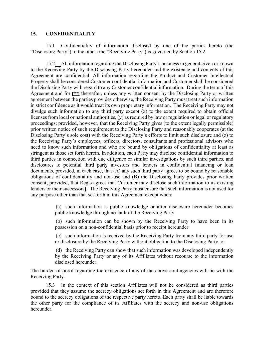 15. CONFIDENTIALITY 15.1 Confidentiality of information disclosed by one of the parties hereto (the “Disclosing Party”) to the other (the “Receiving Party”) is governed by Section 15.2. 15.2 All information regarding the Disclosing Party’s business in general given or known to the Receiving Party by the Disclosing Party hereunder and the existence and contents of this Agreement are confidential. All information regarding the Product and Customer Intellectual Property shall be considered Customer confidential information and Customer shall be considered the Disclosing Party with regard to any Customer confidential information. During the term of this Agreement and for [***] thereafter, unless any written consent by the Disclosing Party or written agreement between the parties provides otherwise, the Receiving Party must treat such information in strict confidence as it would treat its own proprietary information. The Receiving Party may not divulge such information to any third party except (x) to the extent required to obtain official licenses from local or national authorities, (y) as required by law or regulation or legal or regulatory proceedings; provided, however, that the Receiving Party gives (to the extent legally permissible) prior written notice of such requirement to the Disclosing Party and reasonably cooperates (at the Disclosing Party’s sole cost) with the Receiving Party’s efforts to limit such disclosure and (z) to the Receiving Party’s employees, officers, directors, consultants and professional advisors who need to know such information and who are bound by obligations of confidentiality at least as stringent as those set forth herein. In addition, each Party may disclose confidential information to third parties in connection with due diligence or similar investigations by such third parties, and disclosures to potential third party investors and lenders in confidential financing or loan documents, provided, in each case, that (A) any such third party agrees to be bound by reasonable obligations of confidentiality and non-use and (B) the Disclosing Party provides prior written consent; provided, that Regis agrees that Customer may disclose such information to its existing lenders or their successors). The Receiving Party must ensure that such information is not used for any purpose other than that set forth in this Agreement except when: (a) such information is public knowledge or after disclosure hereunder becomes public knowledge through no fault of the Receiving Party (b) such information can be shown by the Receiving Party to have been in its possession on a non-confidential basis prior to receipt hereunder (c) such information is received by the Receiving Party from any third party for use or disclosure by the Receiving Party without obligation to the Disclosing Party, or (d) the Receiving Party can show that such information was developed independently by the Receiving Party or any of its Affiliates without recourse to the information disclosed hereunder. The burden of proof regarding the existence of any of the above contingencies will lie with the Receiving Party. 15.3 In the context of this section Affiliates will not be considered as third parties provided that they assume the secrecy obligations set forth in this Agreement and are therefore bound to the secrecy obligations of the respective party hereto. Each party shall be liable towards the other party for the compliance of its Affiliates with the secrecy and non-use obligations hereunder.