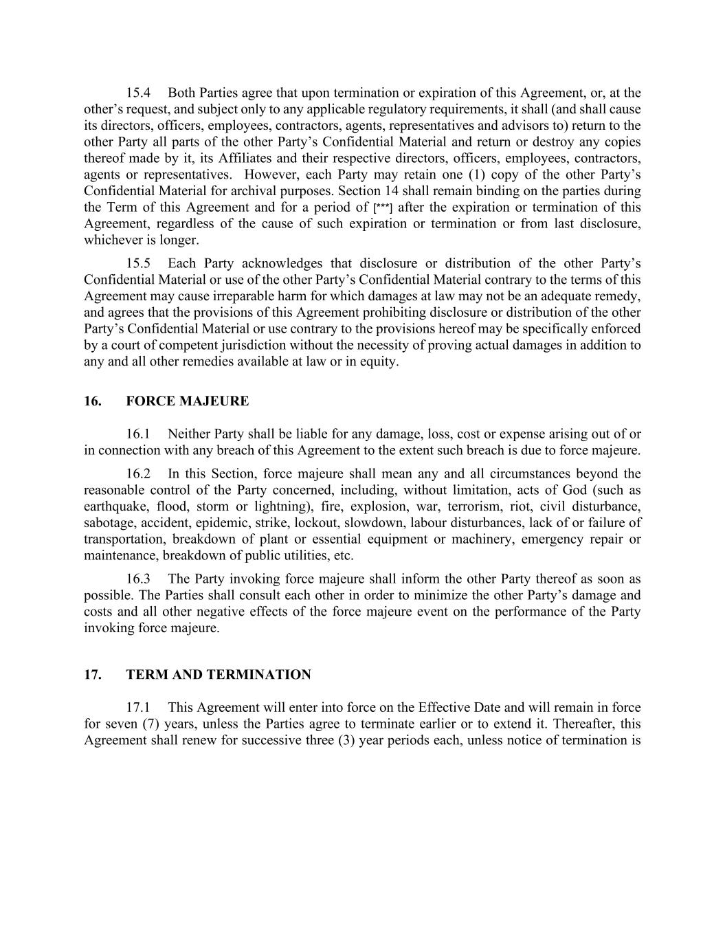 15.4 Both Parties agree that upon termination or expiration of this Agreement, or, at the other’s request, and subject only to any applicable regulatory requirements, it shall (and shall cause its directors, officers, employees, contractors, agents, representatives and advisors to) return to the other Party all parts of the other Party’s Confidential Material and return or destroy any copies thereof made by it, its Affiliates and their respective directors, officers, employees, contractors, agents or representatives. However, each Party may retain one (1) copy of the other Party’s Confidential Material for archival purposes. Section 14 shall remain binding on the parties during the Term of this Agreement and for a period of [***] after the expiration or termination of this Agreement, regardless of the cause of such expiration or termination or from last disclosure, whichever is longer. 15.5 Each Party acknowledges that disclosure or distribution of the other Party’s Confidential Material or use of the other Party’s Confidential Material contrary to the terms of this Agreement may cause irreparable harm for which damages at law may not be an adequate remedy, and agrees that the provisions of this Agreement prohibiting disclosure or distribution of the other Party’s Confidential Material or use contrary to the provisions hereof may be specifically enforced by a court of competent jurisdiction without the necessity of proving actual damages in addition to any and all other remedies available at law or in equity. 16. FORCE MAJEURE 16.1 Neither Party shall be liable for any damage, loss, cost or expense arising out of or in connection with any breach of this Agreement to the extent such breach is due to force majeure. 16.2 In this Section, force majeure shall mean any and all circumstances beyond the reasonable control of the Party concerned, including, without limitation, acts of God (such as earthquake, flood, storm or lightning), fire, explosion, war, terrorism, riot, civil disturbance, sabotage, accident, epidemic, strike, lockout, slowdown, labour disturbances, lack of or failure of transportation, breakdown of plant or essential equipment or machinery, emergency repair or maintenance, breakdown of public utilities, etc. 16.3 The Party invoking force majeure shall inform the other Party thereof as soon as possible. The Parties shall consult each other in order to minimize the other Party’s damage and costs and all other negative effects of the force majeure event on the performance of the Party invoking force majeure. 17. TERM AND TERMINATION 17.1 This Agreement will enter into force on the Effective Date and will remain in force for seven (7) years, unless the Parties agree to terminate earlier or to extend it. Thereafter, this Agreement shall renew for successive three (3) year periods each, unless notice of termination is