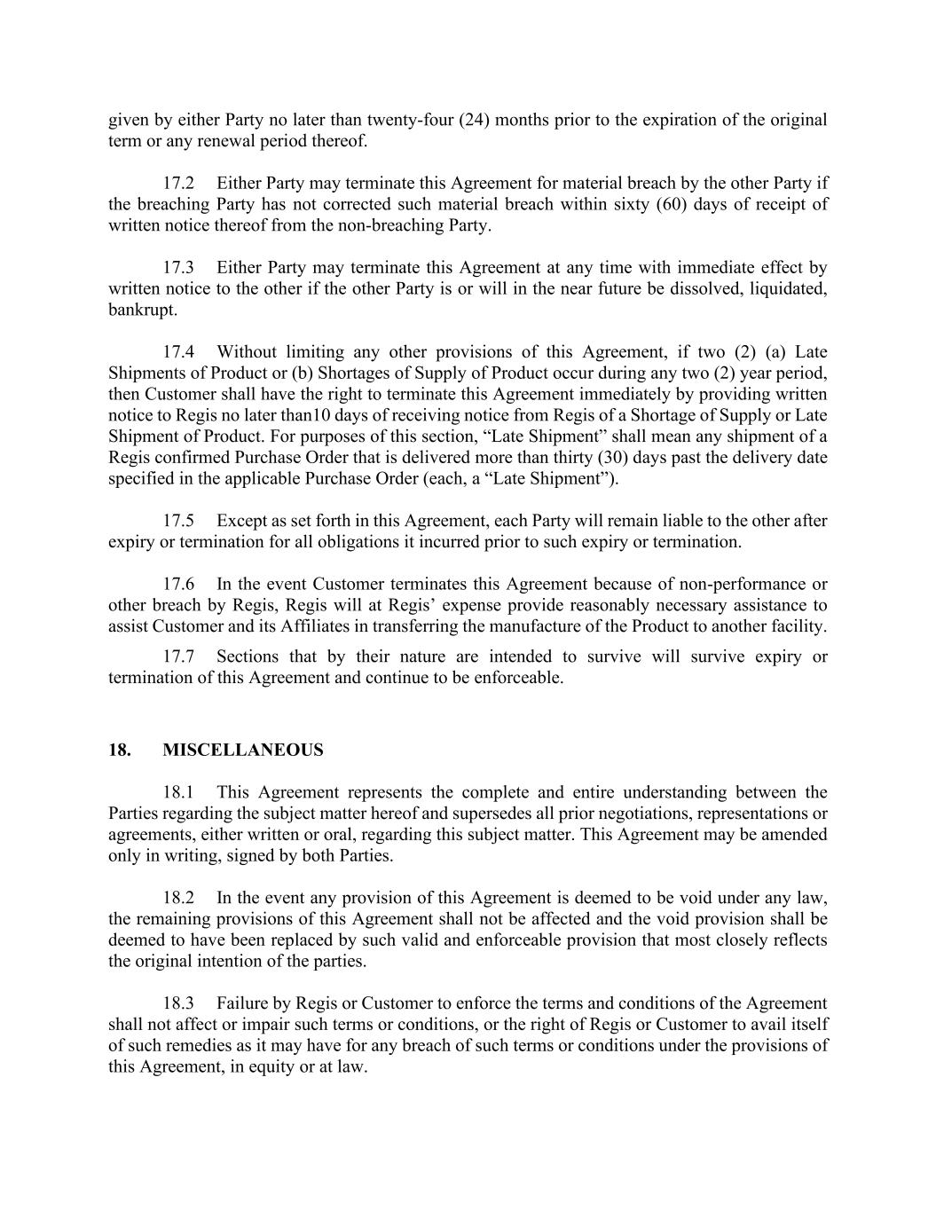 given by either Party no later than twenty-four (24) months prior to the expiration of the original term or any renewal period thereof. 17.2 Either Party may terminate this Agreement for material breach by the other Party if the breaching Party has not corrected such material breach within sixty (60) days of receipt of written notice thereof from the non-breaching Party. 17.3 Either Party may terminate this Agreement at any time with immediate effect by written notice to the other if the other Party is or will in the near future be dissolved, liquidated, bankrupt. 17.4 Without limiting any other provisions of this Agreement, if two (2) (a) Late Shipments of Product or (b) Shortages of Supply of Product occur during any two (2) year period, then Customer shall have the right to terminate this Agreement immediately by providing written notice to Regis no later than10 days of receiving notice from Regis of a Shortage of Supply or Late Shipment of Product. For purposes of this section, “Late Shipment” shall mean any shipment of a Regis confirmed Purchase Order that is delivered more than thirty (30) days past the delivery date specified in the applicable Purchase Order (each, a “Late Shipment”). 17.5 Except as set forth in this Agreement, each Party will remain liable to the other after expiry or termination for all obligations it incurred prior to such expiry or termination. 17.6 In the event Customer terminates this Agreement because of non-performance or other breach by Regis, Regis will at Regis’ expense provide reasonably necessary assistance to assist Customer and its Affiliates in transferring the manufacture of the Product to another facility. 17.7 Sections that by their nature are intended to survive will survive expiry or termination of this Agreement and continue to be enforceable. 18. MISCELLANEOUS 18.1 This Agreement represents the complete and entire understanding between the Parties regarding the subject matter hereof and supersedes all prior negotiations, representations or agreements, either written or oral, regarding this subject matter. This Agreement may be amended only in writing, signed by both Parties. 18.2 In the event any provision of this Agreement is deemed to be void under any law, the remaining provisions of this Agreement shall not be affected and the void provision shall be deemed to have been replaced by such valid and enforceable provision that most closely reflects the original intention of the parties. 18.3 Failure by Regis or Customer to enforce the terms and conditions of the Agreement shall not affect or impair such terms or conditions, or the right of Regis or Customer to avail itself of such remedies as it may have for any breach of such terms or conditions under the provisions of this Agreement, in equity or at law.