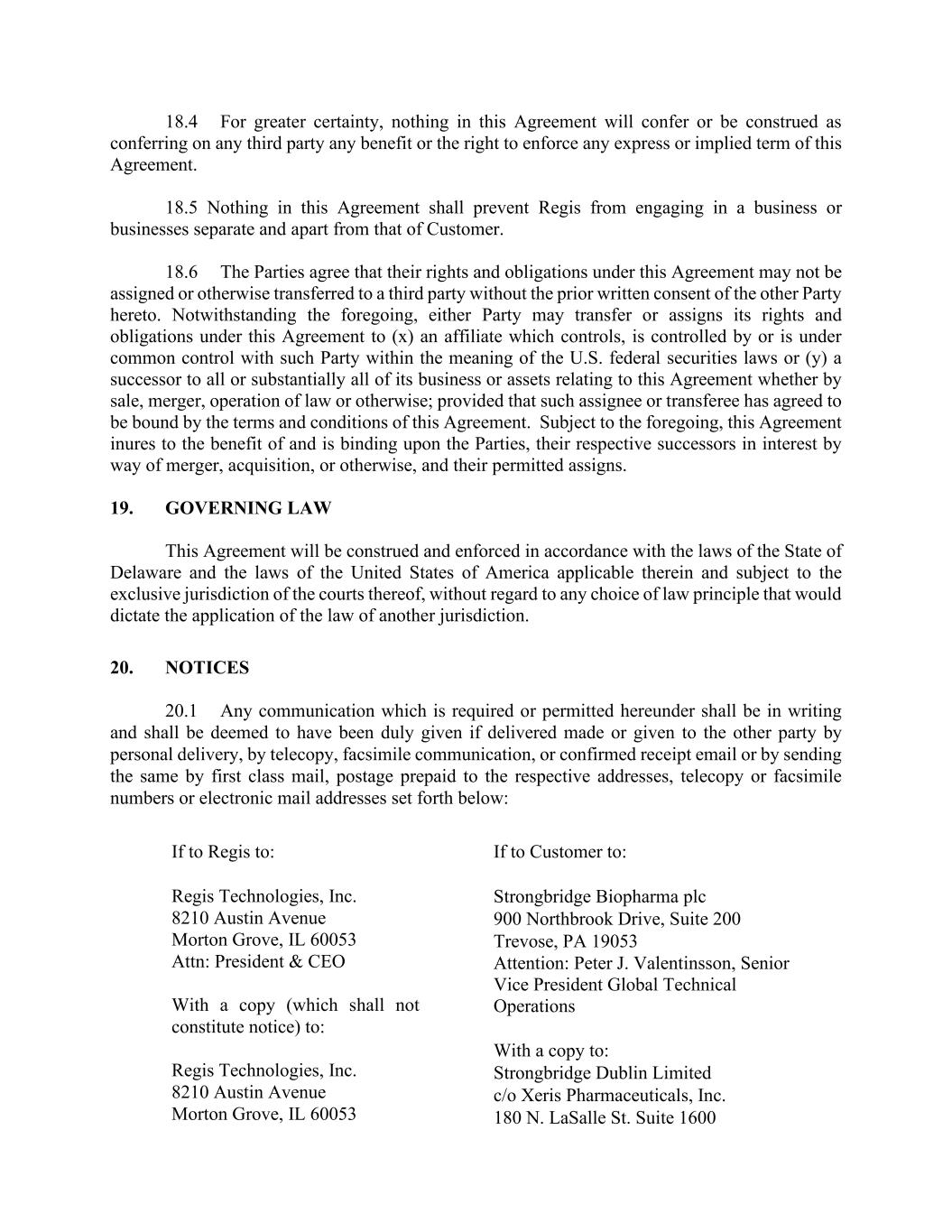 18.4 For greater certainty, nothing in this Agreement will confer or be construed as conferring on any third party any benefit or the right to enforce any express or implied term of this Agreement. 18.5 Nothing in this Agreement shall prevent Regis from engaging in a business or businesses separate and apart from that of Customer. 18.6 The Parties agree that their rights and obligations under this Agreement may not be assigned or otherwise transferred to a third party without the prior written consent of the other Party hereto. Notwithstanding the foregoing, either Party may transfer or assigns its rights and obligations under this Agreement to (x) an affiliate which controls, is controlled by or is under common control with such Party within the meaning of the U.S. federal securities laws or (y) a successor to all or substantially all of its business or assets relating to this Agreement whether by sale, merger, operation of law or otherwise; provided that such assignee or transferee has agreed to be bound by the terms and conditions of this Agreement. Subject to the foregoing, this Agreement inures to the benefit of and is binding upon the Parties, their respective successors in interest by way of merger, acquisition, or otherwise, and their permitted assigns. 19. GOVERNING LAW This Agreement will be construed and enforced in accordance with the laws of the State of Delaware and the laws of the United States of America applicable therein and subject to the exclusive jurisdiction of the courts thereof, without regard to any choice of law principle that would dictate the application of the law of another jurisdiction. 20. NOTICES 20.1 Any communication which is required or permitted hereunder shall be in writing and shall be deemed to have been duly given if delivered made or given to the other party by personal delivery, by telecopy, facsimile communication, or confirmed receipt email or by sending the same by first class mail, postage prepaid to the respective addresses, telecopy or facsimile numbers or electronic mail addresses set forth below: If to Regis to: Regis Technologies, Inc. 8210 Austin Avenue Morton Grove, IL 60053 Attn: President & CEO With a copy (which shall not constitute notice) to: Regis Technologies, Inc. 8210 Austin Avenue Morton Grove, IL 60053 If to Customer to: Strongbridge Biopharma plc 900 Northbrook Drive, Suite 200 Trevose, PA 19053 Attention: Peter J. Valentinsson, Senior Vice President Global Technical Operations With a copy to: Strongbridge Dublin Limited c/o Xeris Pharmaceuticals, Inc. 180 N. LaSalle St. Suite 1600