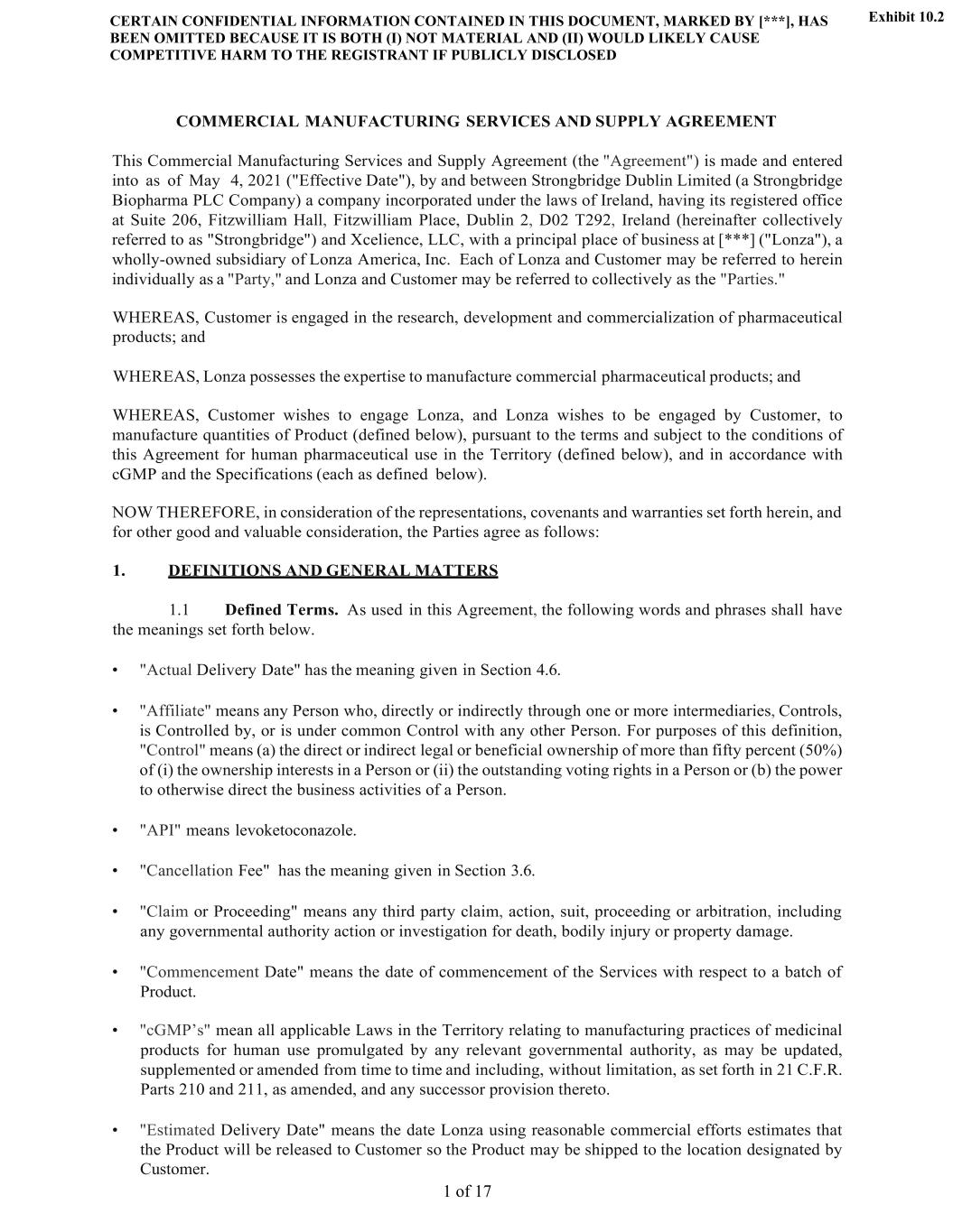 CERTAIN CONFIDENTIAL INFORMATION CONTAINED IN THIS DOCUMENT, MARKED BY [***], HAS BEEN OMITTED BECAUSE IT IS BOTH (I) NOT MATERIAL AND (II) WOULD LIKELY CAUSE COMPETITIVE HARM TO THE REGISTRANT IF PUBLICLY DISCLOSED 1 of 17 COMMERCIAL MANUFACTURING SERVICES AND SUPPLY AGREEMENT This Commercial Manufacturing Services and Supply Agreement (the "Agreement") is made and entered into as of May 4, 2021 ("Effective Date"), by and between Strongbridge Dublin Limited (a Strongbridge Biopharma PLC Company) a company incorporated under the laws of Ireland, having its registered office at Suite 206, Fitzwilliam Hall, Fitzwilliam Place, Dublin 2, D02 T292, Ireland (hereinafter collectively referred to as "Strongbridge") and Xcelience, LLC, with a principal place of business at [***] ("Lonza"), a wholly-owned subsidiary of Lonza America, Inc. Each of Lonza and Customer may be referred to herein individually as a "Party," and Lonza and Customer may be referred to collectively as the "Parties." WHEREAS, Customer is engaged in the research, development and commercialization of pharmaceutical products; and WHEREAS, Lonza possesses the expertise to manufacture commercial pharmaceutical products; and WHEREAS, Customer wishes to engage Lonza, and Lonza wishes to be engaged by Customer, to manufacture quantities of Product (defined below), pursuant to the terms and subject to the conditions of this Agreement for human pharmaceutical use in the Territory (defined below), and in accordance with cGMP and the Specifications (each as defined below). NOW THEREFORE, in consideration of the representations, covenants and warranties set forth herein, and for other good and valuable consideration, the Parties agree as follows: 1. DEFINITIONS AND GENERAL MATTERS 1.1 Defined Terms. As used in this Agreement, the following words and phrases shall have the meanings set forth below. • "Actual Delivery Date" has the meaning given in Section 4.6. • "Affiliate" means any Person who, directly or indirectly through one or more intermediaries, Controls, is Controlled by, or is under common Control with any other Person. For purposes of this definition, "Control" means (a) the direct or indirect legal or beneficial ownership of more than fifty percent (50%) of (i) the ownership interests in a Person or (ii) the outstanding voting rights in a Person or (b) the power to otherwise direct the business activities of a Person. • "API" means levoketoconazole. • "Cancellation Fee" has the meaning given in Section 3.6. • "Claim or Proceeding" means any third party claim, action, suit, proceeding or arbitration, including any governmental authority action or investigation for death, bodily injury or property damage. • "Commencement Date" means the date of commencement of the Services with respect to a batch of Product. • "cGMP’s" mean all applicable Laws in the Territory relating to manufacturing practices of medicinal products for human use promulgated by any relevant governmental authority, as may be updated, supplemented or amended from time to time and including, without limitation, as set forth in 21 C.F.R. Parts 210 and 211, as amended, and any successor provision thereto. • "Estimated Delivery Date" means the date Lonza using reasonable commercial efforts estimates that the Product will be released to Customer so the Product may be shipped to the location designated by Customer. Exhibit 10.2