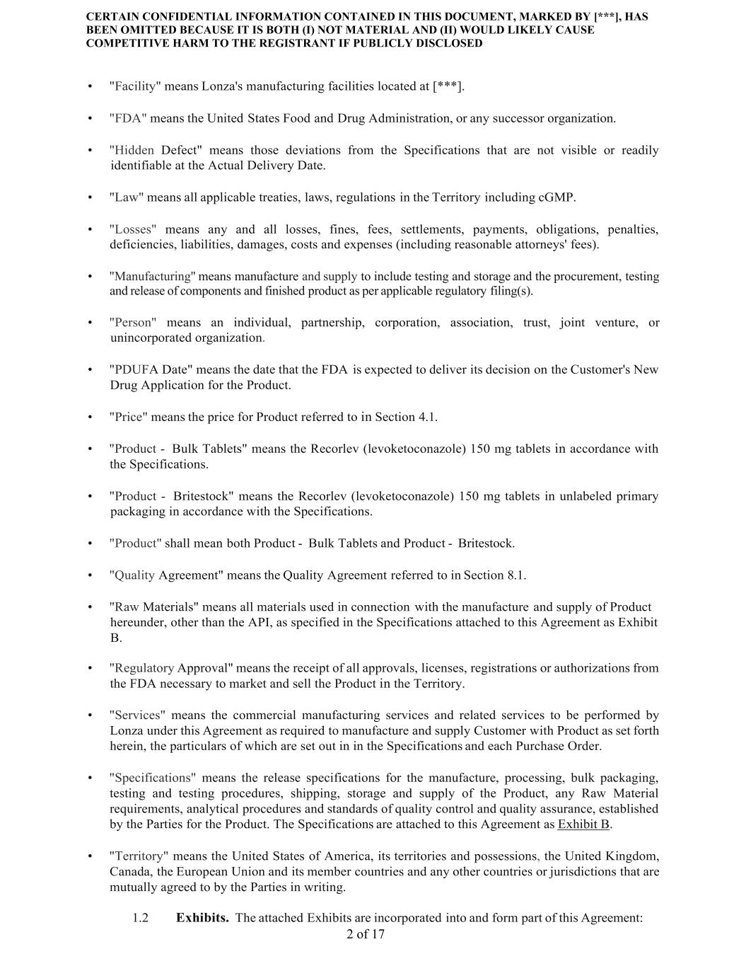 CERTAIN CONFIDENTIAL INFORMATION CONTAINED IN THIS DOCUMENT, MARKED BY [***], HAS BEEN OMITTED BECAUSE IT IS BOTH (I) NOT MATERIAL AND (II) WOULD LIKELY CAUSE COMPETITIVE HARM TO THE REGISTRANT IF PUBLICLY DISCLOSED 2 of 17 • "Facility" means Lonza's manufacturing facilities located at [***]. • "FDA" means the United States Food and Drug Administration, or any successor organization. • "Hidden Defect" means those deviations from the Specifications that are not visible or readily identifiable at the Actual Delivery Date. • "Law" means all applicable treaties, laws, regulations in the Territory including cGMP. • "Losses" means any and all losses, fines, fees, settlements, payments, obligations, penalties, deficiencies, liabilities, damages, costs and expenses (including reasonable attorneys' fees). • "Manufacturing" means manufacture and supply to include testing and storage and the procurement, testing and release of components and finished product as per applicable regulatory filing(s). • "Person" means an individual, partnership, corporation, association, trust, joint venture, or unincorporated organization. • "PDUFA Date" means the date that the FDA is expected to deliver its decision on the Customer's New Drug Application for the Product. • "Price" means the price for Product referred to in Section 4.1. • "Product - Bulk Tablets" means the Recorlev (levoketoconazole) 150 mg tablets in accordance with the Specifications. • "Product - Britestock" means the Recorlev (levoketoconazole) 150 mg tablets in unlabeled primary packaging in accordance with the Specifications. • "Product" shall mean both Product - Bulk Tablets and Product - Britestock. • "Quality Agreement" means the Quality Agreement referred to in Section 8.1. • "Raw Materials" means all materials used in connection with the manufacture and supply of Product hereunder, other than the API, as specified in the Specifications attached to this Agreement as Exhibit B. • "Regulatory Approval" means the receipt of all approvals, licenses, registrations or authorizations from the FDA necessary to market and sell the Product in the Territory. • "Services" means the commercial manufacturing services and related services to be performed by Lonza under this Agreement as required to manufacture and supply Customer with Product as set forth herein, the particulars of which are set out in in the Specifications and each Purchase Order. • "Specifications" means the release specifications for the manufacture, processing, bulk packaging, testing and testing procedures, shipping, storage and supply of the Product, any Raw Material requirements, analytical procedures and standards of quality control and quality assurance, established by the Parties for the Product. The Specifications are attached to this Agreement as Exhibit B. • "Territory" means the United States of America, its territories and possessions, the United Kingdom, Canada, the European Union and its member countries and any other countries or jurisdictions that are mutually agreed to by the Parties in writing. 1.2 Exhibits. The attached Exhibits are incorporated into and form part of this Agreement: