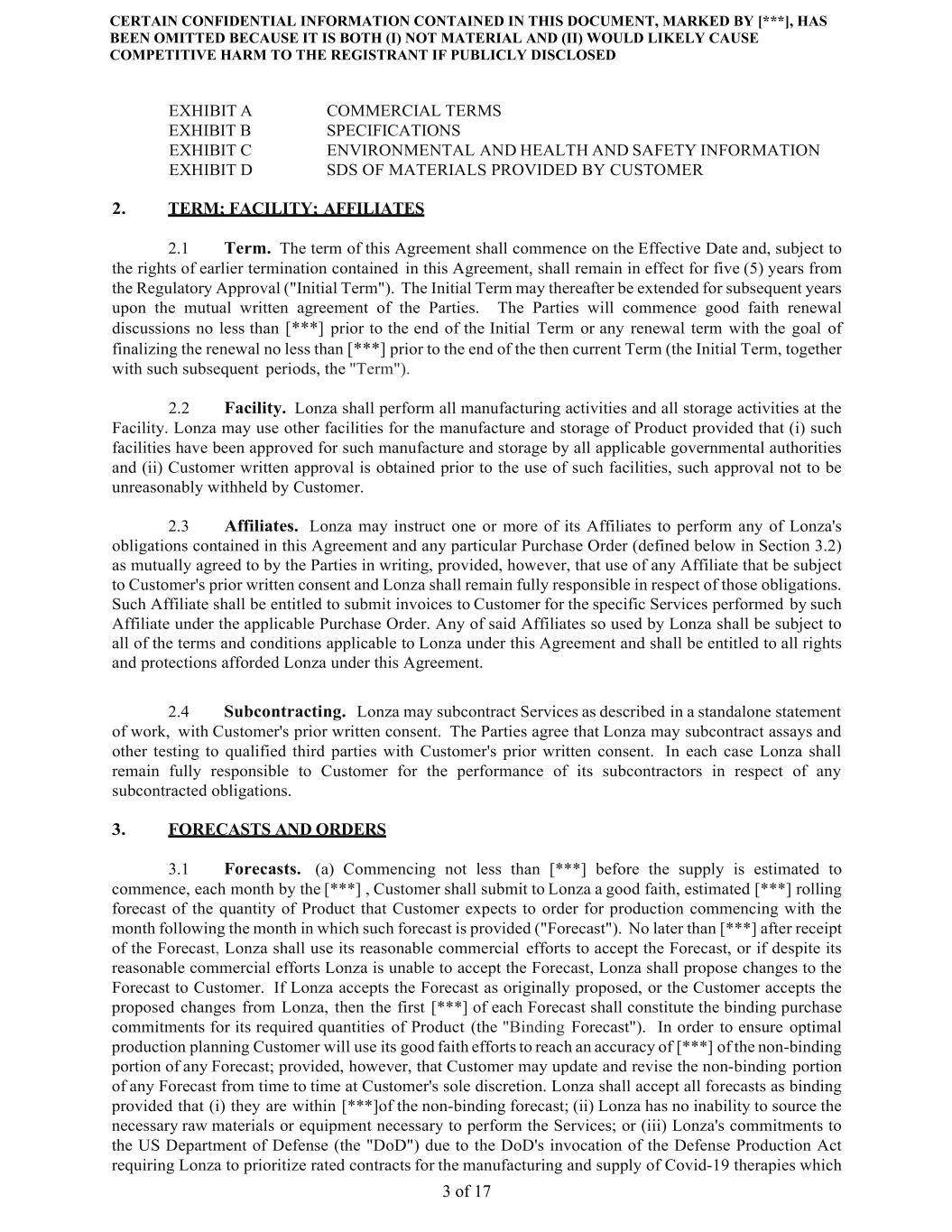 CERTAIN CONFIDENTIAL INFORMATION CONTAINED IN THIS DOCUMENT, MARKED BY [***], HAS BEEN OMITTED BECAUSE IT IS BOTH (I) NOT MATERIAL AND (II) WOULD LIKELY CAUSE COMPETITIVE HARM TO THE REGISTRANT IF PUBLICLY DISCLOSED 3 of 17 EXHIBIT A COMMERCIAL TERMS EXHIBIT B SPECIFICATIONS EXHIBIT C ENVIRONMENTAL AND HEALTH AND SAFETY INFORMATION EXHIBIT D SDS OF MATERIALS PROVIDED BY CUSTOMER 2. TERM; FACILITY; AFFILIATES 2.1 Term. The term of this Agreement shall commence on the Effective Date and, subject to the rights of earlier termination contained in this Agreement, shall remain in effect for five (5) years from the Regulatory Approval ("Initial Term"). The Initial Term may thereafter be extended for subsequent years upon the mutual written agreement of the Parties. The Parties will commence good faith renewal discussions no less than [***] prior to the end of the Initial Term or any renewal term with the goal of finalizing the renewal no less than [***] prior to the end of the then current Term (the Initial Term, together with such subsequent periods, the "Term"). 2.2 Facility. Lonza shall perform all manufacturing activities and all storage activities at the Facility. Lonza may use other facilities for the manufacture and storage of Product provided that (i) such facilities have been approved for such manufacture and storage by all applicable governmental authorities and (ii) Customer written approval is obtained prior to the use of such facilities, such approval not to be unreasonably withheld by Customer. 2.3 Affiliates. Lonza may instruct one or more of its Affiliates to perform any of Lonza's obligations contained in this Agreement and any particular Purchase Order (defined below in Section 3.2) as mutually agreed to by the Parties in writing, provided, however, that use of any Affiliate that be subject to Customer's prior written consent and Lonza shall remain fully responsible in respect of those obligations. Such Affiliate shall be entitled to submit invoices to Customer for the specific Services performed by such Affiliate under the applicable Purchase Order. Any of said Affiliates so used by Lonza shall be subject to all of the terms and conditions applicable to Lonza under this Agreement and shall be entitled to all rights and protections afforded Lonza under this Agreement. 2.4 Subcontracting. Lonza may subcontract Services as described in a standalone statement of work, with Customer's prior written consent. The Parties agree that Lonza may subcontract assays and other testing to qualified third parties with Customer's prior written consent. In each case Lonza shall remain fully responsible to Customer for the performance of its subcontractors in respect of any subcontracted obligations. 3. FORECASTS AND ORDERS 3.1 Forecasts. (a) Commencing not less than [***] before the supply is estimated to commence, each month by the [***] , Customer shall submit to Lonza a good faith, estimated [***] rolling forecast of the quantity of Product that Customer expects to order for production commencing with the month following the month in which such forecast is provided ("Forecast"). No later than [***] after receipt of the Forecast, Lonza shall use its reasonable commercial efforts to accept the Forecast, or if despite its reasonable commercial efforts Lonza is unable to accept the Forecast, Lonza shall propose changes to the Forecast to Customer. If Lonza accepts the Forecast as originally proposed, or the Customer accepts the proposed changes from Lonza, then the first [***] of each Forecast shall constitute the binding purchase commitments for its required quantities of Product (the "Binding Forecast"). In order to ensure optimal production planning Customer will use its good faith efforts to reach an accuracy of [***] of the non-binding portion of any Forecast; provided, however, that Customer may update and revise the non-binding portion of any Forecast from time to time at Customer's sole discretion. Lonza shall accept all forecasts as binding provided that (i) they are within [***]of the non-binding forecast; (ii) Lonza has no inability to source the necessary raw materials or equipment necessary to perform the Services; or (iii) Lonza's commitments to the US Department of Defense (the "DoD") due to the DoD's invocation of the Defense Production Act requiring Lonza to prioritize rated contracts for the manufacturing and supply of Covid-19 therapies which