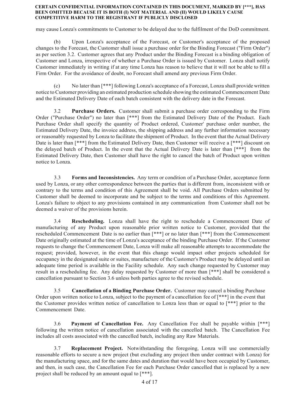 CERTAIN CONFIDENTIAL INFORMATION CONTAINED IN THIS DOCUMENT, MARKED BY [***], HAS BEEN OMITTED BECAUSE IT IS BOTH (I) NOT MATERIAL AND (II) WOULD LIKELY CAUSE COMPETITIVE HARM TO THE REGISTRANT IF PUBLICLY DISCLOSED 4 of 17 may cause Lonza's commitments to Customer to be delayed due to the fulfilment of the DoD commitment. (b) Upon Lonza's acceptance of the Forecast, or Customer's acceptance of the proposed changes to the Forecast, the Customer shall issue a purchase order for the Binding Forecast ("Firm Order") as per section 3.2. Customer agrees that any Product under the Binding Forecast is a binding obligation of Customer and Lonza, irrespective of whether a Purchase Order is issued by Customer. Lonza shall notify Customer immediately in writing if at any time Lonza has reason to believe that it will not be able to fill a Firm Order. For the avoidance of doubt, no Forecast shall amend any previous Firm Order. (c) No later than [***] following Lonza's acceptance of a Forecast, Lonza shall provide written notice to Customer providing an estimated production schedule showing the estimated Commencement Date and the Estimated Delivery Date of each batch consistent with the delivery date in the Forecast. 3.2 Purchase Orders. Customer shall submit a purchase order corresponding to the Firm Order ("Purchase Order") no later than [***] from the Estimated Delivery Date of the Product. Each Purchase Order shall specify the quantity of Product ordered, Customer' purchase order number, the Estimated Delivery Date, the invoice address, the shipping address and any further information necessary or reasonably requested by Lonza to facilitate the shipment of Product. In the event that the Actual Delivery Date is later than [***] from the Estimated Delivery Date, then Customer will receive a [***] discount on the delayed batch of Product. In the event that the Actual Delivery Date is later than [***] from the Estimated Delivery Date, then Customer shall have the right to cancel the batch of Product upon written notice to Lonza. 3.3 Forms and Inconsistencies. Any term or condition of a Purchase Order, acceptance form used by Lonza, or any other correspondence between the parties that is different from, inconsistent with or contrary to the terms and condition of this Agreement shall be void. All Purchase Orders submitted by Customer shall be deemed to incorporate and be subject to the terms and conditions of this Agreement. Lonza's failure to object to any provisions contained in any communication from Customer shall not be deemed a waiver of the provisions herein. 3.4 Rescheduling. Lonza shall have the right to reschedule a Commencement Date of manufacturing of any Product upon reasonable prior written notice to Customer, provided that the rescheduled Commencement Date is no earlier than [***] or no later than [***] from the Commencement Date originally estimated at the time of Lonza's acceptance of the binding Purchase Order. If the Customer requests to change the Commencement Date, Lonza will make all reasonable attempts to accommodate the request; provided, however, in the event that this change would impact other projects scheduled for occupancy in the designated suite or suites, manufacture of the Customer's Product may be delayed until an adequate time period is available in the Facility schedule. Any such change requested by Customer may result in a rescheduling fee. Any delay requested by Customer of more than [***] shall be considered a cancellation pursuant to Section 3.6 unless both parties agree to the revised schedule. 3.5 Cancellation of a Binding Purchase Order. Customer may cancel a binding Purchase Order upon written notice to Lonza, subject to the payment of a cancellation fee of [***] in the event that the Customer provides written notice of cancellation to Lonza less than or equal to [***] prior to the Commencement Date. 3.6 Payment of Cancellation Fee. Any Cancellation Fee shall be payable within [***] following the written notice of cancellation associated with the cancelled batch. The Cancellation Fee includes all costs associated with the cancelled batch, including any Raw Materials. 3.7 Replacement Project. Notwithstanding the foregoing, Lonza will use commercially reasonable efforts to secure a new project (but excluding any project then under contract with Lonza) for the manufacturing space, and for the same dates and duration that would have been occupied by Customer, and then, in such case, the Cancellation Fee for each Purchase Order cancelled that is replaced by a new project shall be reduced by an amount equal to [***].