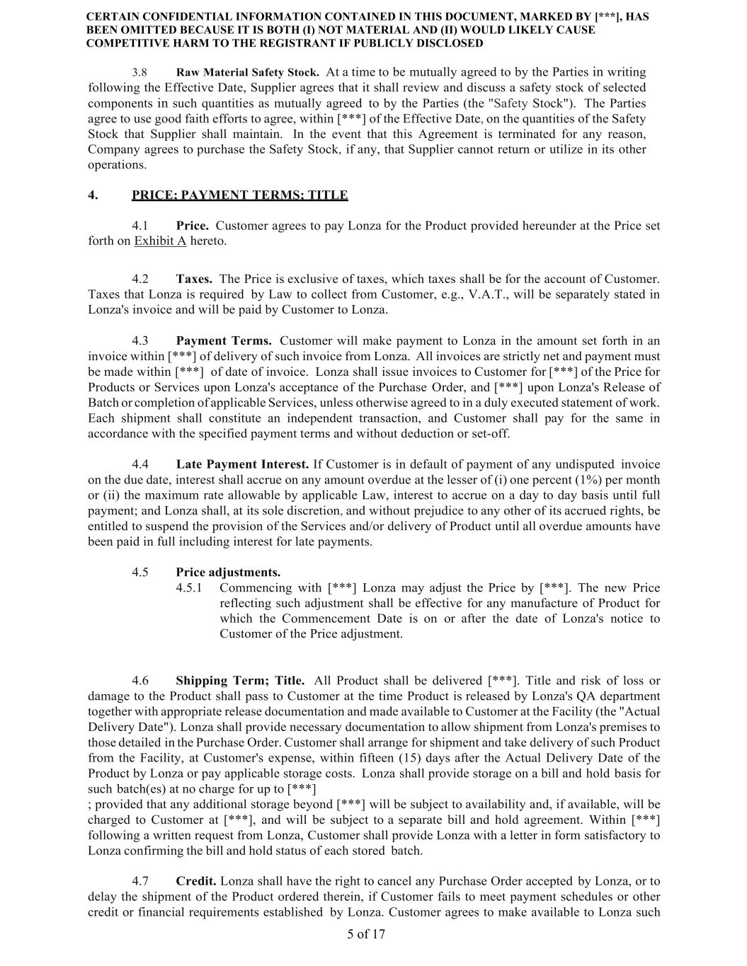 CERTAIN CONFIDENTIAL INFORMATION CONTAINED IN THIS DOCUMENT, MARKED BY [***], HAS BEEN OMITTED BECAUSE IT IS BOTH (I) NOT MATERIAL AND (II) WOULD LIKELY CAUSE COMPETITIVE HARM TO THE REGISTRANT IF PUBLICLY DISCLOSED 5 of 17 3.8 Raw Material Safety Stock. At a time to be mutually agreed to by the Parties in writing following the Effective Date, Supplier agrees that it shall review and discuss a safety stock of selected components in such quantities as mutually agreed to by the Parties (the "Safety Stock"). The Parties agree to use good faith efforts to agree, within [***] of the Effective Date, on the quantities of the Safety Stock that Supplier shall maintain. In the event that this Agreement is terminated for any reason, Company agrees to purchase the Safety Stock, if any, that Supplier cannot return or utilize in its other operations. 4. PRICE; PAYMENT TERMS; TITLE 4.1 Price. Customer agrees to pay Lonza for the Product provided hereunder at the Price set forth on Exhibit A hereto. 4.2 Taxes. The Price is exclusive of taxes, which taxes shall be for the account of Customer. Taxes that Lonza is required by Law to collect from Customer, e.g., V.A.T., will be separately stated in Lonza's invoice and will be paid by Customer to Lonza. 4.3 Payment Terms. Customer will make payment to Lonza in the amount set forth in an invoice within [***] of delivery of such invoice from Lonza. All invoices are strictly net and payment must be made within [***] of date of invoice. Lonza shall issue invoices to Customer for [***] of the Price for Products or Services upon Lonza's acceptance of the Purchase Order, and [***] upon Lonza's Release of Batch or completion of applicable Services, unless otherwise agreed to in a duly executed statement of work. Each shipment shall constitute an independent transaction, and Customer shall pay for the same in accordance with the specified payment terms and without deduction or set-off. 4.4 Late Payment Interest. If Customer is in default of payment of any undisputed invoice on the due date, interest shall accrue on any amount overdue at the lesser of (i) one percent (1%) per month or (ii) the maximum rate allowable by applicable Law, interest to accrue on a day to day basis until full payment; and Lonza shall, at its sole discretion, and without prejudice to any other of its accrued rights, be entitled to suspend the provision of the Services and/or delivery of Product until all overdue amounts have been paid in full including interest for late payments. 4.5 Price adjustments. 4.5.1 Commencing with [***] Lonza may adjust the Price by [***]. The new Price reflecting such adjustment shall be effective for any manufacture of Product for which the Commencement Date is on or after the date of Lonza's notice to Customer of the Price adjustment. 4.6 Shipping Term; Title. All Product shall be delivered [***]. Title and risk of loss or damage to the Product shall pass to Customer at the time Product is released by Lonza's QA department together with appropriate release documentation and made available to Customer at the Facility (the "Actual Delivery Date"). Lonza shall provide necessary documentation to allow shipment from Lonza's premises to those detailed in the Purchase Order. Customer shall arrange for shipment and take delivery of such Product from the Facility, at Customer's expense, within fifteen (15) days after the Actual Delivery Date of the Product by Lonza or pay applicable storage costs. Lonza shall provide storage on a bill and hold basis for such batch(es) at no charge for up to [***] ; provided that any additional storage beyond [***] will be subject to availability and, if available, will be charged to Customer at [***], and will be subject to a separate bill and hold agreement. Within [***] following a written request from Lonza, Customer shall provide Lonza with a letter in form satisfactory to Lonza confirming the bill and hold status of each stored batch. 4.7 Credit. Lonza shall have the right to cancel any Purchase Order accepted by Lonza, or to delay the shipment of the Product ordered therein, if Customer fails to meet payment schedules or other credit or financial requirements established by Lonza. Customer agrees to make available to Lonza such