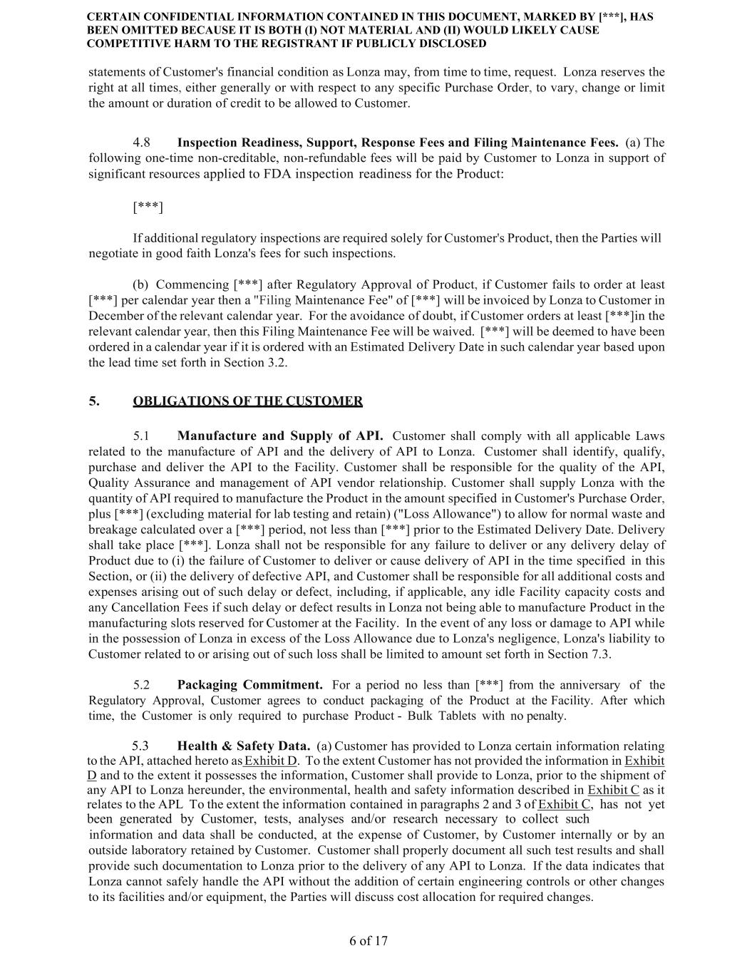 CERTAIN CONFIDENTIAL INFORMATION CONTAINED IN THIS DOCUMENT, MARKED BY [***], HAS BEEN OMITTED BECAUSE IT IS BOTH (I) NOT MATERIAL AND (II) WOULD LIKELY CAUSE COMPETITIVE HARM TO THE REGISTRANT IF PUBLICLY DISCLOSED 6 of 17 statements of Customer's financial condition as Lonza may, from time to time, request. Lonza reserves the right at all times, either generally or with respect to any specific Purchase Order, to vary, change or limit the amount or duration of credit to be allowed to Customer. 4.8 Inspection Readiness, Support, Response Fees and Filing Maintenance Fees. (a) The following one-time non-creditable, non-refundable fees will be paid by Customer to Lonza in support of significant resources applied to FDA inspection readiness for the Product: [***] If additional regulatory inspections are required solely for Customer's Product, then the Parties will negotiate in good faith Lonza's fees for such inspections. (b) Commencing [***] after Regulatory Approval of Product, if Customer fails to order at least [***] per calendar year then a "Filing Maintenance Fee" of [***] will be invoiced by Lonza to Customer in December of the relevant calendar year. For the avoidance of doubt, if Customer orders at least [***]in the relevant calendar year, then this Filing Maintenance Fee will be waived. [***] will be deemed to have been ordered in a calendar year if it is ordered with an Estimated Delivery Date in such calendar year based upon the lead time set forth in Section 3.2. 5. OBLIGATIONS OF THE CUSTOMER 5.1 Manufacture and Supply of API. Customer shall comply with all applicable Laws related to the manufacture of API and the delivery of API to Lonza. Customer shall identify, qualify, purchase and deliver the API to the Facility. Customer shall be responsible for the quality of the API, Quality Assurance and management of API vendor relationship. Customer shall supply Lonza with the quantity of API required to manufacture the Product in the amount specified in Customer's Purchase Order, plus [***] (excluding material for lab testing and retain) ("Loss Allowance") to allow for normal waste and breakage calculated over a [***] period, not less than [***] prior to the Estimated Delivery Date. Delivery shall take place [***]. Lonza shall not be responsible for any failure to deliver or any delivery delay of Product due to (i) the failure of Customer to deliver or cause delivery of API in the time specified in this Section, or (ii) the delivery of defective API, and Customer shall be responsible for all additional costs and expenses arising out of such delay or defect, including, if applicable, any idle Facility capacity costs and any Cancellation Fees if such delay or defect results in Lonza not being able to manufacture Product in the manufacturing slots reserved for Customer at the Facility. In the event of any loss or damage to API while in the possession of Lonza in excess of the Loss Allowance due to Lonza's negligence, Lonza's liability to Customer related to or arising out of such loss shall be limited to amount set forth in Section 7.3. 5.2 Packaging Commitment. For a period no less than [***] from the anniversary of the Regulatory Approval, Customer agrees to conduct packaging of the Product at the Facility. After which time, the Customer is only required to purchase Product - Bulk Tablets with no penalty. 5.3 Health & Safety Data. (a) Customer has provided to Lonza certain information relating to the API, attached hereto as Exhibit D. To the extent Customer has not provided the information in Exhibit D and to the extent it possesses the information, Customer shall provide to Lonza, prior to the shipment of any API to Lonza hereunder, the environmental, health and safety information described in Exhibit C as it relates to the APL To the extent the information contained in paragraphs 2 and 3 of Exhibit C, has not yet been generated by Customer, tests, analyses and/or research necessary to collect such information and data shall be conducted, at the expense of Customer, by Customer internally or by an outside laboratory retained by Customer. Customer shall properly document all such test results and shall provide such documentation to Lonza prior to the delivery of any API to Lonza. If the data indicates that Lonza cannot safely handle the API without the addition of certain engineering controls or other changes to its facilities and/or equipment, the Parties will discuss cost allocation for required changes.
