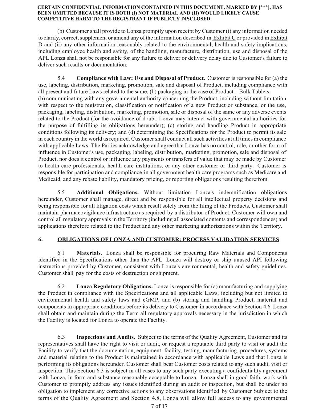 CERTAIN CONFIDENTIAL INFORMATION CONTAINED IN THIS DOCUMENT, MARKED BY [***], HAS BEEN OMITTED BECAUSE IT IS BOTH (I) NOT MATERIAL AND (II) WOULD LIKELY CAUSE COMPETITIVE HARM TO THE REGISTRANT IF PUBLICLY DISCLOSED 7 of 17 (b) Customer shall provide to Lonza promptly upon receipt by Customer (i) any information needed to clarify, correct, supplement or amend any of the information described in Exhibit C or provided in Exhibit D and (ii) any other information reasonably related to the environmental, health and safety implications, including employee health and safety, of the handling, manufacture, distribution, use and disposal of the APL Lonza shall not be responsible for any failure to deliver or delivery delay due to Customer's failure to deliver such results or documentation. 5.4 Compliance with Law; Use and Disposal of Product. Customer is responsible for (a) the use, labeling, distribution, marketing, promotion, sale and disposal of Product, including compliance with all present and future Laws related to the same; (b) packaging in the case of Product - Bulk Tablets, (b) communicating with any governmental authority concerning the Product, including without limitation with respect to the registration, classification or notification of a new Product or substance, or the use, packaging, labeling, distribution, marketing, promotion, sale or disposal of the same or any adverse events related to the Product (for the avoidance of doubt, Lonza may interact with governmental authorities for the purpose of fulfilling its obligations hereunder); (c) storing and handling Product in appropriate conditions following its delivery; and (d) determining the Specifications for the Product to permit its sale in each country in the world as required. Customer shall conduct all such activities at all times in compliance with applicable Laws. The Parties acknowledge and agree that Lonza has no control, role, or other form of influence in Customer's use, packaging, labeling, distribution, marketing, promotion, sale and disposal of Product, nor does it control or influence any payments or transfers of value that may be made by Customer to health care professionals, health care institutions, or any other customer or third party. Customer is responsible for participation and compliance in all government health care programs such as Medicare and Medicaid, and any rebate liability, mandatory pricing, or reporting obligations resulting therefrom. 5.5 Additional Obligations. Without limitation Lonza's indemnification obligations hereunder, Customer shall manage, direct and be responsible for all intellectual property decisions and being responsible for all litigation costs which result solely from the filing of the Products. Customer shall maintain pharmacovigilance infrastructure as required by a distributor of Product. Customer will own and control all regulatory approvals in the Territory (including all associated contents and correspondences) and applications therefore related to the Product and any other marketing authorizations within the Territory. 6. OBLIGATIONS OF LONZA AND CUSTOMER; PROCESS VALIDATION SERVICES 6.1 Materials. Lonza shall be responsible for procuring Raw Materials and Components identified in the Specifications other than the APL Lonza will destroy or ship unused API following instructions provided by Customer, consistent with Lonza's environmental, health and safety guidelines. Customer shall pay for the costs of destruction or shipment. 6.2 Lonza Regulatory Obligations. Lonza is responsible for (a) manufacturing and supplying the Product in compliance with the Specifications and all applicable Laws, including but not limited to environmental health and safety laws and cGMP, and (b) storing and handling Product, material and components in appropriate conditions before its delivery to Customer in accordance with Section 4.6. Lonza shall obtain and maintain during the Term all regulatory approvals necessary in the jurisdiction in which the Facility is located for Lonza to operate the Facility. 6.3 Inspections and Audits. Subject to the terms of the Quality Agreement, Customer and its representatives shall have the right to visit or audit, or request a reputable third party to visit or audit the Facility to verify that the documentation, equipment, facility, testing, manufacturing, procedures, systems and material relating to the Product is maintained in accordance with applicable Laws and that Lonza is performing its obligations hereunder. Customer shall bear Customer costs related to any such audit, visit or inspection. This Section 6.3 is subject in all cases to any such party executing a confidentiality agreement with Lonza, in form and substance reasonably acceptable to Lonza. Lonza shall in good faith, work with Customer to promptly address any issues identified during an audit or inspection, but shall be under no obligation to implement any corrective actions to any observations identified by Customer Subject to the terms of the Quality Agreement and Section 4.8, Lonza will allow full access to any governmental