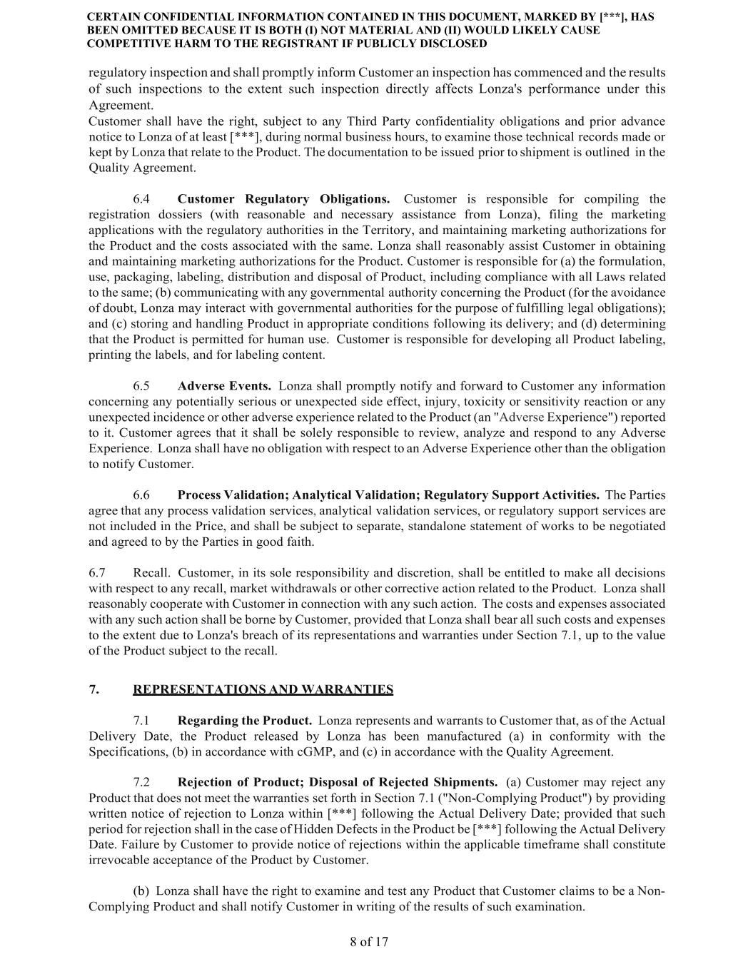 CERTAIN CONFIDENTIAL INFORMATION CONTAINED IN THIS DOCUMENT, MARKED BY [***], HAS BEEN OMITTED BECAUSE IT IS BOTH (I) NOT MATERIAL AND (II) WOULD LIKELY CAUSE COMPETITIVE HARM TO THE REGISTRANT IF PUBLICLY DISCLOSED 8 of 17 regulatory inspection and shall promptly inform Customer an inspection has commenced and the results of such inspections to the extent such inspection directly affects Lonza's performance under this Agreement. Customer shall have the right, subject to any Third Party confidentiality obligations and prior advance notice to Lonza of at least [***], during normal business hours, to examine those technical records made or kept by Lonza that relate to the Product. The documentation to be issued prior to shipment is outlined in the Quality Agreement. 6.4 Customer Regulatory Obligations. Customer is responsible for compiling the registration dossiers (with reasonable and necessary assistance from Lonza), filing the marketing applications with the regulatory authorities in the Territory, and maintaining marketing authorizations for the Product and the costs associated with the same. Lonza shall reasonably assist Customer in obtaining and maintaining marketing authorizations for the Product. Customer is responsible for (a) the formulation, use, packaging, labeling, distribution and disposal of Product, including compliance with all Laws related to the same; (b) communicating with any governmental authority concerning the Product (for the avoidance of doubt, Lonza may interact with governmental authorities for the purpose of fulfilling legal obligations); and (c) storing and handling Product in appropriate conditions following its delivery; and (d) determining that the Product is permitted for human use. Customer is responsible for developing all Product labeling, printing the labels, and for labeling content. 6.5 Adverse Events. Lonza shall promptly notify and forward to Customer any information concerning any potentially serious or unexpected side effect, injury, toxicity or sensitivity reaction or any unexpected incidence or other adverse experience related to the Product (an "Adverse Experience") reported to it. Customer agrees that it shall be solely responsible to review, analyze and respond to any Adverse Experience. Lonza shall have no obligation with respect to an Adverse Experience other than the obligation to notify Customer. 6.6 Process Validation; Analytical Validation; Regulatory Support Activities. The Parties agree that any process validation services, analytical validation services, or regulatory support services are not included in the Price, and shall be subject to separate, standalone statement of works to be negotiated and agreed to by the Parties in good faith. 6.7 Recall. Customer, in its sole responsibility and discretion, shall be entitled to make all decisions with respect to any recall, market withdrawals or other corrective action related to the Product. Lonza shall reasonably cooperate with Customer in connection with any such action. The costs and expenses associated with any such action shall be borne by Customer, provided that Lonza shall bear all such costs and expenses to the extent due to Lonza's breach of its representations and warranties under Section 7.1, up to the value of the Product subject to the recall. 7. REPRESENTATIONS AND WARRANTIES 7.1 Regarding the Product. Lonza represents and warrants to Customer that, as of the Actual Delivery Date, the Product released by Lonza has been manufactured (a) in conformity with the Specifications, (b) in accordance with cGMP, and (c) in accordance with the Quality Agreement. 7.2 Rejection of Product; Disposal of Rejected Shipments. (a) Customer may reject any Product that does not meet the warranties set forth in Section 7.1 ("Non-Complying Product") by providing written notice of rejection to Lonza within [***] following the Actual Delivery Date; provided that such period for rejection shall in the case of Hidden Defects in the Product be [***] following the Actual Delivery Date. Failure by Customer to provide notice of rejections within the applicable timeframe shall constitute irrevocable acceptance of the Product by Customer. (b) Lonza shall have the right to examine and test any Product that Customer claims to be a Non- Complying Product and shall notify Customer in writing of the results of such examination.