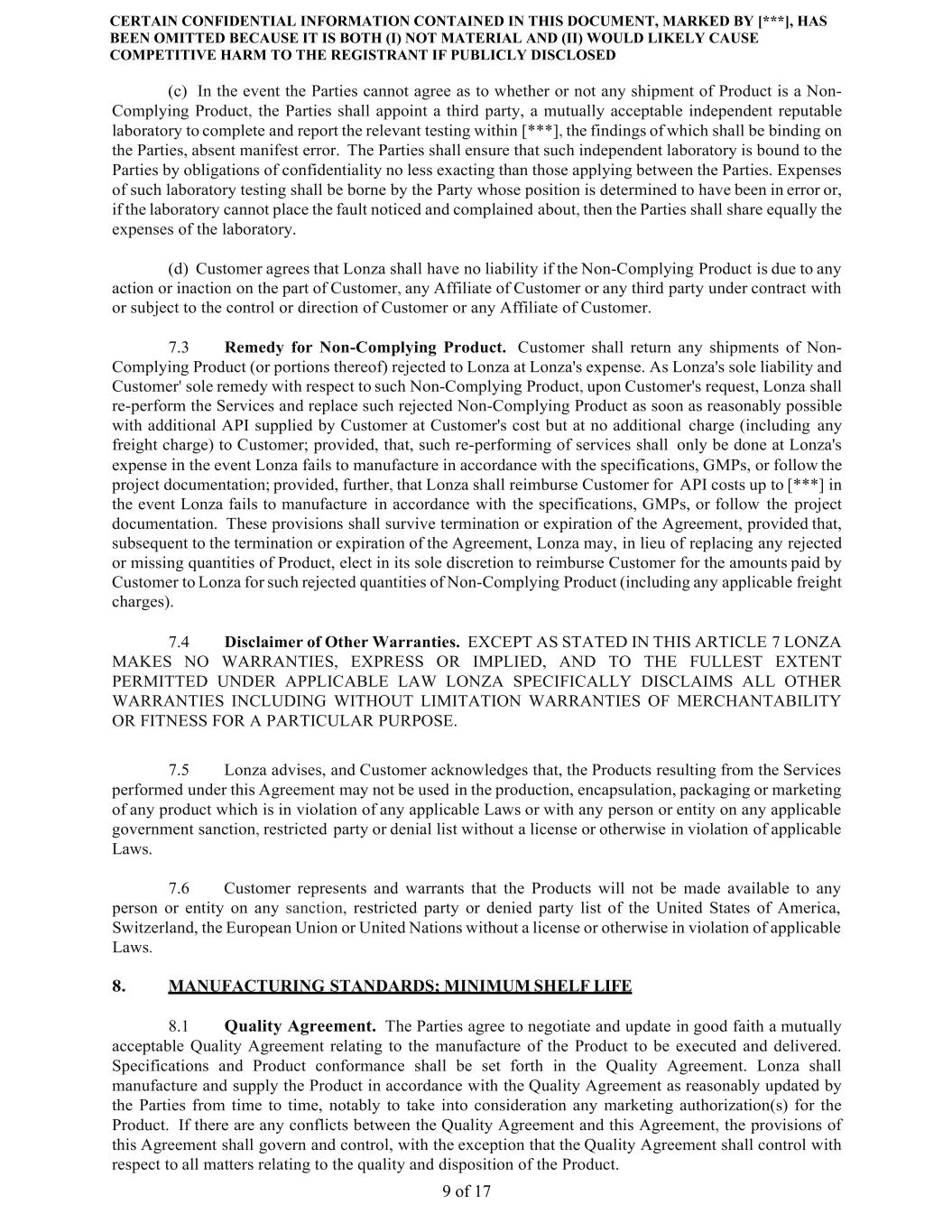 CERTAIN CONFIDENTIAL INFORMATION CONTAINED IN THIS DOCUMENT, MARKED BY [***], HAS BEEN OMITTED BECAUSE IT IS BOTH (I) NOT MATERIAL AND (II) WOULD LIKELY CAUSE COMPETITIVE HARM TO THE REGISTRANT IF PUBLICLY DISCLOSED 9 of 17 (c) In the event the Parties cannot agree as to whether or not any shipment of Product is a Non- Complying Product, the Parties shall appoint a third party, a mutually acceptable independent reputable laboratory to complete and report the relevant testing within [***], the findings of which shall be binding on the Parties, absent manifest error. The Parties shall ensure that such independent laboratory is bound to the Parties by obligations of confidentiality no less exacting than those applying between the Parties. Expenses of such laboratory testing shall be borne by the Party whose position is determined to have been in error or, if the laboratory cannot place the fault noticed and complained about, then the Parties shall share equally the expenses of the laboratory. (d) Customer agrees that Lonza shall have no liability if the Non-Complying Product is due to any action or inaction on the part of Customer, any Affiliate of Customer or any third party under contract with or subject to the control or direction of Customer or any Affiliate of Customer. 7.3 Remedy for Non-Complying Product. Customer shall return any shipments of Non- Complying Product (or portions thereof) rejected to Lonza at Lonza's expense. As Lonza's sole liability and Customer' sole remedy with respect to such Non-Complying Product, upon Customer's request, Lonza shall re-perform the Services and replace such rejected Non-Complying Product as soon as reasonably possible with additional API supplied by Customer at Customer's cost but at no additional charge (including any freight charge) to Customer; provided, that, such re-performing of services shall only be done at Lonza's expense in the event Lonza fails to manufacture in accordance with the specifications, GMPs, or follow the project documentation; provided, further, that Lonza shall reimburse Customer for API costs up to [***] in the event Lonza fails to manufacture in accordance with the specifications, GMPs, or follow the project documentation. These provisions shall survive termination or expiration of the Agreement, provided that, subsequent to the termination or expiration of the Agreement, Lonza may, in lieu of replacing any rejected or missing quantities of Product, elect in its sole discretion to reimburse Customer for the amounts paid by Customer to Lonza for such rejected quantities of Non-Complying Product (including any applicable freight charges). 7.4 Disclaimer of Other Warranties. EXCEPT AS STATED IN THIS ARTICLE 7 LONZA MAKES NO WARRANTIES, EXPRESS OR IMPLIED, AND TO THE FULLEST EXTENT PERMITTED UNDER APPLICABLE LAW LONZA SPECIFICALLY DISCLAIMS ALL OTHER WARRANTIES INCLUDING WITHOUT LIMITATION WARRANTIES OF MERCHANTABILITY OR FITNESS FOR A PARTICULAR PURPOSE. 7.5 Lonza advises, and Customer acknowledges that, the Products resulting from the Services performed under this Agreement may not be used in the production, encapsulation, packaging or marketing of any product which is in violation of any applicable Laws or with any person or entity on any applicable government sanction, restricted party or denial list without a license or otherwise in violation of applicable Laws. 7.6 Customer represents and warrants that the Products will not be made available to any person or entity on any sanction, restricted party or denied party list of the United States of America, Switzerland, the European Union or United Nations without a license or otherwise in violation of applicable Laws. 8. MANUFACTURING STANDARDS; MINIMUM SHELF LIFE 8.1 Quality Agreement. The Parties agree to negotiate and update in good faith a mutually acceptable Quality Agreement relating to the manufacture of the Product to be executed and delivered. Specifications and Product conformance shall be set forth in the Quality Agreement. Lonza shall manufacture and supply the Product in accordance with the Quality Agreement as reasonably updated by the Parties from time to time, notably to take into consideration any marketing authorization(s) for the Product. If there are any conflicts between the Quality Agreement and this Agreement, the provisions of this Agreement shall govern and control, with the exception that the Quality Agreement shall control with respect to all matters relating to the quality and disposition of the Product.