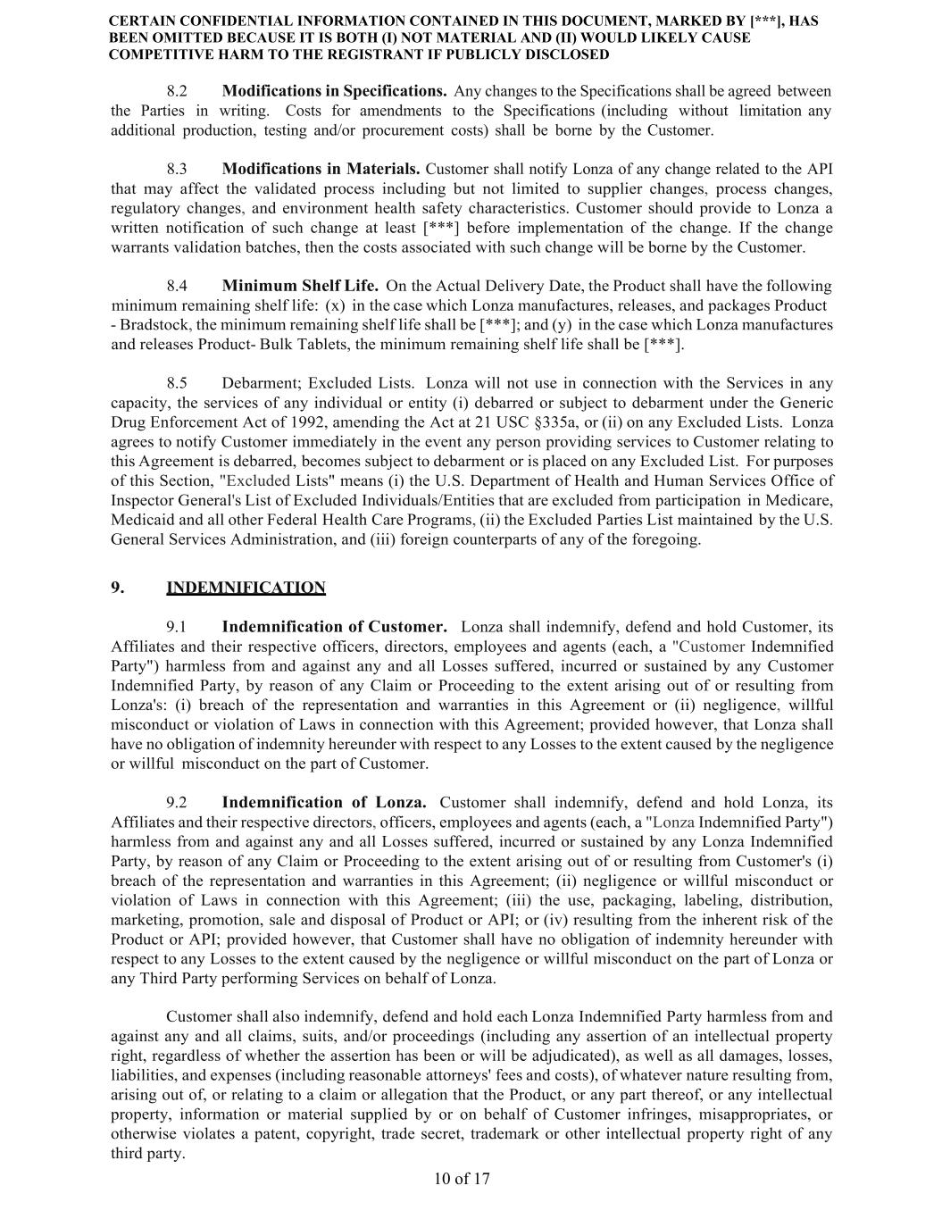 CERTAIN CONFIDENTIAL INFORMATION CONTAINED IN THIS DOCUMENT, MARKED BY [***], HAS BEEN OMITTED BECAUSE IT IS BOTH (I) NOT MATERIAL AND (II) WOULD LIKELY CAUSE COMPETITIVE HARM TO THE REGISTRANT IF PUBLICLY DISCLOSED 10 of 17 8.2 Modifications in Specifications. Any changes to the Specifications shall be agreed between the Parties in writing. Costs for amendments to the Specifications (including without limitation any additional production, testing and/or procurement costs) shall be borne by the Customer. 8.3 Modifications in Materials. Customer shall notify Lonza of any change related to the API that may affect the validated process including but not limited to supplier changes, process changes, regulatory changes, and environment health safety characteristics. Customer should provide to Lonza a written notification of such change at least [***] before implementation of the change. If the change warrants validation batches, then the costs associated with such change will be borne by the Customer. 8.4 Minimum Shelf Life. On the Actual Delivery Date, the Product shall have the following minimum remaining shelf life: (x) in the case which Lonza manufactures, releases, and packages Product - Bradstock, the minimum remaining shelf life shall be [***]; and (y) in the case which Lonza manufactures and releases Product- Bulk Tablets, the minimum remaining shelf life shall be [***]. 8.5 Debarment; Excluded Lists. Lonza will not use in connection with the Services in any capacity, the services of any individual or entity (i) debarred or subject to debarment under the Generic Drug Enforcement Act of 1992, amending the Act at 21 USC §335a, or (ii) on any Excluded Lists. Lonza agrees to notify Customer immediately in the event any person providing services to Customer relating to this Agreement is debarred, becomes subject to debarment or is placed on any Excluded List. For purposes of this Section, "Excluded Lists" means (i) the U.S. Department of Health and Human Services Office of Inspector General's List of Excluded Individuals/Entities that are excluded from participation in Medicare, Medicaid and all other Federal Health Care Programs, (ii) the Excluded Parties List maintained by the U.S. General Services Administration, and (iii) foreign counterparts of any of the foregoing. 9. INDEMNIFICATION 9.1 Indemnification of Customer. Lonza shall indemnify, defend and hold Customer, its Affiliates and their respective officers, directors, employees and agents (each, a "Customer Indemnified Party") harmless from and against any and all Losses suffered, incurred or sustained by any Customer Indemnified Party, by reason of any Claim or Proceeding to the extent arising out of or resulting from Lonza's: (i) breach of the representation and warranties in this Agreement or (ii) negligence, willful misconduct or violation of Laws in connection with this Agreement; provided however, that Lonza shall have no obligation of indemnity hereunder with respect to any Losses to the extent caused by the negligence or willful misconduct on the part of Customer. 9.2 Indemnification of Lonza. Customer shall indemnify, defend and hold Lonza, its Affiliates and their respective directors, officers, employees and agents (each, a "Lonza Indemnified Party") harmless from and against any and all Losses suffered, incurred or sustained by any Lonza Indemnified Party, by reason of any Claim or Proceeding to the extent arising out of or resulting from Customer's (i) breach of the representation and warranties in this Agreement; (ii) negligence or willful misconduct or violation of Laws in connection with this Agreement; (iii) the use, packaging, labeling, distribution, marketing, promotion, sale and disposal of Product or API; or (iv) resulting from the inherent risk of the Product or API; provided however, that Customer shall have no obligation of indemnity hereunder with respect to any Losses to the extent caused by the negligence or willful misconduct on the part of Lonza or any Third Party performing Services on behalf of Lonza. Customer shall also indemnify, defend and hold each Lonza Indemnified Party harmless from and against any and all claims, suits, and/or proceedings (including any assertion of an intellectual property right, regardless of whether the assertion has been or will be adjudicated), as well as all damages, losses, liabilities, and expenses (including reasonable attorneys' fees and costs), of whatever nature resulting from, arising out of, or relating to a claim or allegation that the Product, or any part thereof, or any intellectual property, information or material supplied by or on behalf of Customer infringes, misappropriates, or otherwise violates a patent, copyright, trade secret, trademark or other intellectual property right of any third party.