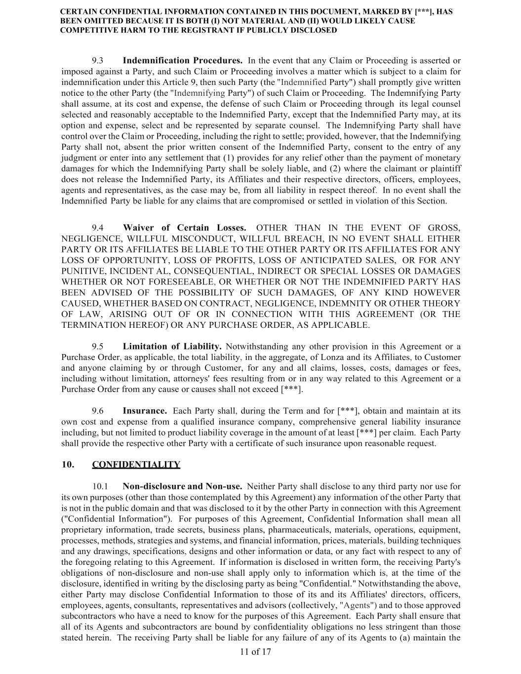 CERTAIN CONFIDENTIAL INFORMATION CONTAINED IN THIS DOCUMENT, MARKED BY [***], HAS BEEN OMITTED BECAUSE IT IS BOTH (I) NOT MATERIAL AND (II) WOULD LIKELY CAUSE COMPETITIVE HARM TO THE REGISTRANT IF PUBLICLY DISCLOSED 11 of 17 9.3 Indemnification Procedures. In the event that any Claim or Proceeding is asserted or imposed against a Party, and such Claim or Proceeding involves a matter which is subject to a claim for indemnification under this Article 9, then such Party (the "Indemnified Party") shall promptly give written notice to the other Party (the "Indemnifying Party") of such Claim or Proceeding. The Indemnifying Party shall assume, at its cost and expense, the defense of such Claim or Proceeding through its legal counsel selected and reasonably acceptable to the Indemnified Party, except that the Indemnified Party may, at its option and expense, select and be represented by separate counsel. The Indemnifying Party shall have control over the Claim or Proceeding, including the right to settle; provided, however, that the Indemnifying Party shall not, absent the prior written consent of the Indemnified Party, consent to the entry of any judgment or enter into any settlement that (1) provides for any relief other than the payment of monetary damages for which the Indemnifying Party shall be solely liable, and (2) where the claimant or plaintiff does not release the Indemnified Party, its Affiliates and their respective directors, officers, employees, agents and representatives, as the case may be, from all liability in respect thereof. In no event shall the Indemnified Party be liable for any claims that are compromised or settled in violation of this Section. 9.4 Waiver of Certain Losses. OTHER THAN IN THE EVENT OF GROSS, NEGLIGENCE, WILLFUL MISCONDUCT, WILLFUL BREACH, IN NO EVENT SHALL EITHER PARTY OR ITS AFFILIATES BE LIABLE TO THE OTHER PARTY OR ITS AFFILIATES FOR ANY LOSS OF OPPORTUNITY, LOSS OF PROFITS, LOSS OF ANTICIPATED SALES, OR FOR ANY PUNITIVE, INCIDENT AL, CONSEQUENTIAL, INDIRECT OR SPECIAL LOSSES OR DAMAGES WHETHER OR NOT FORESEEABLE, OR WHETHER OR NOT THE INDEMNIFIED PARTY HAS BEEN ADVISED OF THE POSSIBILITY OF SUCH DAMAGES, OF ANY KIND HOWEVER CAUSED, WHETHER BASED ON CONTRACT, NEGLIGENCE, INDEMNITY OR OTHER THEORY OF LAW, ARISING OUT OF OR IN CONNECTION WITH THIS AGREEMENT (OR THE TERMINATION HEREOF) OR ANY PURCHASE ORDER, AS APPLICABLE. 9.5 Limitation of Liability. Notwithstanding any other provision in this Agreement or a Purchase Order, as applicable, the total liability, in the aggregate, of Lonza and its Affiliates, to Customer and anyone claiming by or through Customer, for any and all claims, losses, costs, damages or fees, including without limitation, attorneys' fees resulting from or in any way related to this Agreement or a Purchase Order from any cause or causes shall not exceed [***]. 9.6 Insurance. Each Party shall, during the Term and for [***], obtain and maintain at its own cost and expense from a qualified insurance company, comprehensive general liability insurance including, but not limited to product liability coverage in the amount of at least [***] per claim. Each Party shall provide the respective other Party with a certificate of such insurance upon reasonable request. 10. CONFIDENTIALITY 10.1 Non-disclosure and Non-use. Neither Party shall disclose to any third party nor use for its own purposes (other than those contemplated by this Agreement) any information of the other Party that is not in the public domain and that was disclosed to it by the other Party in connection with this Agreement ("Confidential Information"). For purposes of this Agreement, Confidential Information shall mean all proprietary information, trade secrets, business plans, pharmaceuticals, materials, operations, equipment, processes, methods, strategies and systems, and financial information, prices, materials, building techniques and any drawings, specifications, designs and other information or data, or any fact with respect to any of the foregoing relating to this Agreement. If information is disclosed in written form, the receiving Party's obligations of non-disclosure and non-use shall apply only to information which is, at the time of the disclosure, identified in writing by the disclosing party as being "Confidential." Notwithstanding the above, either Party may disclose Confidential Information to those of its and its Affiliates' directors, officers, employees, agents, consultants, representatives and advisors (collectively, "Agents") and to those approved subcontractors who have a need to know for the purposes of this Agreement. Each Party shall ensure that all of its Agents and subcontractors are bound by confidentiality obligations no less stringent than those stated herein. The receiving Party shall be liable for any failure of any of its Agents to (a) maintain the