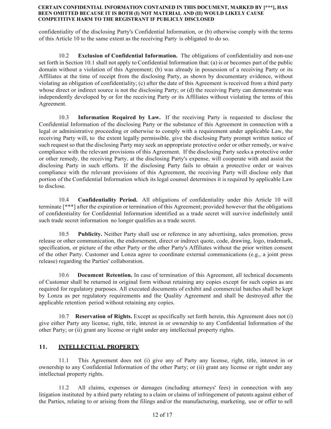 CERTAIN CONFIDENTIAL INFORMATION CONTAINED IN THIS DOCUMENT, MARKED BY [***], HAS BEEN OMITTED BECAUSE IT IS BOTH (I) NOT MATERIAL AND (II) WOULD LIKELY CAUSE COMPETITIVE HARM TO THE REGISTRANT IF PUBLICLY DISCLOSED 12 of 17 confidentiality of the disclosing Party's Confidential Information, or (b) otherwise comply with the terms of this Article 10 to the same extent as the receiving Party is obligated to do so. 10.2 Exclusion of Confidential Information. The obligations of confidentiality and non-use set forth in Section 10.1 shall not apply to Confidential Information that: (a) is or becomes part of the public domain without a violation of this Agreement; (b) was already in possession of a receiving Party or its Affiliates at the time of receipt from the disclosing Party, as shown by documentary evidence, without violating an obligation of confidentiality; (c) after the date of this Agreement is received from a third party whose direct or indirect source is not the disclosing Party; or (d) the receiving Party can demonstrate was independently developed by or for the receiving Party or its Affiliates without violating the terms of this Agreement. 10.3 Information Required by Law. If the receiving Party is requested to disclose the Confidential Information of the disclosing Party or the substance of this Agreement in connection with a legal or administrative proceeding or otherwise to comply with a requirement under applicable Law, the receiving Party will, to the extent legally permissible, give the disclosing Party prompt written notice of such request so that the disclosing Party may seek an appropriate protective order or other remedy, or waive compliance with the relevant provisions of this Agreement. If the disclosing Party seeks a protective order or other remedy, the receiving Party, at the disclosing Party's expense, will cooperate with and assist the disclosing Party in such efforts. If the disclosing Party fails to obtain a protective order or waives compliance with the relevant provisions of this Agreement, the receiving Party will disclose only that portion of the Confidential Information which its legal counsel determines it is required by applicable Law to disclose. 10.4 Confidentiality Period. All obligations of confidentiality under this Article 10 will terminate [***] after the expiration or termination of this Agreement; provided however that the obligations of confidentiality for Confidential Information identified as a trade secret will survive indefinitely until such trade secret information no longer qualifies as a trade secret. 10.5 Publicity. Neither Party shall use or reference in any advertising, sales promotion, press release or other communication, the endorsement, direct or indirect quote, code, drawing, logo, trademark, specification, or picture of the other Party or the other Party's Affiliates without the prior written consent of the other Party. Customer and Lonza agree to coordinate external communications (e.g., a joint press release) regarding the Parties' collaboration. 10.6 Document Retention. In case of termination of this Agreement, all technical documents of Customer shall be returned in original form without retaining any copies except for such copies as are required for regulatory purposes. All executed documents of exhibit and commercial batches shall be kept by Lonza as per regulatory requirements and the Quality Agreement and shall be destroyed after the applicable retention period without retaining any copies. 10.7 Reservation of Rights. Except as specifically set forth herein, this Agreement does not (i) give either Party any license, right, title, interest in or ownership to any Confidential Information of the other Party; or (ii) grant any license or right under any intellectual property rights. 11. INTELLECTUAL PROPERTY 11.1 This Agreement does not (i) give any of Party any license, right, title, interest in or ownership to any Confidential Information of the other Party; or (ii) grant any license or right under any intellectual property rights. 11.2 All claims, expenses or damages (including attorneys' fees) in connection with any litigation instituted by a third party relating to a claim or claims of infringement of patents against either of the Parties, relating to or arising from the filings and/or the manufacturing, marketing, use or offer to sell
