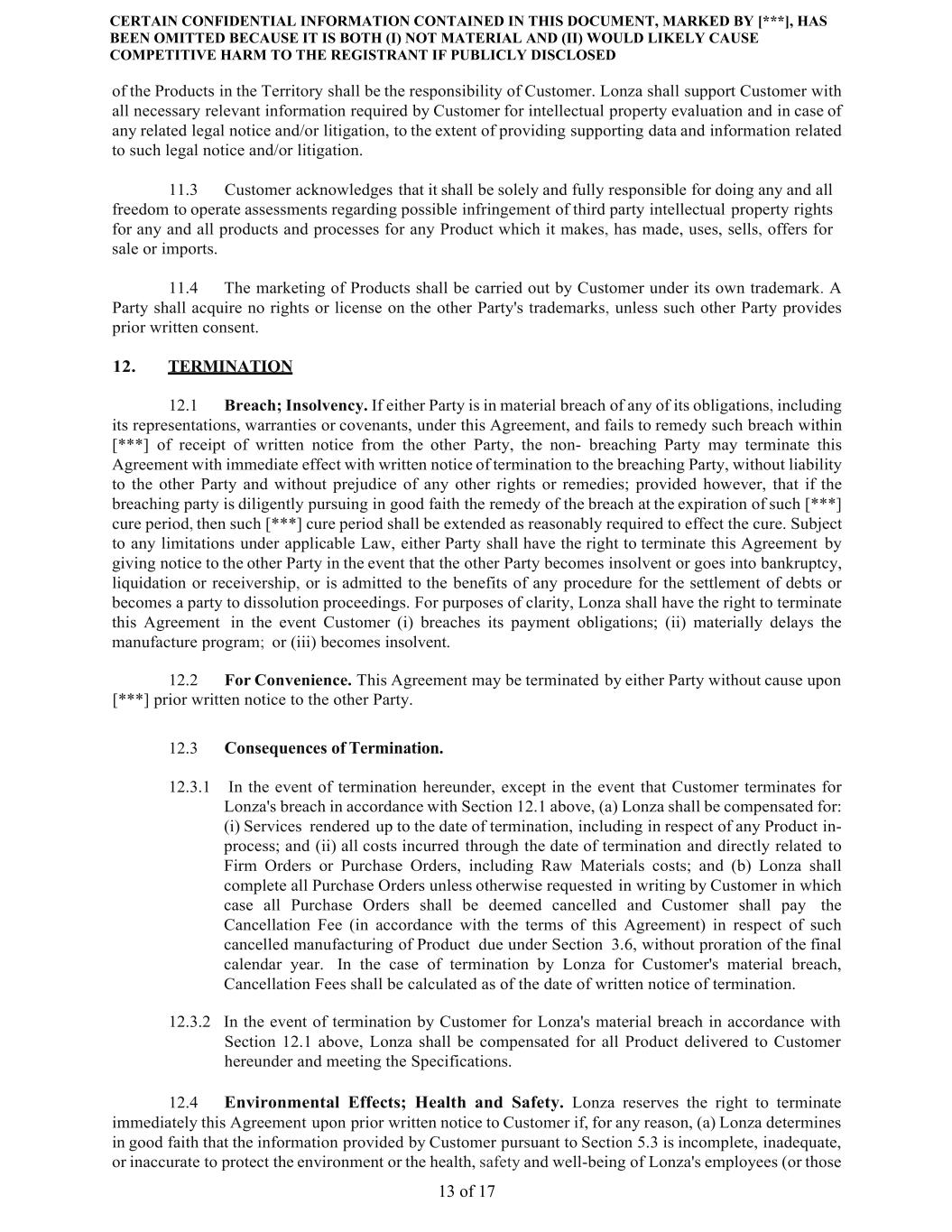 CERTAIN CONFIDENTIAL INFORMATION CONTAINED IN THIS DOCUMENT, MARKED BY [***], HAS BEEN OMITTED BECAUSE IT IS BOTH (I) NOT MATERIAL AND (II) WOULD LIKELY CAUSE COMPETITIVE HARM TO THE REGISTRANT IF PUBLICLY DISCLOSED 13 of 17 of the Products in the Territory shall be the responsibility of Customer. Lonza shall support Customer with all necessary relevant information required by Customer for intellectual property evaluation and in case of any related legal notice and/or litigation, to the extent of providing supporting data and information related to such legal notice and/or litigation. 11.3 Customer acknowledges that it shall be solely and fully responsible for doing any and all freedom to operate assessments regarding possible infringement of third party intellectual property rights for any and all products and processes for any Product which it makes, has made, uses, sells, offers for sale or imports. 11.4 The marketing of Products shall be carried out by Customer under its own trademark. A Party shall acquire no rights or license on the other Party's trademarks, unless such other Party provides prior written consent. 12. TERMINATION 12.1 Breach; Insolvency. If either Party is in material breach of any of its obligations, including its representations, warranties or covenants, under this Agreement, and fails to remedy such breach within [***] of receipt of written notice from the other Party, the non- breaching Party may terminate this Agreement with immediate effect with written notice of termination to the breaching Party, without liability to the other Party and without prejudice of any other rights or remedies; provided however, that if the breaching party is diligently pursuing in good faith the remedy of the breach at the expiration of such [***] cure period, then such [***] cure period shall be extended as reasonably required to effect the cure. Subject to any limitations under applicable Law, either Party shall have the right to terminate this Agreement by giving notice to the other Party in the event that the other Party becomes insolvent or goes into bankruptcy, liquidation or receivership, or is admitted to the benefits of any procedure for the settlement of debts or becomes a party to dissolution proceedings. For purposes of clarity, Lonza shall have the right to terminate this Agreement in the event Customer (i) breaches its payment obligations; (ii) materially delays the manufacture program; or (iii) becomes insolvent. 12.2 For Convenience. This Agreement may be terminated by either Party without cause upon [***] prior written notice to the other Party. 12.3 Consequences of Termination. 12.3.1 In the event of termination hereunder, except in the event that Customer terminates for Lonza's breach in accordance with Section 12.1 above, (a) Lonza shall be compensated for: (i) Services rendered up to the date of termination, including in respect of any Product in- process; and (ii) all costs incurred through the date of termination and directly related to Firm Orders or Purchase Orders, including Raw Materials costs; and (b) Lonza shall complete all Purchase Orders unless otherwise requested in writing by Customer in which case all Purchase Orders shall be deemed cancelled and Customer shall pay the Cancellation Fee (in accordance with the terms of this Agreement) in respect of such cancelled manufacturing of Product due under Section 3.6, without proration of the final calendar year. In the case of termination by Lonza for Customer's material breach, Cancellation Fees shall be calculated as of the date of written notice of termination. 12.3.2 In the event of termination by Customer for Lonza's material breach in accordance with Section 12.1 above, Lonza shall be compensated for all Product delivered to Customer hereunder and meeting the Specifications. 12.4 Environmental Effects; Health and Safety. Lonza reserves the right to terminate immediately this Agreement upon prior written notice to Customer if, for any reason, (a) Lonza determines in good faith that the information provided by Customer pursuant to Section 5.3 is incomplete, inadequate, or inaccurate to protect the environment or the health, safety and well-being of Lonza's employees (or those