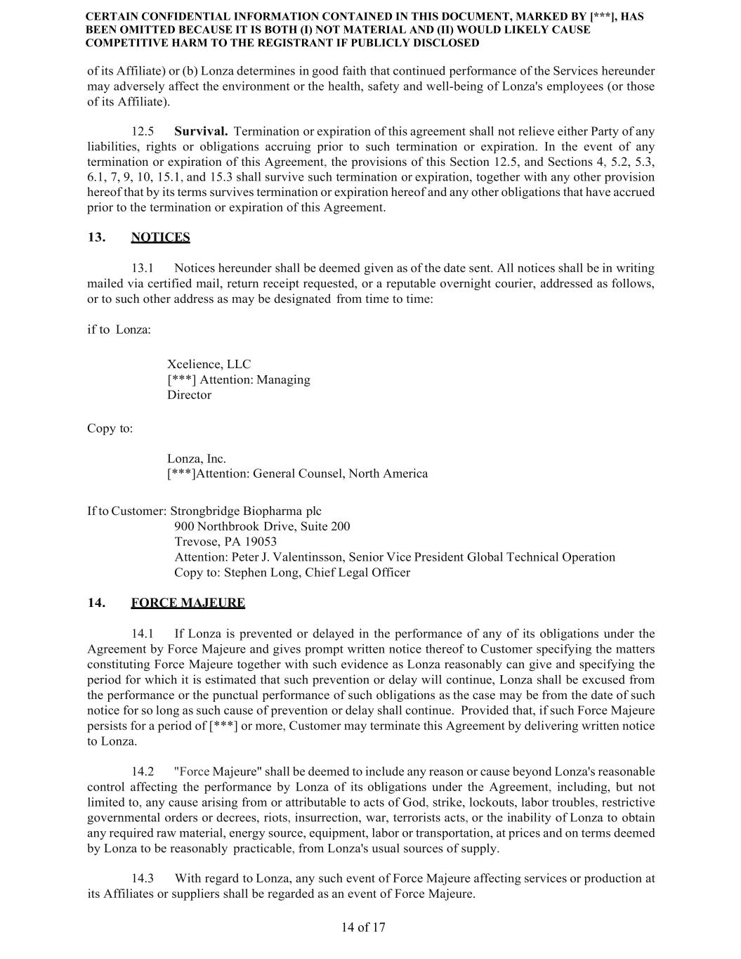 CERTAIN CONFIDENTIAL INFORMATION CONTAINED IN THIS DOCUMENT, MARKED BY [***], HAS BEEN OMITTED BECAUSE IT IS BOTH (I) NOT MATERIAL AND (II) WOULD LIKELY CAUSE COMPETITIVE HARM TO THE REGISTRANT IF PUBLICLY DISCLOSED 14 of 17 of its Affiliate) or (b) Lonza determines in good faith that continued performance of the Services hereunder may adversely affect the environment or the health, safety and well-being of Lonza's employees (or those of its Affiliate). 12.5 Survival. Termination or expiration of this agreement shall not relieve either Party of any liabilities, rights or obligations accruing prior to such termination or expiration. In the event of any termination or expiration of this Agreement, the provisions of this Section 12.5, and Sections 4, 5.2, 5.3, 6.1, 7, 9, 10, 15.1, and 15.3 shall survive such termination or expiration, together with any other provision hereof that by its terms survives termination or expiration hereof and any other obligations that have accrued prior to the termination or expiration of this Agreement. 13. NOTICES 13.1 Notices hereunder shall be deemed given as of the date sent. All notices shall be in writing mailed via certified mail, return receipt requested, or a reputable overnight courier, addressed as follows, or to such other address as may be designated from time to time: if to Lonza: Xcelience, LLC [***] Attention: Managing Director Copy to: Lonza, Inc. [***]Attention: General Counsel, North America If to Customer: Strongbridge Biopharma plc 900 Northbrook Drive, Suite 200 Trevose, PA 19053 Attention: Peter J. Valentinsson, Senior Vice President Global Technical Operation Copy to: Stephen Long, Chief Legal Officer 14. FORCE MAJEURE 14.1 If Lonza is prevented or delayed in the performance of any of its obligations under the Agreement by Force Majeure and gives prompt written notice thereof to Customer specifying the matters constituting Force Majeure together with such evidence as Lonza reasonably can give and specifying the period for which it is estimated that such prevention or delay will continue, Lonza shall be excused from the performance or the punctual performance of such obligations as the case may be from the date of such notice for so long as such cause of prevention or delay shall continue. Provided that, if such Force Majeure persists for a period of [***] or more, Customer may terminate this Agreement by delivering written notice to Lonza. 14.2 "Force Majeure" shall be deemed to include any reason or cause beyond Lonza's reasonable control affecting the performance by Lonza of its obligations under the Agreement, including, but not limited to, any cause arising from or attributable to acts of God, strike, lockouts, labor troubles, restrictive governmental orders or decrees, riots, insurrection, war, terrorists acts, or the inability of Lonza to obtain any required raw material, energy source, equipment, labor or transportation, at prices and on terms deemed by Lonza to be reasonably practicable, from Lonza's usual sources of supply. 14.3 With regard to Lonza, any such event of Force Majeure affecting services or production at its Affiliates or suppliers shall be regarded as an event of Force Majeure.