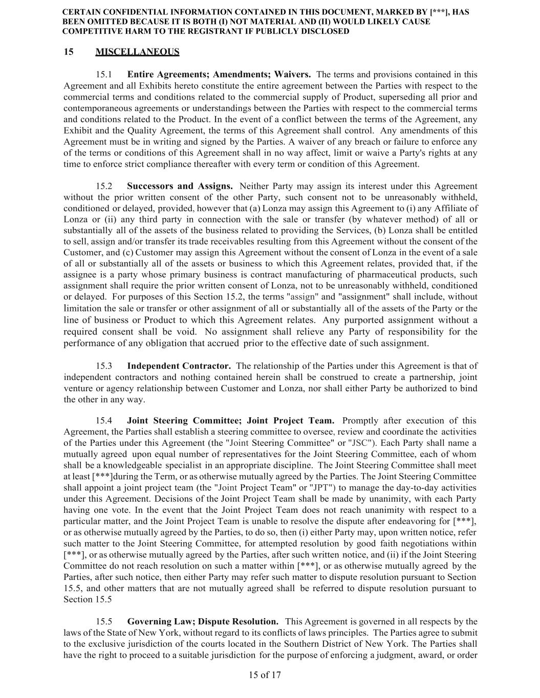 CERTAIN CONFIDENTIAL INFORMATION CONTAINED IN THIS DOCUMENT, MARKED BY [***], HAS BEEN OMITTED BECAUSE IT IS BOTH (I) NOT MATERIAL AND (II) WOULD LIKELY CAUSE COMPETITIVE HARM TO THE REGISTRANT IF PUBLICLY DISCLOSED 15 of 17 15 MISCELLANEOUS 15.1 Entire Agreements; Amendments; Waivers. The terms and provisions contained in this Agreement and all Exhibits hereto constitute the entire agreement between the Parties with respect to the commercial terms and conditions related to the commercial supply of Product, superseding all prior and contemporaneous agreements or understandings between the Parties with respect to the commercial terms and conditions related to the Product. In the event of a conflict between the terms of the Agreement, any Exhibit and the Quality Agreement, the terms of this Agreement shall control. Any amendments of this Agreement must be in writing and signed by the Parties. A waiver of any breach or failure to enforce any of the terms or conditions of this Agreement shall in no way affect, limit or waive a Party's rights at any time to enforce strict compliance thereafter with every term or condition of this Agreement. 15.2 Successors and Assigns. Neither Party may assign its interest under this Agreement without the prior written consent of the other Party, such consent not to be unreasonably withheld, conditioned or delayed, provided, however that (a) Lonza may assign this Agreement to (i) any Affiliate of Lonza or (ii) any third party in connection with the sale or transfer (by whatever method) of all or substantially all of the assets of the business related to providing the Services, (b) Lonza shall be entitled to sell, assign and/or transfer its trade receivables resulting from this Agreement without the consent of the Customer, and (c) Customer may assign this Agreement without the consent of Lonza in the event of a sale of all or substantially all of the assets or business to which this Agreement relates, provided that, if the assignee is a party whose primary business is contract manufacturing of pharmaceutical products, such assignment shall require the prior written consent of Lonza, not to be unreasonably withheld, conditioned or delayed. For purposes of this Section 15.2, the terms "assign" and "assignment" shall include, without limitation the sale or transfer or other assignment of all or substantially all of the assets of the Party or the line of business or Product to which this Agreement relates. Any purported assignment without a required consent shall be void. No assignment shall relieve any Party of responsibility for the performance of any obligation that accrued prior to the effective date of such assignment. 15.3 Independent Contractor. The relationship of the Parties under this Agreement is that of independent contractors and nothing contained herein shall be construed to create a partnership, joint venture or agency relationship between Customer and Lonza, nor shall either Party be authorized to bind the other in any way. 15.4 Joint Steering Committee; Joint Project Team. Promptly after execution of this Agreement, the Parties shall establish a steering committee to oversee, review and coordinate the activities of the Parties under this Agreement (the "Joint Steering Committee" or "JSC"). Each Party shall name a mutually agreed upon equal number of representatives for the Joint Steering Committee, each of whom shall be a knowledgeable specialist in an appropriate discipline. The Joint Steering Committee shall meet at least [***]during the Term, or as otherwise mutually agreed by the Parties. The Joint Steering Committee shall appoint a joint project team (the "Joint Project Team" or "JPT") to manage the day-to-day activities under this Agreement. Decisions of the Joint Project Team shall be made by unanimity, with each Party having one vote. In the event that the Joint Project Team does not reach unanimity with respect to a particular matter, and the Joint Project Team is unable to resolve the dispute after endeavoring for [***], or as otherwise mutually agreed by the Parties, to do so, then (i) either Party may, upon written notice, refer such matter to the Joint Steering Committee, for attempted resolution by good faith negotiations within [***], or as otherwise mutually agreed by the Parties, after such written notice, and (ii) if the Joint Steering Committee do not reach resolution on such a matter within [***], or as otherwise mutually agreed by the Parties, after such notice, then either Party may refer such matter to dispute resolution pursuant to Section 15.5, and other matters that are not mutually agreed shall be referred to dispute resolution pursuant to Section 15.5 15.5 Governing Law; Dispute Resolution. This Agreement is governed in all respects by the laws of the State of New York, without regard to its conflicts of laws principles. The Parties agree to submit to the exclusive jurisdiction of the courts located in the Southern District of New York. The Parties shall have the right to proceed to a suitable jurisdiction for the purpose of enforcing a judgment, award, or order