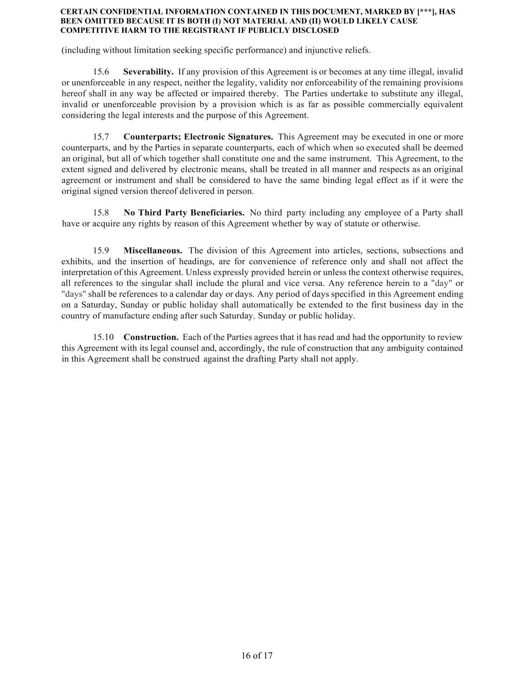 CERTAIN CONFIDENTIAL INFORMATION CONTAINED IN THIS DOCUMENT, MARKED BY [***], HAS BEEN OMITTED BECAUSE IT IS BOTH (I) NOT MATERIAL AND (II) WOULD LIKELY CAUSE COMPETITIVE HARM TO THE REGISTRANT IF PUBLICLY DISCLOSED 16 of 17 (including without limitation seeking specific performance) and injunctive reliefs. 15.6 Severability. If any provision of this Agreement is or becomes at any time illegal, invalid or unenforceable in any respect, neither the legality, validity nor enforceability of the remaining provisions hereof shall in any way be affected or impaired thereby. The Parties undertake to substitute any illegal, invalid or unenforceable provision by a provision which is as far as possible commercially equivalent considering the legal interests and the purpose of this Agreement. 15.7 Counterparts; Electronic Signatures. This Agreement may be executed in one or more counterparts, and by the Parties in separate counterparts, each of which when so executed shall be deemed an original, but all of which together shall constitute one and the same instrument. This Agreement, to the extent signed and delivered by electronic means, shall be treated in all manner and respects as an original agreement or instrument and shall be considered to have the same binding legal effect as if it were the original signed version thereof delivered in person. 15.8 No Third Party Beneficiaries. No third party including any employee of a Party shall have or acquire any rights by reason of this Agreement whether by way of statute or otherwise. 15.9 Miscellaneous. The division of this Agreement into articles, sections, subsections and exhibits, and the insertion of headings, are for convenience of reference only and shall not affect the interpretation of this Agreement. Unless expressly provided herein or unless the context otherwise requires, all references to the singular shall include the plural and vice versa. Any reference herein to a "day" or "days" shall be references to a calendar day or days. Any period of days specified in this Agreement ending on a Saturday, Sunday or public holiday shall automatically be extended to the first business day in the country of manufacture ending after such Saturday, Sunday or public holiday. 15.10 Construction. Each of the Parties agrees that it has read and had the opportunity to review this Agreement with its legal counsel and, accordingly, the rule of construction that any ambiguity contained in this Agreement shall be construed against the drafting Party shall not apply.