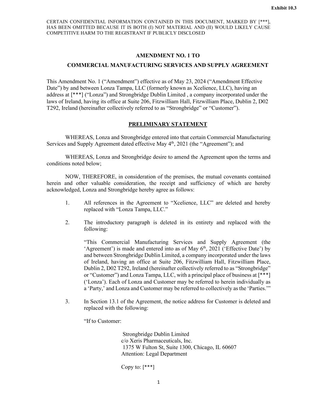 CERTAIN CONFIDENTIAL INFORMATION CONTAINED IN THIS DOCUMENT, MARKED BY [***], HAS BEEN OMITTED BECAUSE IT IS BOTH (I) NOT MATERIAL AND (II) WOULD LIKELY CAUSE COMPETITIVE HARM TO THE REGISTRANT IF PUBLICLY DISCLOSED 1 AMENDMENT NO. 1 TO COMMERCIAL MANUFACTURING SERVICES AND SUPPLY AGREEMENT This Amendment No. 1 (“Amendment”) effective as of May 23, 2024 (“Amendment Effective Date”) by and between Lonza Tampa, LLC (formerly known as Xcelience, LLC), having an address at [***] (“Lonza”) and Strongbridge Dublin Limited , a company incorporated under the laws of Ireland, having its office at Suite 206, Fitzwilliam Hall, Fitzwilliam Place, Dublin 2, D02 T292, Ireland (hereinafter collectively referred to as “Strongbridge” or “Customer”). PRELIMINARY STATEMENT WHEREAS, Lonza and Strongbridge entered into that certain Commercial Manufacturing Services and Supply Agreement dated effective May 4th, 2021 (the “Agreement”); and WHEREAS, Lonza and Strongbridge desire to amend the Agreement upon the terms and conditions noted below; NOW, THEREFORE, in consideration of the premises, the mutual covenants contained herein and other valuable consideration, the receipt and sufficiency of which are hereby acknowledged, Lonza and Strongbridge hereby agree as follows: 1. All references in the Agreement to “Xcelience, LLC” are deleted and hereby replaced with “Lonza Tampa, LLC.” 2. The introductory paragraph is deleted in its entirety and replaced with the following: “This Commercial Manufacturing Services and Supply Agreement (the ‘Agreement’) is made and entered into as of May 6th, 2021 (‘Effective Date’) by and between Strongbridge Dublin Limited, a company incorporated under the laws of Ireland, having an office at Suite 206, Fitzwilliam Hall, Fitzwilliam Place, Dublin 2, D02 T292, Ireland (hereinafter collectively referred to as “Strongbridge” or “Customer”) and Lonza Tampa, LLC, with a principal place of business at [***] (‘Lonza’). Each of Lonza and Customer may be referred to herein individually as a ‘Party,’ and Lonza and Customer may be referred to collectively as the ‘Parties.’” 3. In Section 13.1 of the Agreement, the notice address for Customer is deleted and replaced with the following: “If to Customer: Strongbridge Dublin Limited c/o Xeris Pharmaceuticals, Inc. 1375 W Fulton St, Suite 1300, Chicago, IL 60607 Attention: Legal Department Copy to: [***] Exhibit 10.3