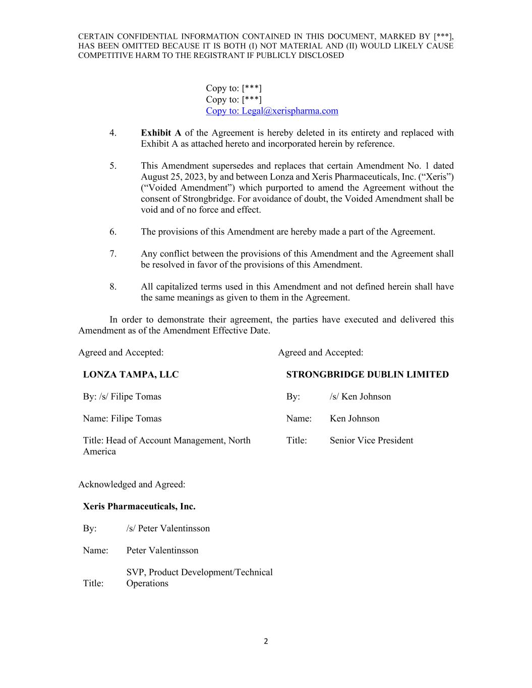 CERTAIN CONFIDENTIAL INFORMATION CONTAINED IN THIS DOCUMENT, MARKED BY [***], HAS BEEN OMITTED BECAUSE IT IS BOTH (I) NOT MATERIAL AND (II) WOULD LIKELY CAUSE COMPETITIVE HARM TO THE REGISTRANT IF PUBLICLY DISCLOSED 2 Copy to: [***] Copy to: [***] Copy to: Legal@xerispharma.com 4. Exhibit A of the Agreement is hereby deleted in its entirety and replaced with Exhibit A as attached hereto and incorporated herein by reference. 5. This Amendment supersedes and replaces that certain Amendment No. 1 dated August 25, 2023, by and between Lonza and Xeris Pharmaceuticals, Inc. (“Xeris”) (“Voided Amendment”) which purported to amend the Agreement without the consent of Strongbridge. For avoidance of doubt, the Voided Amendment shall be void and of no force and effect. 6. The provisions of this Amendment are hereby made a part of the Agreement. 7. Any conflict between the provisions of this Amendment and the Agreement shall be resolved in favor of the provisions of this Amendment. 8. All capitalized terms used in this Amendment and not defined herein shall have the same meanings as given to them in the Agreement. In order to demonstrate their agreement, the parties have executed and delivered this Amendment as of the Amendment Effective Date. Agreed and Accepted: Agreed and Accepted: LONZA TAMPA, LLC STRONGBRIDGE DUBLIN LIMITED By: /s/ Filipe Tomas By: /s/ Ken Johnson Name: Filipe Tomas Name: Ken Johnson Title: Head of Account Management, North America Title: Senior Vice President Acknowledged and Agreed: Xeris Pharmaceuticals, Inc. By: /s/ Peter Valentinsson Name: Peter Valentinsson Title: SVP, Product Development/Technical Operations