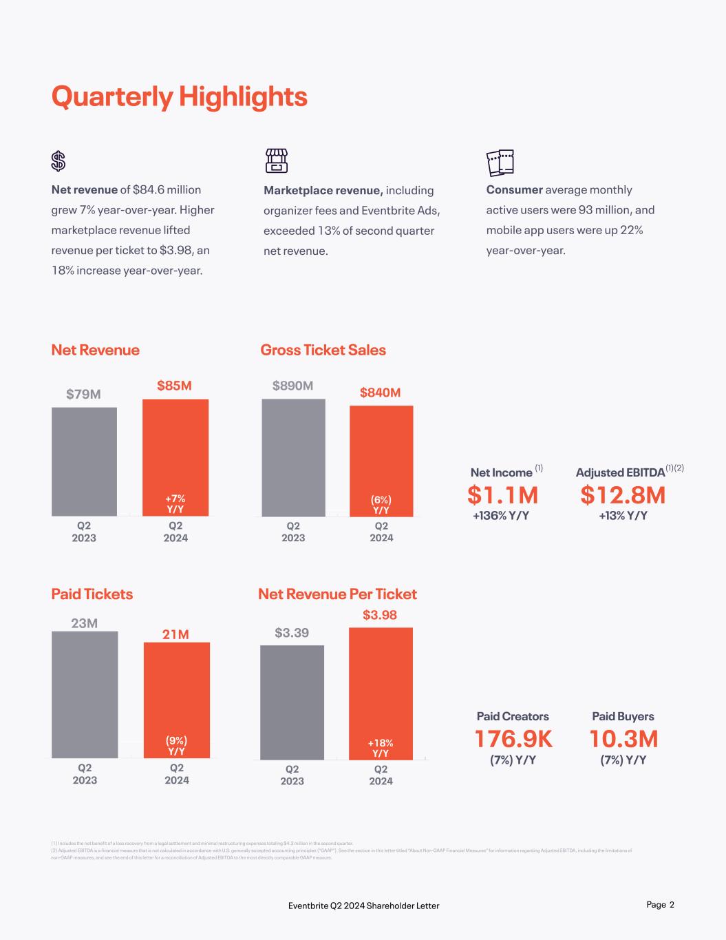 . Net Revenue Paid Tickets Gross Ticket Sales Net Revenue Per Ticket (1) Includes the net benefit of a loss recovery from a legal settlement and minimal restructuring expenses totaling $4.3 million in the second quarter. (2) Adjusted EBITDA is a financial measure that is not calculated in accordance with U.S. generally accepted accounting principles (“GAAP”). See the section in this letter titled “About Non-GAAP Financial Measures” for information regarding Adjusted EBITDA, including the limitations of non-GAAP measures, and see the end of this letter for a reconciliation of Adjusted EBITDA to the most directly comparable GAAP measure. Quarterly Highlights Net revenue of $84.6 million grew 7% year-over-year. Higher marketplace revenue lifted revenue per ticket to $3.98, an 18% increase year-over-year. Consumer average monthly active users were 93 million, and mobile app users were up 22% year-over-year. Paid Creators Net Income (1) Paid Buyers Adjusted EBITDA(1)(2) (7%) Y/Y +136% Y/Y (7%) Y/Y +13% Y/Y 176.9K $1.1M 10.3M $12.8M Q2 2024 Q2 2023 $79M $85M +7% Y/Y Q2 2024 Q2 2023 $890M $840M (6%) Y/Y Q2 2024 Q2 2023 23M 21M (9%) Y/Y Q2 2024 Q2 2023 $3.39 $3.98 +18% Y/Y Marketplace revenue, including organizer fees and Eventbrite Ads, exceeded 13% of second quarter net revenue. Page 2Eventbrite Q2 2024 Shareholder Letter