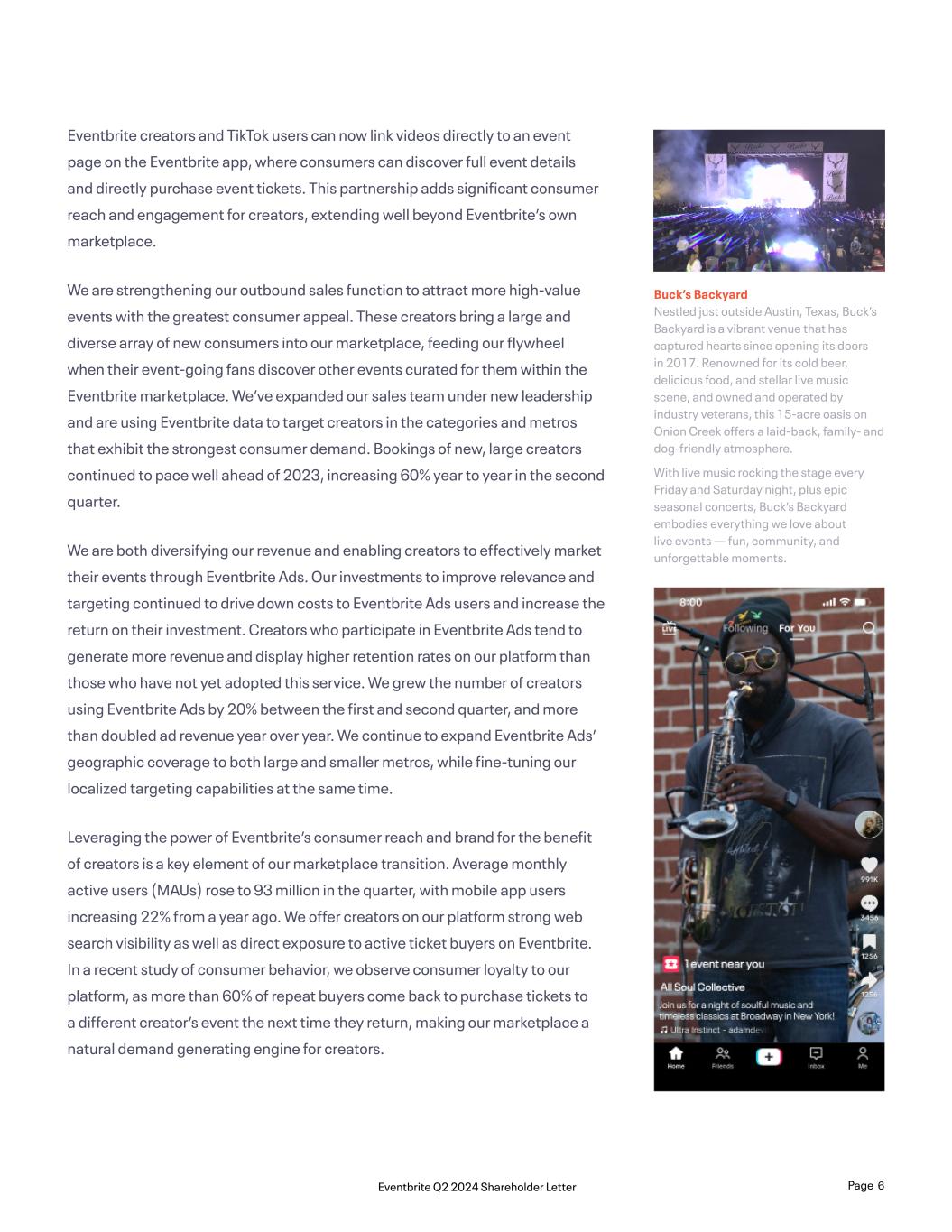 Eventbrite creators and TikTok users can now link videos directly to an event page on the Eventbrite app, where consumers can discover full event details and directly purchase event tickets. This partnership adds significant consumer reach and engagement for creators, extending well beyond Eventbrite’s own marketplace. We are strengthening our outbound sales function to attract more high-value events with the greatest consumer appeal. These creators bring a large and diverse array of new consumers into our marketplace, feeding our flywheel when their event-going fans discover other events curated for them within the Eventbrite marketplace. We’ve expanded our sales team under new leadership and are using Eventbrite data to target creators in the categories and metros that exhibit the strongest consumer demand. Bookings of new, large creators continued to pace well ahead of 2023, increasing 60% year to year in the second quarter. We are both diversifying our revenue and enabling creators to effectively market their events through Eventbrite Ads. Our investments to improve relevance and targeting continued to drive down costs to Eventbrite Ads users and increase the return on their investment. Creators who participate in Eventbrite Ads tend to generate more revenue and display higher retention rates on our platform than those who have not yet adopted this service. We grew the number of creators using Eventbrite Ads by 20% between the first and second quarter, and more than doubled ad revenue year over year. We continue to expand Eventbrite Ads’ geographic coverage to both large and smaller metros, while fine-tuning our localized targeting capabilities at the same time. Leveraging the power of Eventbrite’s consumer reach and brand for the benefit of creators is a key element of our marketplace transition. Average monthly active users (MAUs) rose to 93 million in the quarter, with mobile app users increasing 22% from a year ago. We offer creators on our platform strong web search visibility as well as direct exposure to active ticket buyers on Eventbrite. In a recent study of consumer behavior, we observe consumer loyalty to our platform, as more than 60% of repeat buyers come back to purchase tickets to a different creator’s event the next time they return, making our marketplace a natural demand generating engine for creators. Buck’s Backyard Nestled just outside Austin, Texas, Buck’s Backyard is a vibrant venue that has captured hearts since opening its doors in 2017. Renowned for its cold beer, delicious food, and stellar live music scene, and owned and operated by industry veterans, this 15-acre oasis on Onion Creek offers a laid-back, family- and dog-friendly atmosphere. With live music rocking the stage every Friday and Saturday night, plus epic seasonal concerts, Buck’s Backyard embodies everything we love about live events — fun, community, and unforgettable moments. Page 6Eventbrite Q2 2024 Shareholder Letter