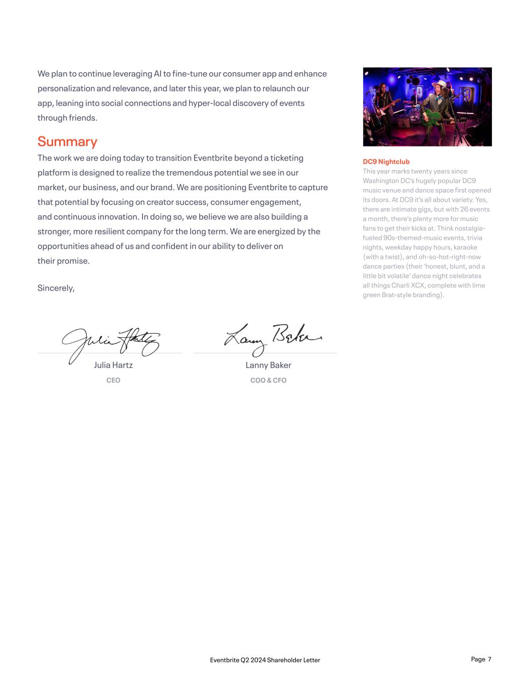 We plan to continue leveraging AI to fine-tune our consumer app and enhance personalization and relevance, and later this year, we plan to relaunch our app, leaning into social connections and hyper-local discovery of events through friends. Summary The work we are doing today to transition Eventbrite beyond a ticketing platform is designed to realize the tremendous potential we see in our market, our business, and our brand. We are positioning Eventbrite to capture that potential by focusing on creator success, consumer engagement, and continuous innovation. In doing so, we believe we are also building a stronger, more resilient company for the long term. We are energized by the opportunities ahead of us and confident in our ability to deliver on their promise. Sincerely, DC9 Nightclub This year marks twenty years since Washington DC’s hugely popular DC9 music venue and dance space first opened its doors. At DC9 it’s all about variety. Yes, there are intimate gigs, but with 26 events a month, there’s plenty more for music fans to get their kicks at. Think nostalgia- fueled 90s-themed-music events, trivia nights, weekday happy hours, karaoke (with a twist), and oh-so-hot-right-now dance parties (their ‘honest, blunt, and a little bit volatile’ dance night celebrates all things Charli XCX, complete with lime green Brat-style branding). Julia Hartz CEO Lanny Baker COO & CFO Page 7Eventbrite Q2 2024 Shareholder Letter