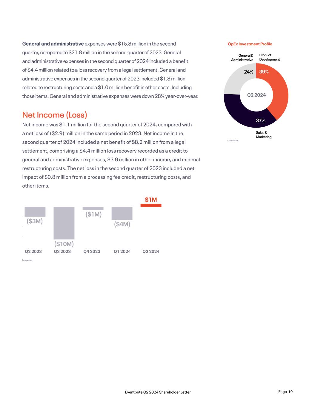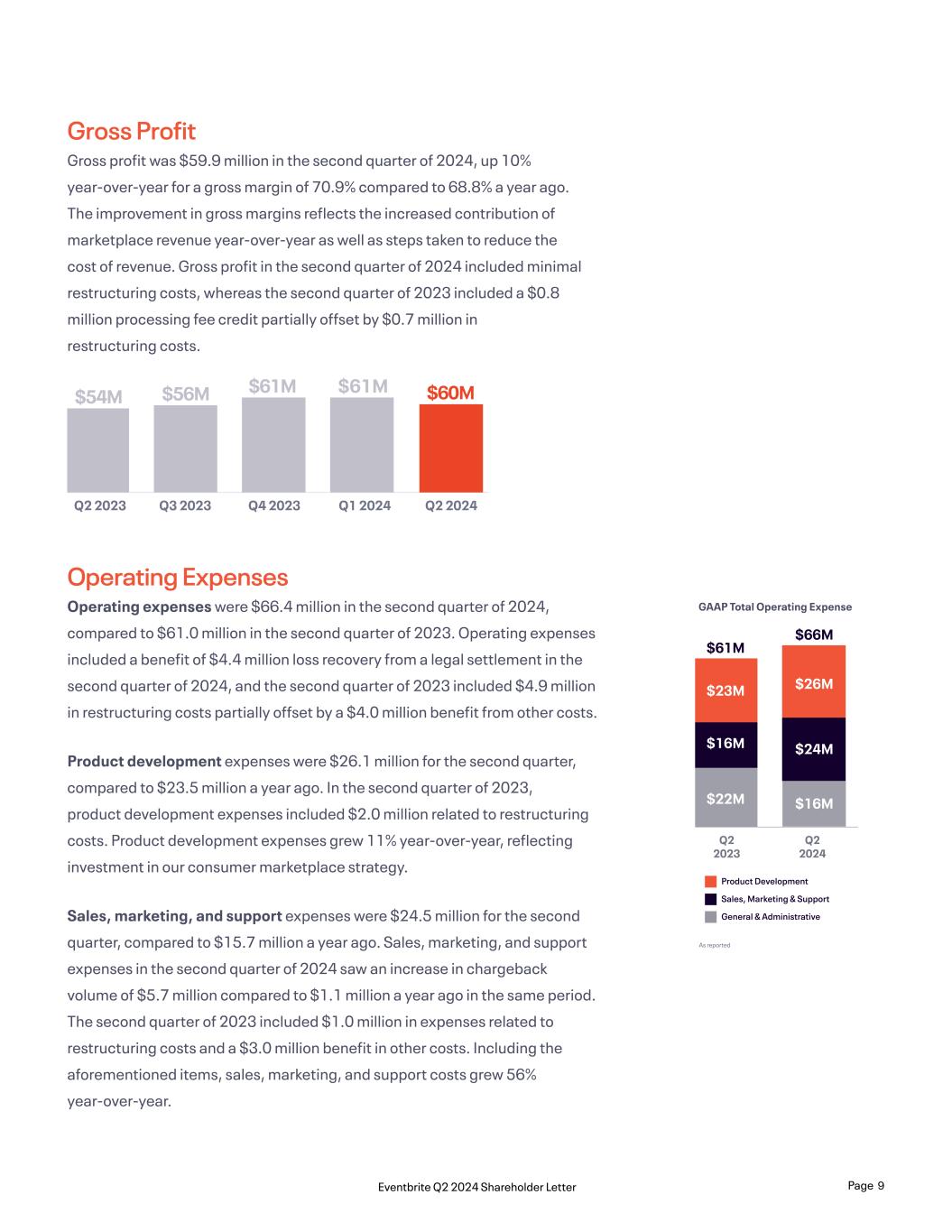 Gross Profit Gross profit was $59.9 million in the second quarter of 2024, up 10% year-over-year for a gross margin of 70.9% compared to 68.8% a year ago. The improvement in gross margins reflects the increased contribution of marketplace revenue year-over-year as well as steps taken to reduce the cost of revenue. Gross profit in the second quarter of 2024 included minimal restructuring costs, whereas the second quarter of 2023 included a $0.8 million processing fee credit partially offset by $0.7 million in restructuring costs. Q2 2024Q1 2024Q4 2023Q3 2023Q2 2023 $54M $56M $61M $61M $60M Operating Expenses Operating expenses were $66.4 million in the second quarter of 2024, compared to $61.0 million in the second quarter of 2023. Operating expenses included a benefit of $4.4 million loss recovery from a legal settlement in the second quarter of 2024, and the second quarter of 2023 included $4.9 million in restructuring costs partially offset by a $4.0 million benefit from other costs. Product development expenses were $26.1 million for the second quarter, compared to $23.5 million a year ago. In the second quarter of 2023, product development expenses included $2.0 million related to restructuring costs. Product development expenses grew 11% year-over-year, reflecting investment in our consumer marketplace strategy. Sales, marketing, and support expenses were $24.5 million for the second quarter, compared to $15.7 million a year ago. Sales, marketing, and support expenses in the second quarter of 2024 saw an increase in chargeback volume of $5.7 million compared to $1.1 million a year ago in the same period. The second quarter of 2023 included $1.0 million in expenses related to restructuring costs and a $3.0 million benefit in other costs. Including the aforementioned items, sales, marketing, and support costs grew 56% year-over-year. Product Development Sales, Marketing & Support General & Administrative Q2 2023 Q2 2024 $22M $16M $23M $61M $24M $26M $66M $16M As reported GAAP Total Operating Expense Page 9Eventbrite Q2 2024 Shareholder Letter