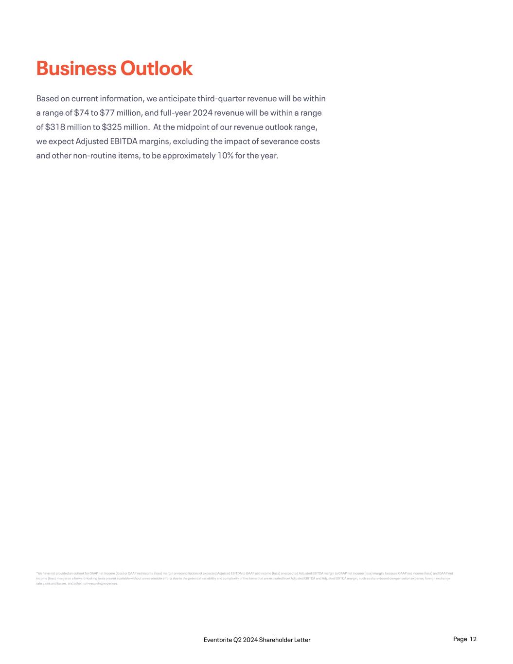 *We have not provided an outlook for GAAP net income (loss) or GAAP net income (loss) margin or reconciliations of expected Adjusted EBITDA to GAAP net income (loss) or expected Adjusted EBITDA margin to GAAP net income (loss) margin, because GAAP net income (loss) and GAAP net income (loss) margin on a forward-looking basis are not available without unreasonable efforts due to the potential variability and complexity of the items that are excluded from Adjusted EBITDA and Adjusted EBITDA margin, such as share-based compensation expense, foreign exchange rate gains and losses, and other non-recurring expenses. Business Outlook Based on current information, we anticipate third-quarter revenue will be within a range of $74 to $77 million, and full-year 2024 revenue will be within a range of $318 million to $325 million. At the midpoint of our revenue outlook range, we expect Adjusted EBITDA margins, excluding the impact of severance costs and other non-routine items, to be approximately 10% for the year. Page 12Eventbrite Q2 2024 Shareholder Letter