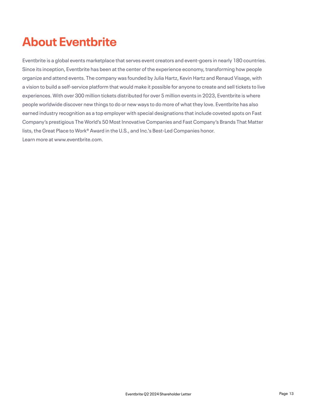 About Eventbrite Eventbrite is a global events marketplace that serves event creators and event-goers in nearly 180 countries. Since its inception, Eventbrite has been at the center of the experience economy, transforming how people organize and attend events. The company was founded by Julia Hartz, Kevin Hartz and Renaud Visage, with a vision to build a self-service platform that would make it possible for anyone to create and sell tickets to live experiences. With over 300 million tickets distributed for over 5 million events in 2023, Eventbrite is where people worldwide discover new things to do or new ways to do more of what they love. Eventbrite has also earned industry recognition as a top employer with special designations that include coveted spots on Fast Company’s prestigious The World’s 50 Most Innovative Companies and Fast Company’s Brands That Matter lists, the Great Place to Work® Award in the U.S., and Inc.'s Best-Led Companies honor. Learn more at www.eventbrite.com. Page 13Eventbrite Q2 2024 Shareholder Letter