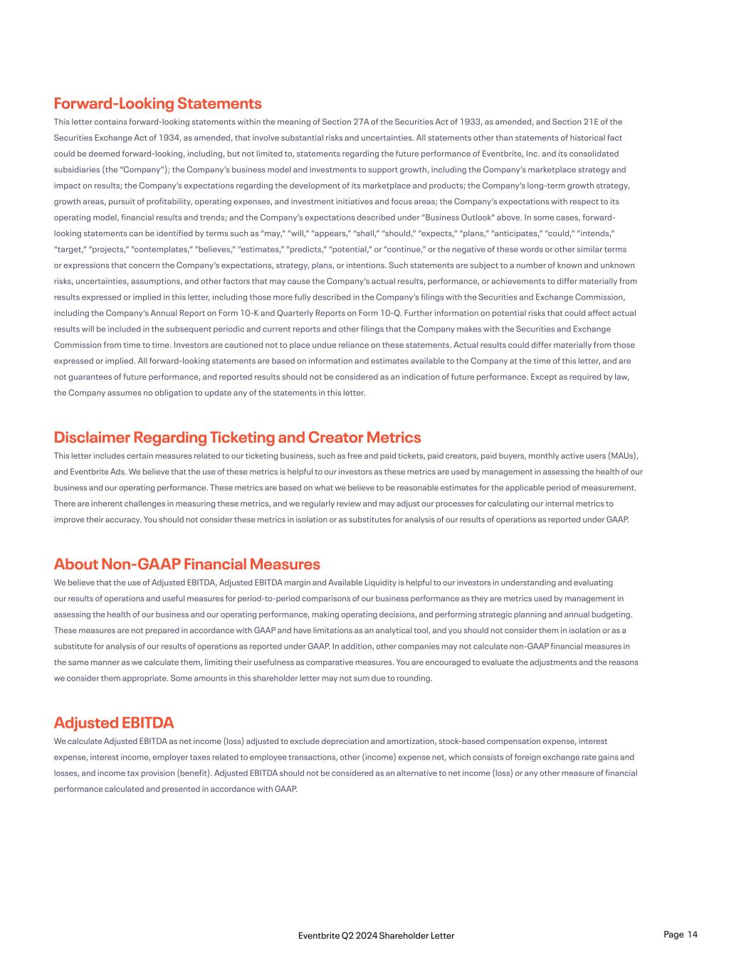 Forward-Looking Statements This letter contains forward-looking statements within the meaning of Section 27A of the Securities Act of 1933, as amended, and Section 21E of the Securities Exchange Act of 1934, as amended, that involve substantial risks and uncertainties. All statements other than statements of historical fact could be deemed forward-looking, including, but not limited to, statements regarding the future performance of Eventbrite, Inc. and its consolidated subsidiaries (the “Company”); the Company’s business model and investments to support growth, including the Company’s marketplace strategy and impact on results; the Company’s expectations regarding the development of its marketplace and products; the Company’s long-term growth strategy, growth areas, pursuit of profitability, operating expenses, and investment initiatives and focus areas; the Company’s expectations with respect to its operating model, financial results and trends; and the Company’s expectations described under “Business Outlook” above. In some cases, forward- looking statements can be identified by terms such as “may,” “will,” “appears,” “shall,” “should,” “expects,” “plans,” “anticipates,” “could,” “intends,” “target,” “projects,” “contemplates,” “believes,” “estimates,” “predicts,” “potential,” or “continue,” or the negative of these words or other similar terms or expressions that concern the Company’s expectations, strategy, plans, or intentions. Such statements are subject to a number of known and unknown risks, uncertainties, assumptions, and other factors that may cause the Company’s actual results, performance, or achievements to differ materially from results expressed or implied in this letter, including those more fully described in the Company’s filings with the Securities and Exchange Commission, including the Company’s Annual Report on Form 10-K and Quarterly Reports on Form 10-Q. Further information on potential risks that could affect actual results will be included in the subsequent periodic and current reports and other filings that the Company makes with the Securities and Exchange Commission from time to time. Investors are cautioned not to place undue reliance on these statements. Actual results could differ materially from those expressed or implied. All forward-looking statements are based on information and estimates available to the Company at the time of this letter, and are not guarantees of future performance, and reported results should not be considered as an indication of future performance. Except as required by law, the Company assumes no obligation to update any of the statements in this letter. Disclaimer Regarding Ticketing and Creator Metrics This letter includes certain measures related to our ticketing business, such as free and paid tickets, paid creators, paid buyers, monthly active users (MAUs), and Eventbrite Ads. We believe that the use of these metrics is helpful to our investors as these metrics are used by management in assessing the health of our business and our operating performance. These metrics are based on what we believe to be reasonable estimates for the applicable period of measurement. There are inherent challenges in measuring these metrics, and we regularly review and may adjust our processes for calculating our internal metrics to improve their accuracy. You should not consider these metrics in isolation or as substitutes for analysis of our results of operations as reported under GAAP. About Non-GAAP Financial Measures We believe that the use of Adjusted EBITDA, Adjusted EBITDA margin and Available Liquidity is helpful to our investors in understanding and evaluating our results of operations and useful measures for period-to-period comparisons of our business performance as they are metrics used by management in assessing the health of our business and our operating performance, making operating decisions, and performing strategic planning and annual budgeting. These measures are not prepared in accordance with GAAP and have limitations as an analytical tool, and you should not consider them in isolation or as a substitute for analysis of our results of operations as reported under GAAP. In addition, other companies may not calculate non-GAAP financial measures in the same manner as we calculate them, limiting their usefulness as comparative measures. You are encouraged to evaluate the adjustments and the reasons we consider them appropriate. Some amounts in this shareholder letter may not sum due to rounding. Adjusted EBITDA We calculate Adjusted EBITDA as net income (loss) adjusted to exclude depreciation and amortization, stock-based compensation expense, interest expense, interest income, employer taxes related to employee transactions, other (income) expense net, which consists of foreign exchange rate gains and losses, and income tax provision (benefit). Adjusted EBITDA should not be considered as an alternative to net income (loss) or any other measure of financial performance calculated and presented in accordance with GAAP. Page 14Eventbrite Q2 2024 Shareholder Letter
