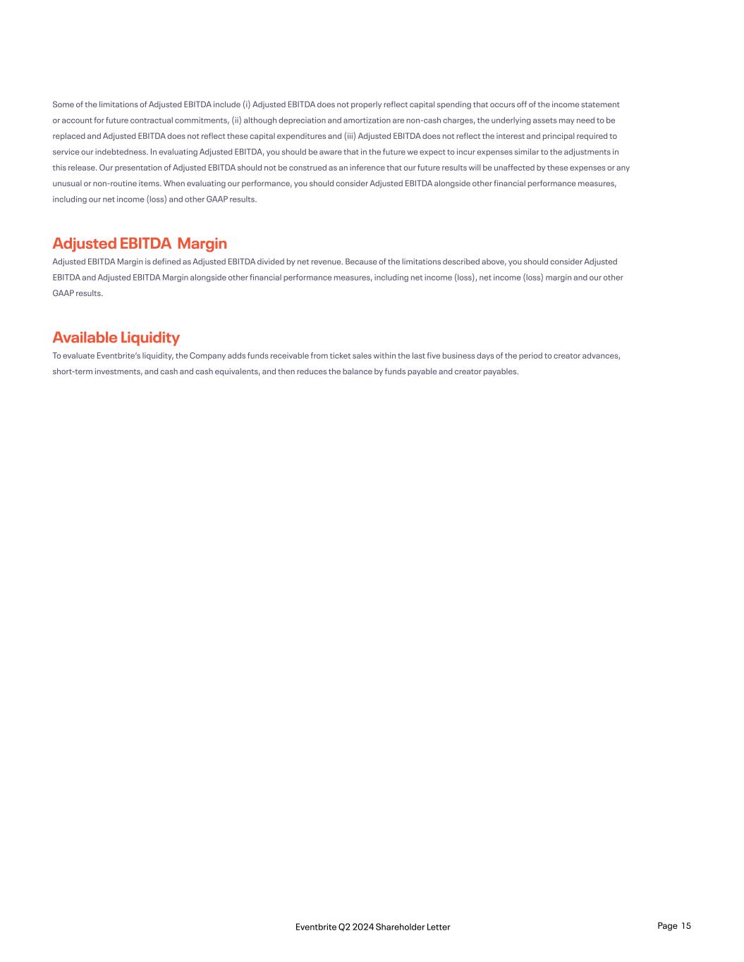 Some of the limitations of Adjusted EBITDA include (i) Adjusted EBITDA does not properly reflect capital spending that occurs off of the income statement or account for future contractual commitments, (ii) although depreciation and amortization are non-cash charges, the underlying assets may need to be replaced and Adjusted EBITDA does not reflect these capital expenditures and (iii) Adjusted EBITDA does not reflect the interest and principal required to service our indebtedness. In evaluating Adjusted EBITDA, you should be aware that in the future we expect to incur expenses similar to the adjustments in this release. Our presentation of Adjusted EBITDA should not be construed as an inference that our future results will be unaffected by these expenses or any unusual or non-routine items. When evaluating our performance, you should consider Adjusted EBITDA alongside other financial performance measures, including our net income (loss) and other GAAP results. Adjusted EBITDA Margin Adjusted EBITDA Margin is defined as Adjusted EBITDA divided by net revenue. Because of the limitations described above, you should consider Adjusted EBITDA and Adjusted EBITDA Margin alongside other financial performance measures, including net income (loss), net income (loss) margin and our other GAAP results. Available Liquidity To evaluate Eventbrite’s liquidity, the Company adds funds receivable from ticket sales within the last five business days of the period to creator advances, short-term investments, and cash and cash equivalents, and then reduces the balance by funds payable and creator payables. Page 15Eventbrite Q2 2024 Shareholder Letter