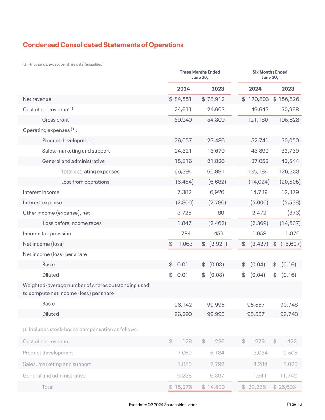 Net revenue Cost of net revenue(1) Gross profit Operating expenses (1): Product development Sales, marketing and support General and administrative Total operating expenses Loss from operations Interest income Interest expense Other income (expense), net Loss before income taxes Income tax provision Net income (loss) Net income (loss) per share Basic Diluted Weighted-average number of shares outstanding used to compute net income (loss) per share Basic Diluted 84,551 24,611 59,940 26,057 24,521 15,816 66,394 (6,454) 7,382 (2,806) 3,725 1,847 784 1,063 0.01 0.01 96,142 96,290 170,803 49,643 121,160 52,741 45,390 37,053 135,184 (14,024) 14,789 (5,606) 2,472 (2,369) 1,058 (3,427) (0.04) (0.04) 95,557 95,557 78,912 24,603 54,309 23,486 15,679 21,826 60,991 (6,682) 6,926 (2,786) 80 (2,462) 459 (2,921) (0.03) (0.03) 99,995 99,995 156,826 50,998 105,828 50,050 32,739 43,544 126,333 (20,505) 12,379 (5,538) (873) (14,537) 1,070 (15,607) (0.16) (0.16) 99,748 99,748 Cost of net revenue Product development Sales, marketing and support General and administrative Total 128 7,060 1,850 6,238 15,276 279 13,034 4,284 11,641 29,238 226 5,184 2,792 6,397 14,599 423 9,508 5,020 11,742 26,693 Condensed Consolidated Statements of Operations ($ in thousands, except per share data)(unaudited) $ $ $ $ $ $ $ $ $ $ $ $ $ $ $ $ $ $ $ $ $ $ $ $ Six Months Ended June 30, Three Months Ended June 30, 20242024 20232023 (1) Includes stock-based compensation as follows: Page 16Eventbrite Q2 2024 Shareholder Letter