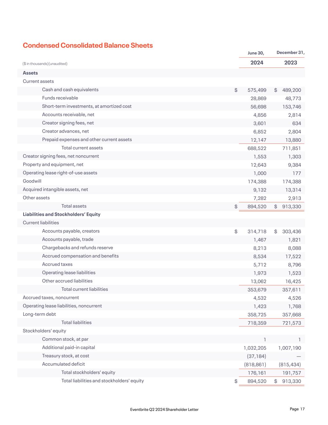 Assets Current assets Cash and cash equivalents Funds receivable Short-term investments, at amortized cost Accounts receivable, net Creator signing fees, net Creator advances, net Prepaid expenses and other current assets Total current assets Creator signing fees, net noncurrent Property and equipment, net Operating lease right-of-use assets Goodwill Acquired intangible assets, net Other assets Total assets Liabilities and Stockholders’ Equity Current liabilities Accounts payable, creators Accounts payable, trade Chargebacks and refunds reserve Accrued compensation and benefits Accrued taxes Operating lease liabilities Other accrued liabilities Total current liabilities Accrued taxes, noncurrent Operating lease liabilities, noncurrent Long-term debt Total liabilities Stockholders’ equity Common stock, at par Additional paid-in capital Treasury stock, at cost Accumulated deficit Total stockholders' equity Total liabilities and stockholders' equity 575,499 28,869 56,698 4,856 3,601 6,852 12,147 688,522 1,553 12,643 1,000 174,388 9,132 7,282 894,520 314,718 1,467 8,213 8,534 5,712 1,973 13,062 353,679 4,532 1,423 358,725 718,359 1 1,032,205 (37,184) (818,861) 176,161 894,520 $ $ $ $ $ $ $ $ 489,200 48,773 153,746 2,814 634 2,804 13,880 711,851 1,303 9,384 177 174,388 13,314 2,913 913,330 303,436 1,821 8,088 17,522 8,796 1,523 16,425 357,611 4,526 1,768 357,668 721,573 1 1,007,190 — (815,434) 191,757 913,330 Condensed Consolidated Balance Sheets ($ in thousands)(unaudited) June 30, December 31, 2024 2023 Page 17Eventbrite Q2 2024 Shareholder Letter