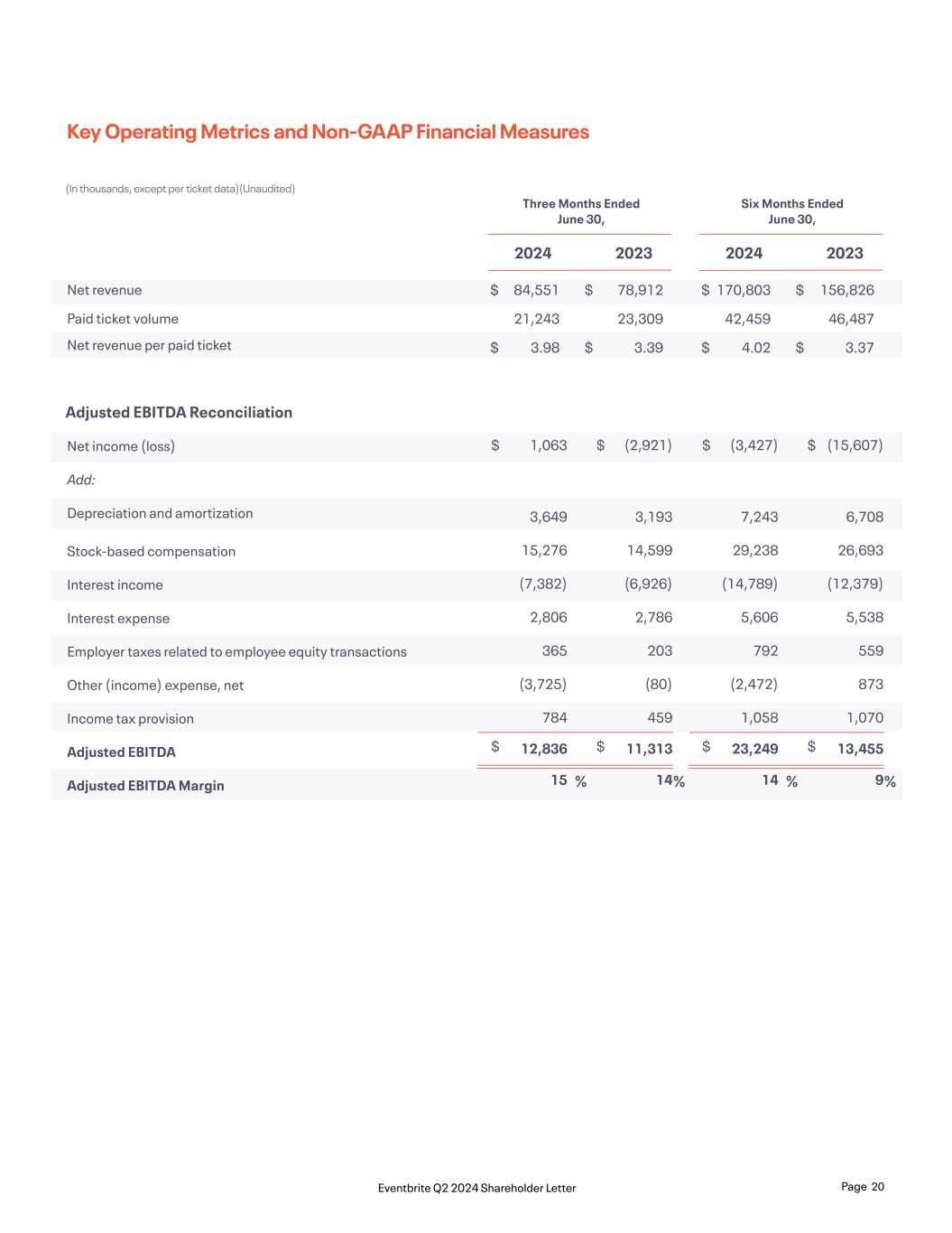 Net revenue Paid ticket volume Net revenue per paid ticket Net income (loss) Add: Depreciation and amortization Stock-based compensation Interest income Interest expense Employer taxes related to employee equity transactions Other (income) expense, net Income tax provision Adjusted EBITDA Adjusted EBITDA Margin (3,427) 7,243 29,238 (14,789) 5,606 792 (2,472) 1,058 23,249 14 1,063 3,649 15,276 (7,382) 2,806 365 (3,725) 784 12,836 15 (15,607) 6,708 26,693 (12,379) 5,538 559 873 1,070 13,455 9 (2,921) 3,193 14,599 (6,926) 2,786 203 (80) 459 11,313 14 $ $ $ $ $ $ $ $ Key Operating Metrics and Non-GAAP Financial Measures (In thousands, except per ticket data)(Unaudited) 170,803 42,459 4.02 84,551 21,243 3.98 156,826 46,487 3.37 78,912 23,309 3.39 $ $ $ $ $ $ $ $ Six Months Ended June 30, Three Months Ended June 30, 20242024 20232023 Adjusted EBITDA Reconciliation %% %% Page 20Eventbrite Q2 2024 Shareholder Letter