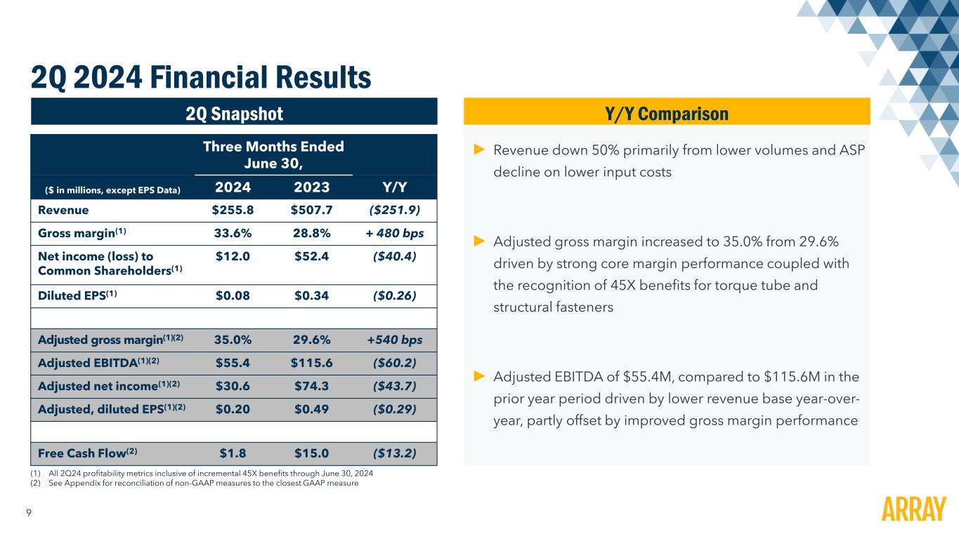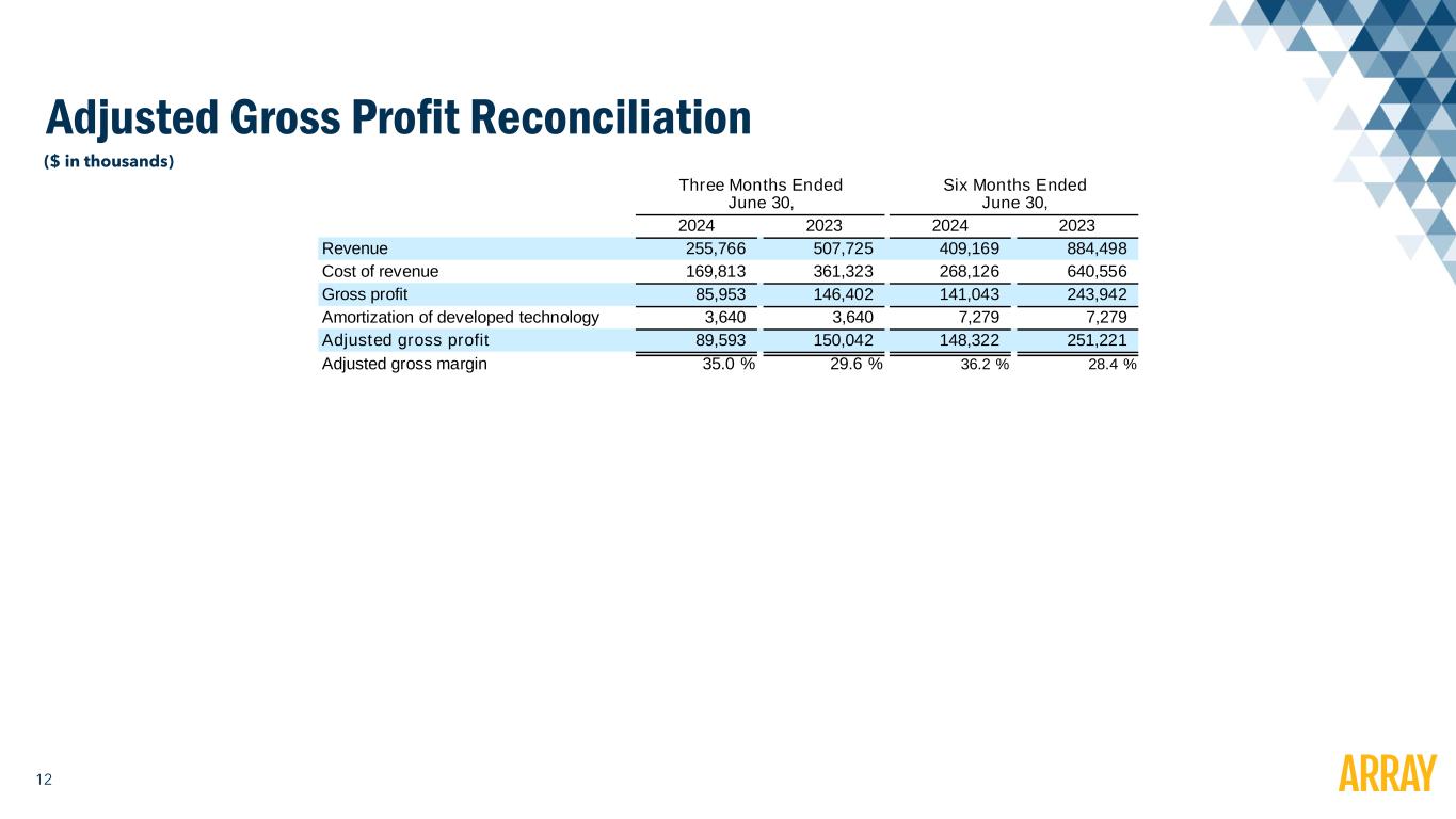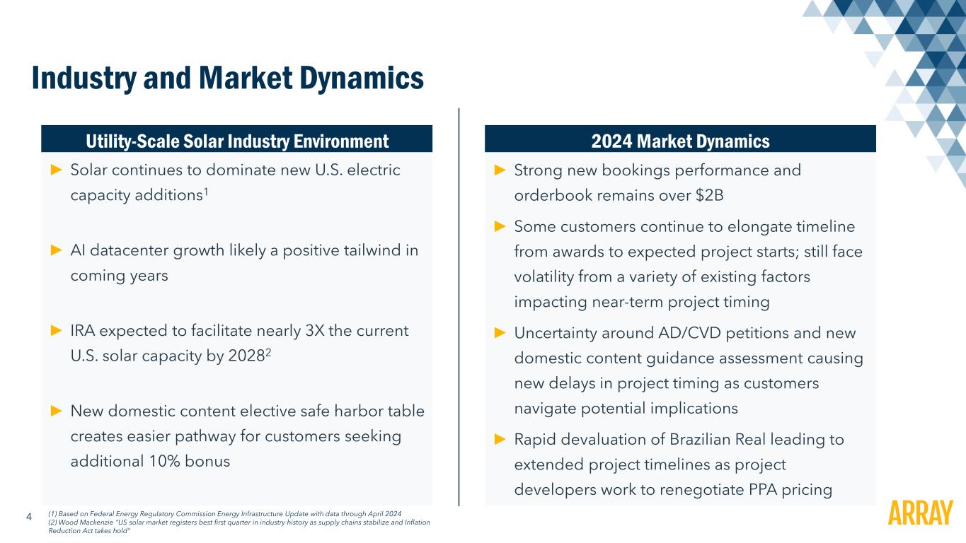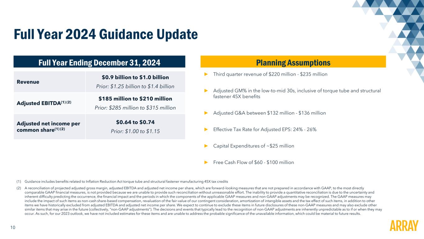 Mr. Hostetler continued, “While we’re seeing positive long-term momentum in the market, our customers continue to report struggles with short-term dynamics causing project delays, which has caused us to reduce our revenue outlook for the year. Notably, the recent AD/CVD petitions and the interpretation of the new IRA domestic content elective safe harbor table are new factors that have created some uncertainty in the U.S. market and changed timelines for some customers’ projects. Internationally, we’ve also witnessed a rapid devaluation of the Brazilian real which has caused developers to delay projects in Brazil as they work through renegotiating power purchase agreements. Within this challenging environment, we continue to focus on setting Array up for success to support growth in 2025 and beyond, and remain confident in our operational execution, continued innovation through new product launches like SkyLink, and enhanced customer and industry engagement."