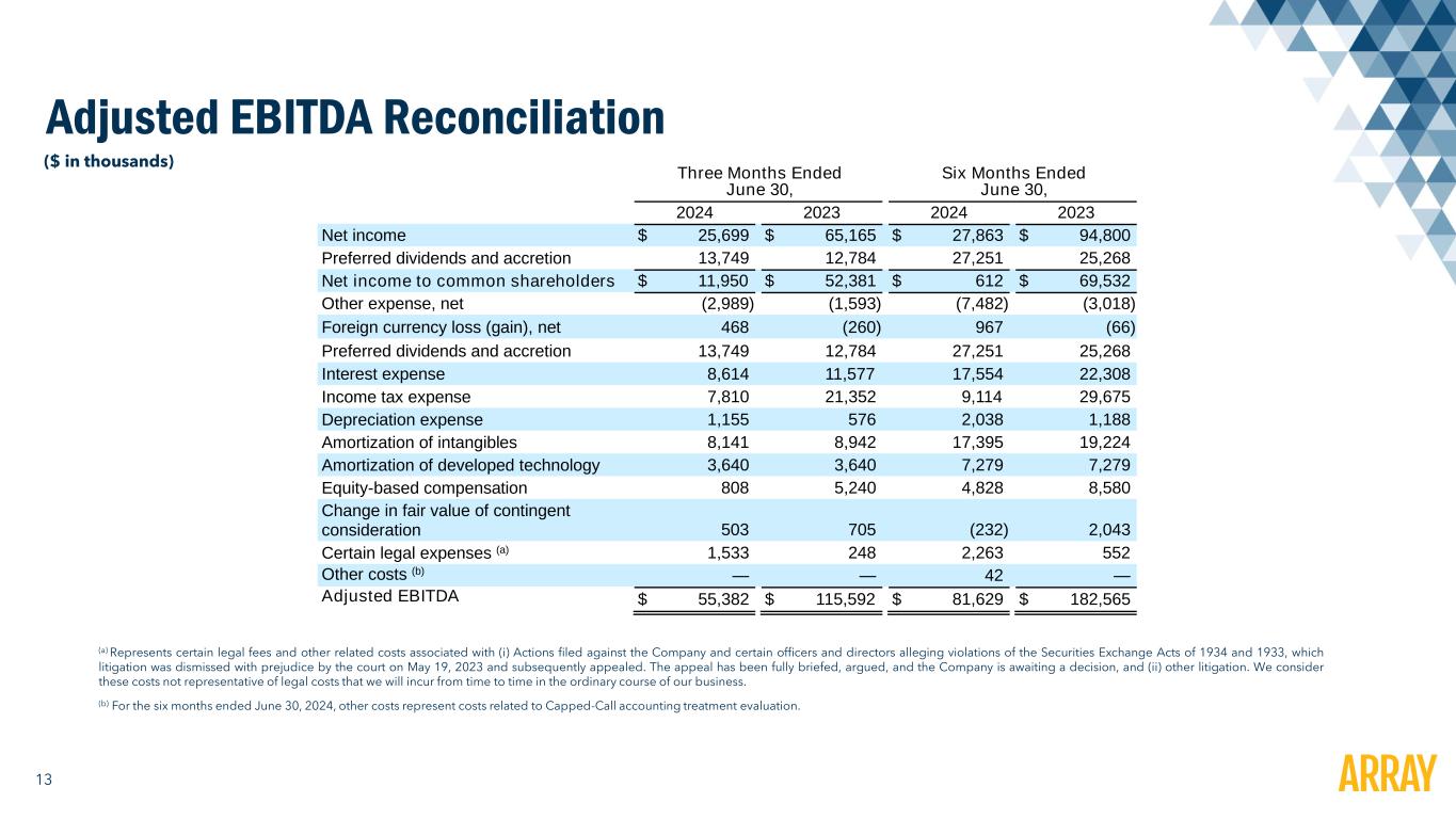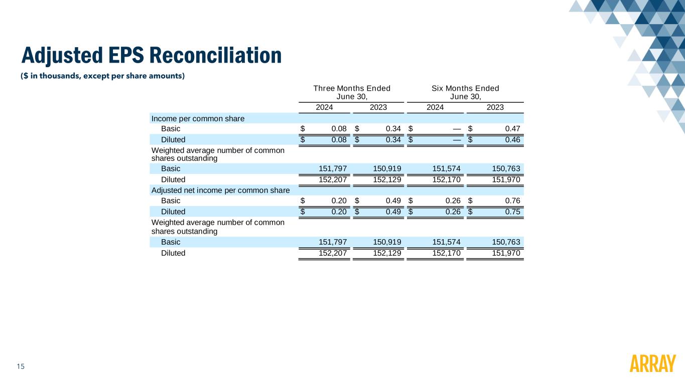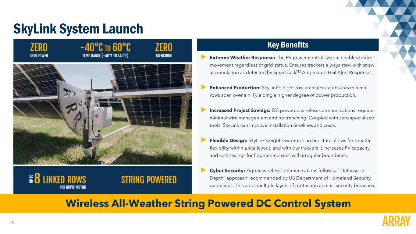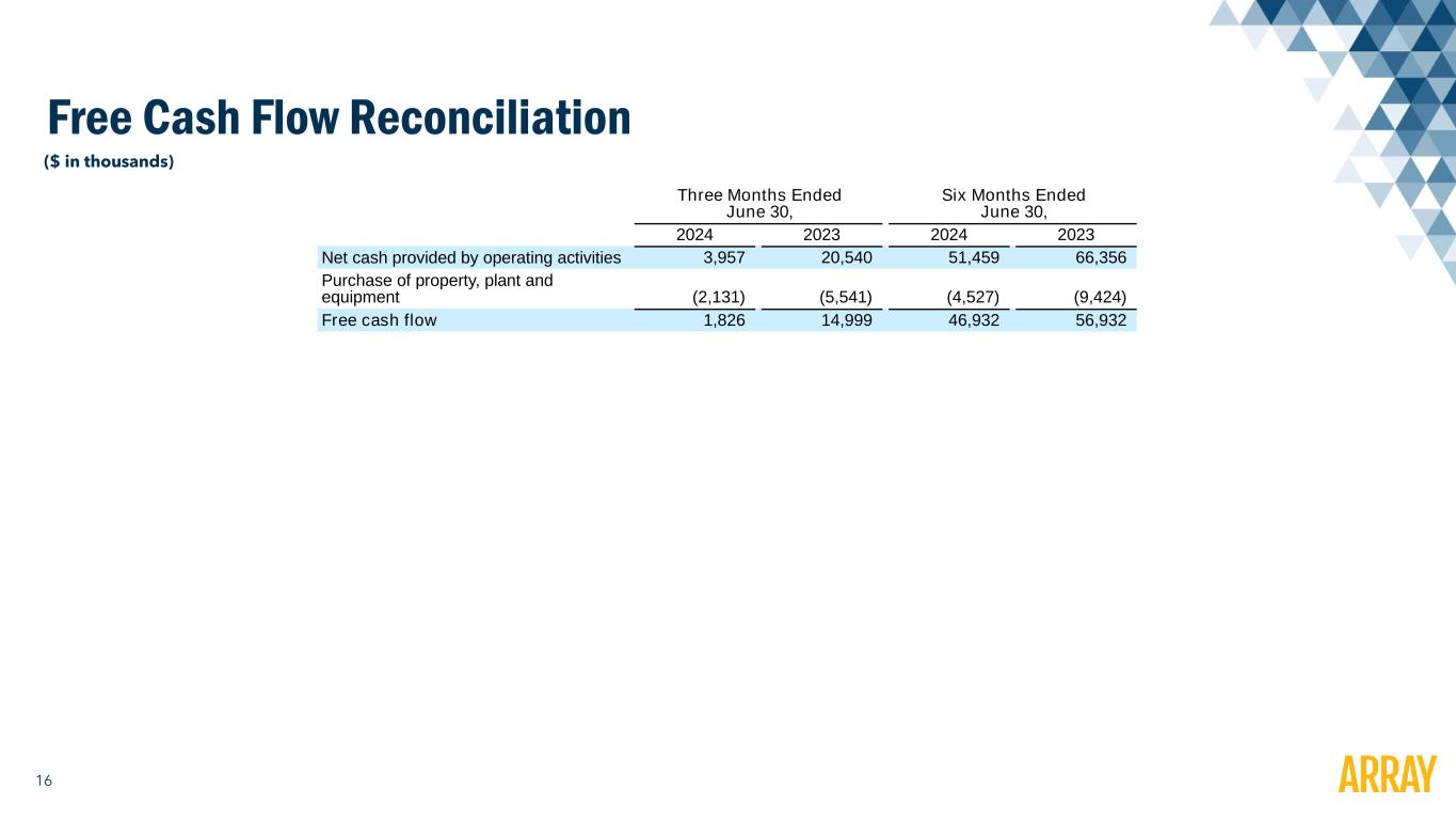 Mr. Hostetler continued, “While we’re seeing positive long-term momentum in the market, our customers continue to report struggles with short-term dynamics causing project delays, which has caused us to reduce our revenue outlook for the year. Notably, the recent AD/CVD petitions and the interpretation of the new IRA domestic content elective safe harbor table are new factors that have created some uncertainty in the U.S. market and changed timelines for some customers’ projects. Internationally, we’ve also witnessed a rapid devaluation of the Brazilian real which has caused developers to delay projects in Brazil as they work through renegotiating power purchase agreements. Within this challenging environment, we continue to focus on setting Array up for success to support growth in 2025 and beyond, and remain confident in our operational execution, continued innovation through new product launches like SkyLink, and enhanced customer and industry engagement."