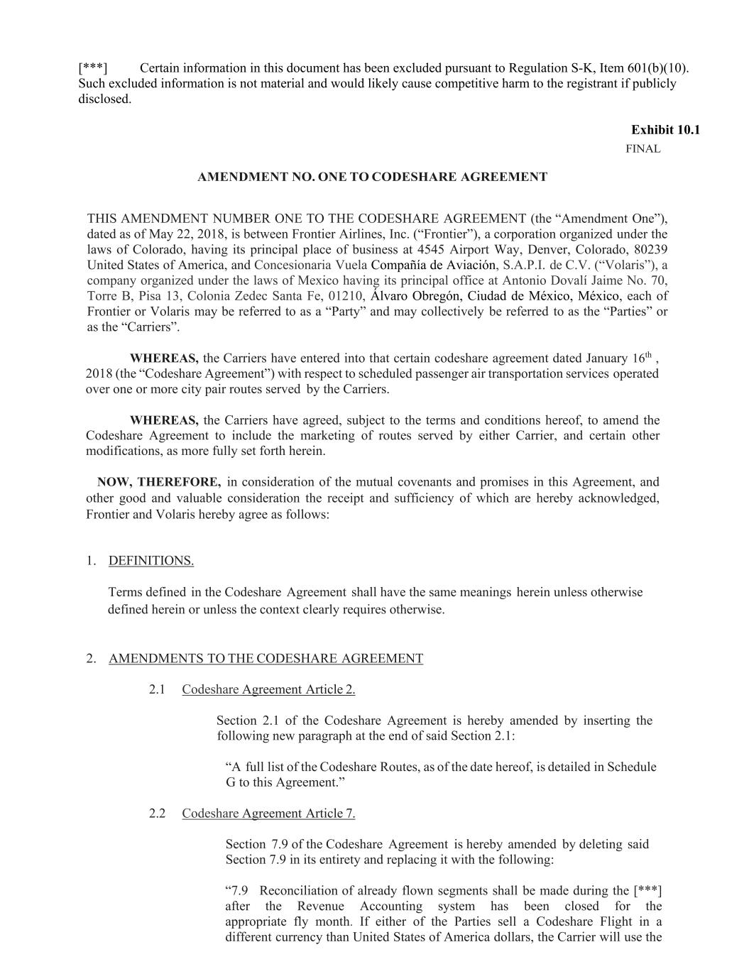 [***] Certain information in this document has been excluded pursuant to Regulation S-K, Item 601(b)(10). Such excluded information is not material and would likely cause competitive harm to the registrant if publicly disclosed. Exhibit 10.1 FINAL AMENDMENT NO. ONE TO CODESHARE AGREEMENT THIS AMENDMENT NUMBER ONE TO THE CODESHARE AGREEMENT (the “Amendment One”), dated as of May 22, 2018, is between Frontier Airlines, Inc. (“Frontier”), a corporation organized under the laws of Colorado, having its principal place of business at 4545 Airport Way, Denver, Colorado, 80239 United States of America, and Concesionaria Vuela Compañía de Aviación, S.A.P.I. de C.V. (“Volaris”), a company organized under the laws of Mexico having its principal office at Antonio Dovalí Jaime No. 70, Torre B, Pisa 13, Colonia Zedec Santa Fe, 01210, Álvaro Obregón, Ciudad de México, México, each of Frontier or Volaris may be referred to as a “Party” and may collectively be referred to as the “Parties” or as the “Carriers”. WHEREAS, the Carriers have entered into that certain codeshare agreement dated January 16th , 2018 (the “Codeshare Agreement”) with respect to scheduled passenger air transportation services operated over one or more city pair routes served by the Carriers. WHEREAS, the Carriers have agreed, subject to the terms and conditions hereof, to amend the Codeshare Agreement to include the marketing of routes served by either Carrier, and certain other modifications, as more fully set forth herein. NOW, THEREFORE, in consideration of the mutual covenants and promises in this Agreement, and other good and valuable consideration the receipt and sufficiency of which are hereby acknowledged, Frontier and Volaris hereby agree as follows: 1. DEFINITIONS. Terms defined in the Codeshare Agreement shall have the same meanings herein unless otherwise defined herein or unless the context clearly requires otherwise. 2. AMENDMENTS TO THE CODESHARE AGREEMENT 2.1 Codeshare Agreement Article 2. Section 2.1 of the Codeshare Agreement is hereby amended by inserting the following new paragraph at the end of said Section 2.1: “A full list of the Codeshare Routes, as of the date hereof, is detailed in Schedule G to this Agreement.” 2.2 Codeshare Agreement Article 7. Section 7.9 of the Codeshare Agreement is hereby amended by deleting said Section 7.9 in its entirety and replacing it with the following: “7.9 Reconciliation of already flown segments shall be made during the [***] after the Revenue Accounting system has been closed for the appropriate fly month. If either of the Parties sell a Codeshare Flight in a different currency than United States of America dollars, the Carrier will use the