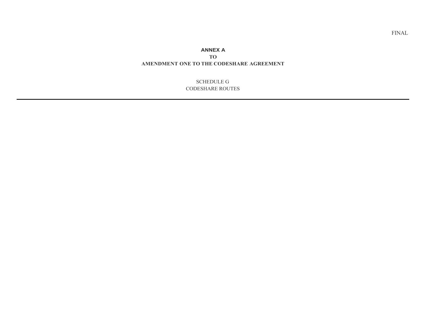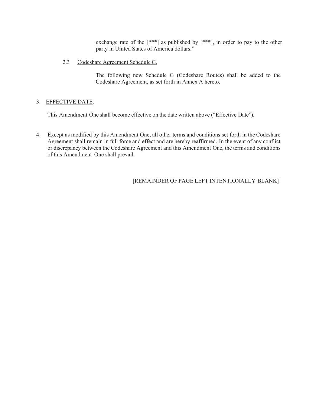 exchange rate of the [***] as published by [***], in order to pay to the other party in United States of America dollars.” 2.3 Codeshare Agreement Schedule G. The following new Schedule G (Codeshare Routes) shall be added to the Codeshare Agreement, as set forth in Annex A hereto. 3. EFFECTIVE DATE. This Amendment One shall become effective on the date written above (“Effective Date”). 4. Except as modified by this Amendment One, all other terms and conditions set forth in the Codeshare Agreement shall remain in full force and effect and are hereby reaffirmed. In the event of any conflict or discrepancy between the Codeshare Agreement and this Amendment One, the terms and conditions of this Amendment One shall prevail. [REMAINDER OF PAGE LEFT INTENTIONALLY BLANK]