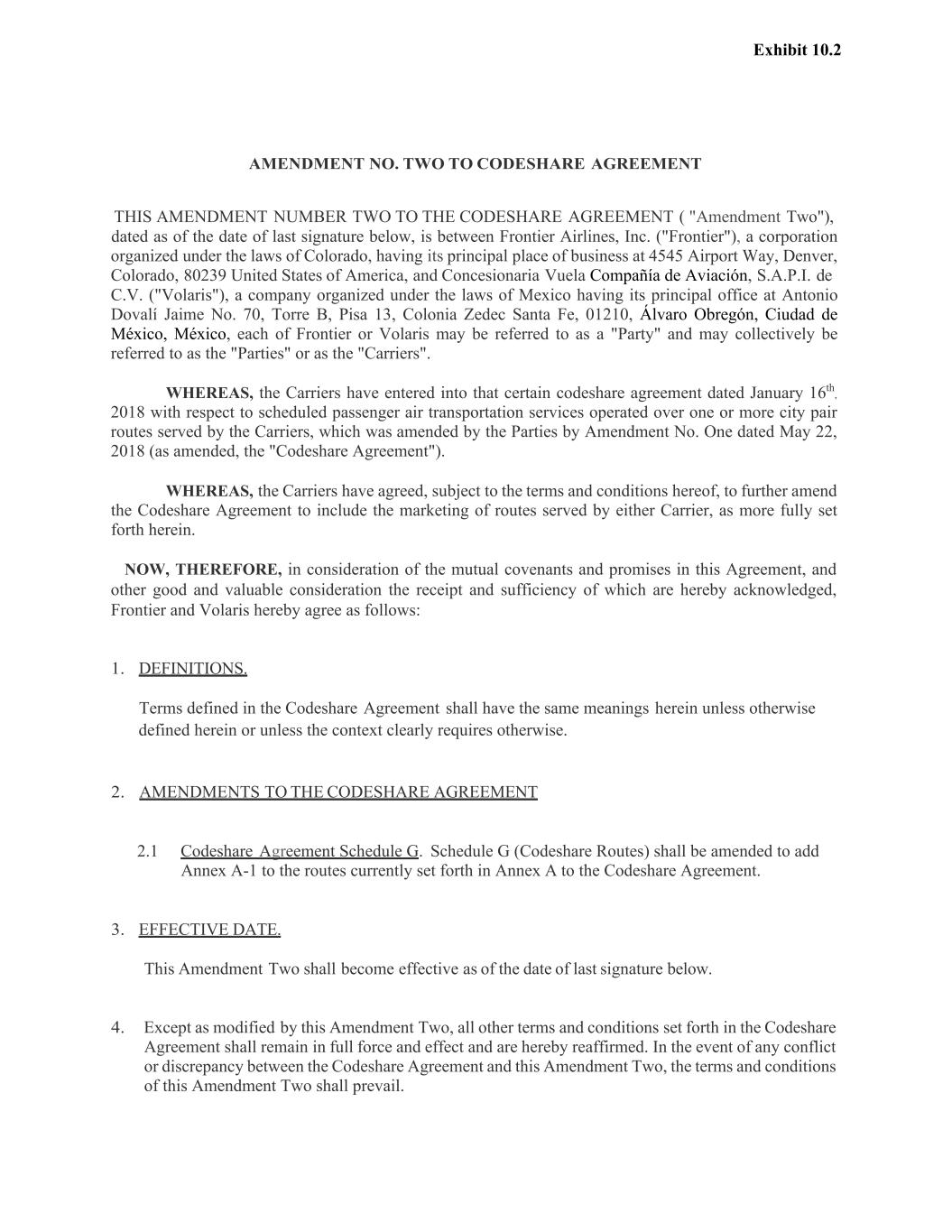 Exhibit 10.2 AMENDMENT NO. TWO TO CODESHARE AGREEMENT THIS AMENDMENT NUMBER TWO TO THE CODESHARE AGREEMENT ( "Amendment Two"), dated as of the date of last signature below, is between Frontier Airlines, Inc. ("Frontier"), a corporation organized under the laws of Colorado, having its principal place of business at 4545 Airport Way, Denver, Colorado, 80239 United States of America, and Concesionaria Vuela Compañía de Aviación, S.A.P.I. de C.V. ("Volaris"), a company organized under the laws of Mexico having its principal office at Antonio Dovalí Jaime No. 70, Torre B, Pisa 13, Colonia Zedec Santa Fe, 01210, Álvaro Obregón, Ciudad de México, México, each of Frontier or Volaris may be referred to as a "Party" and may collectively be referred to as the "Parties" or as the "Carriers". WHEREAS, the Carriers have entered into that certain codeshare agreement dated January 16th , 2018 with respect to scheduled passenger air transportation services operated over one or more city pair routes served by the Carriers, which was amended by the Parties by Amendment No. One dated May 22, 2018 (as amended, the "Codeshare Agreement"). WHEREAS, the Carriers have agreed, subject to the terms and conditions hereof, to further amend the Codeshare Agreement to include the marketing of routes served by either Carrier, as more fully set forth herein. NOW, THEREFORE, in consideration of the mutual covenants and promises in this Agreement, and other good and valuable consideration the receipt and sufficiency of which are hereby acknowledged, Frontier and Volaris hereby agree as follows: 1. DEFINITIONS. Terms defined in the Codeshare Agreement shall have the same meanings herein unless otherwise defined herein or unless the context clearly requires otherwise. 2. AMENDMENTS TO THE CODESHARE AGREEMENT 2.1 Codeshare Agreement Schedule G. Schedule G (Codeshare Routes) shall be amended to add Annex A-1 to the routes currently set forth in Annex A to the Codeshare Agreement. 3. EFFECTIVE DATE. This Amendment Two shall become effective as of the date of last signature below. 4. Except as modified by this Amendment Two, all other terms and conditions set forth in the Codeshare Agreement shall remain in full force and effect and are hereby reaffirmed. In the event of any conflict or discrepancy between the Codeshare Agreement and this Amendment Two, the terms and conditions of this Amendment Two shall prevail.