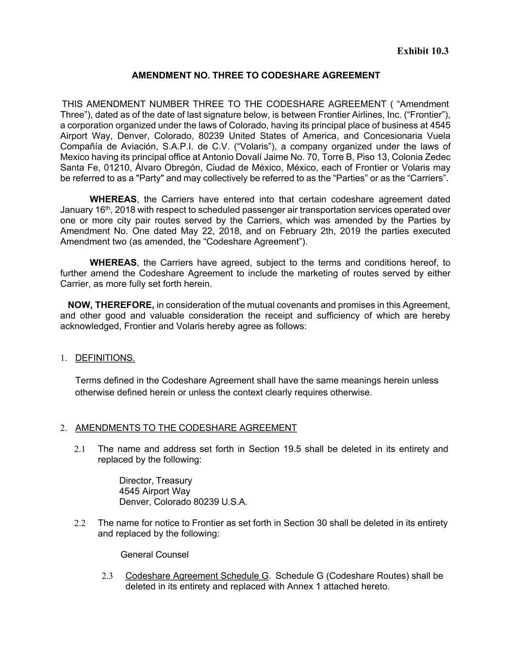 Exhibit 10.3 AMENDMENT NO. THREE TO CODESHARE AGREEMENT THIS AMENDMENT NUMBER THREE TO THE CODESHARE AGREEMENT ( “Amendment Three”), dated as of the date of last signature below, is between Frontier Airlines, Inc. (“Frontier”), a corporation organized under the laws of Colorado, having its principal place of business at 4545 Airport Way, Denver, Colorado, 80239 United States of America, and Concesionaria Vuela Compañía de Aviación, S.A.P.I. de C.V. (“Volaris”), a company organized under the laws of Mexico having its principal office at Antonio Dovalí Jaime No. 70, Torre B, Piso 13, Colonia Zedec Santa Fe, 01210, Álvaro Obregón, Ciudad de México, México, each of Frontier or Volaris may be referred to as a "Party" and may collectively be referred to as the “Parties” or as the “Carriers”. WHEREAS, the Carriers have entered into that certain codeshare agreement dated January 16th, 2018 with respect to scheduled passenger air transportation services operated over one or more city pair routes served by the Carriers, which was amended by the Parties by Amendment No. One dated May 22, 2018, and on February 2th, 2019 the parties executed Amendment two (as amended, the “Codeshare Agreement”). WHEREAS, the Carriers have agreed, subject to the terms and conditions hereof, to further amend the Codeshare Agreement to include the marketing of routes served by either Carrier, as more fully set forth herein. NOW, THEREFORE, in consideration of the mutual covenants and promises in this Agreement, and other good and valuable consideration the receipt and sufficiency of which are hereby acknowledged, Frontier and Volaris hereby agree as follows: 1. DEFINITIONS. Terms defined in the Codeshare Agreement shall have the same meanings herein unless otherwise defined herein or unless the context clearly requires otherwise. 2. AMENDMENTS TO THE CODESHARE AGREEMENT 2.1 The name and address set forth in Section 19.5 shall be deleted in its entirety and replaced by the following: Director, Treasury 4545 Airport Way Denver, Colorado 80239 U.S.A. 2.2 The name for notice to Frontier as set forth in Section 30 shall be deleted in its entirety and replaced by the following: General Counsel 2.3 Codeshare Agreement Schedule G. Schedule G (Codeshare Routes) shall be deleted in its entirety and replaced with Annex 1 attached hereto.