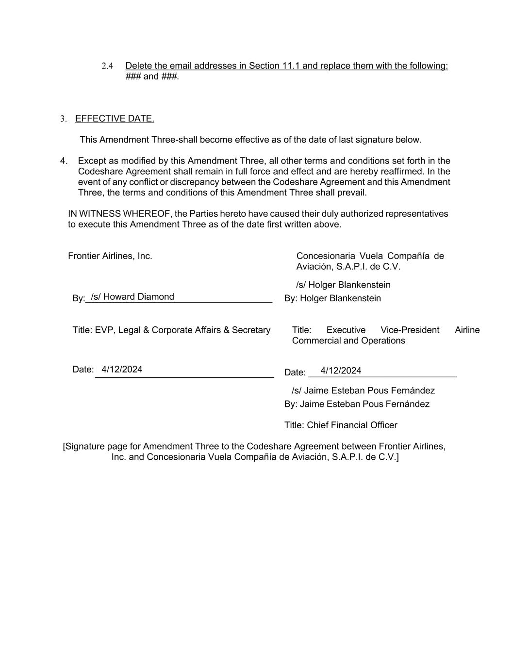 /s/ Howard Diamond 4/12/2024 4/12/2024 /s/ Holger Blankenstein /s/ Jaime Esteban Pous Fernández 2.4 Delete the email addresses in Section 11.1 and replace them with the following: ### and ###. 3. EFFECTIVE DATE. This Amendment Three-shall become effective as of the date of last signature below. 4. Except as modified by this Amendment Three, all other terms and conditions set forth in the Codeshare Agreement shall remain in full force and effect and are hereby reaffirmed. In the event of any conflict or discrepancy between the Codeshare Agreement and this Amendment Three, the terms and conditions of this Amendment Three shall prevail. IN WITNESS WHEREOF, the Parties hereto have caused their duly authorized representatives to execute this Amendment Three as of the date first written above. Frontier Airlines, Inc. Concesionaria Vuela Compañía de Aviación, S.A.P.I. de C.V. By: By: Holger Blankenstein Title: EVP, Legal & Corporate Affairs & Secretary Title: Executive Vice-President Airline Commercial and Operations Date: Date: _____________________________ By: Jaime Esteban Pous Fernández Title: Chief Financial Officer [Signature page for Amendment Three to the Codeshare Agreement between Frontier Airlines, Inc. and Concesionaria Vuela Compañía de Aviación, S.A.P.I. de C.V.]