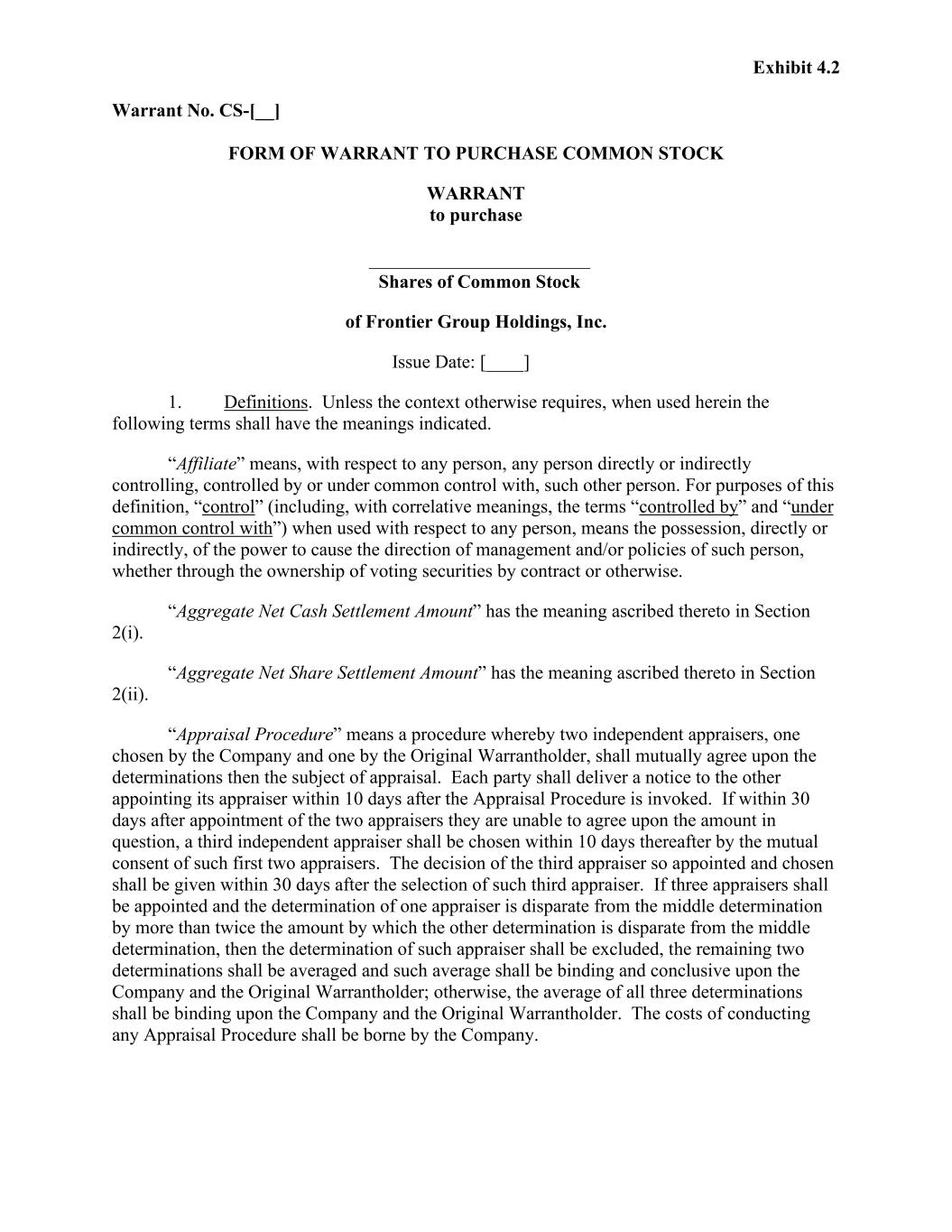 Exhibit 4.2 Warrant No. CS-[__] FORM OF WARRANT TO PURCHASE COMMON STOCK WARRANT to purchase Shares of Common Stock of Frontier Group Holdings, Inc. Issue Date: [____] 1. Definitions. Unless the context otherwise requires, when used herein the following terms shall have the meanings indicated. “Affiliate” means, with respect to any person, any person directly or indirectly controlling, controlled by or under common control with, such other person. For purposes of this definition, “control” (including, with correlative meanings, the terms “controlled by” and “under common control with”) when used with respect to any person, means the possession, directly or indirectly, of the power to cause the direction of management and/or policies of such person, whether through the ownership of voting securities by contract or otherwise. “Aggregate Net Cash Settlement Amount” has the meaning ascribed thereto in Section 2(i). “Aggregate Net Share Settlement Amount” has the meaning ascribed thereto in Section 2(ii). “Appraisal Procedure” means a procedure whereby two independent appraisers, one chosen by the Company and one by the Original Warrantholder, shall mutually agree upon the determinations then the subject of appraisal. Each party shall deliver a notice to the other appointing its appraiser within 10 days after the Appraisal Procedure is invoked. If within 30 days after appointment of the two appraisers they are unable to agree upon the amount in question, a third independent appraiser shall be chosen within 10 days thereafter by the mutual consent of such first two appraisers. The decision of the third appraiser so appointed and chosen shall be given within 30 days after the selection of such third appraiser. If three appraisers shall be appointed and the determination of one appraiser is disparate from the middle determination by more than twice the amount by which the other determination is disparate from the middle determination, then the determination of such appraiser shall be excluded, the remaining two determinations shall be averaged and such average shall be binding and conclusive upon the Company and the Original Warrantholder; otherwise, the average of all three determinations shall be binding upon the Company and the Original Warrantholder. The costs of conducting any Appraisal Procedure shall be borne by the Company.