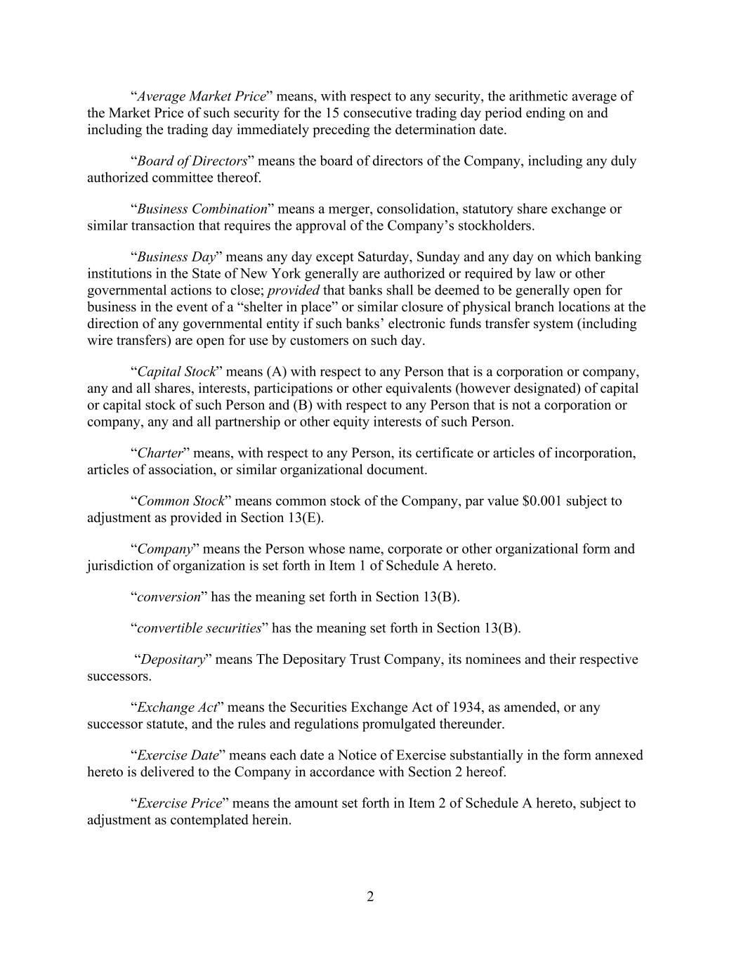 2 “Average Market Price” means, with respect to any security, the arithmetic average of the Market Price of such security for the 15 consecutive trading day period ending on and including the trading day immediately preceding the determination date. “Board of Directors” means the board of directors of the Company, including any duly authorized committee thereof. “Business Combination” means a merger, consolidation, statutory share exchange or similar transaction that requires the approval of the Company’s stockholders. “Business Day” means any day except Saturday, Sunday and any day on which banking institutions in the State of New York generally are authorized or required by law or other governmental actions to close; provided that banks shall be deemed to be generally open for business in the event of a “shelter in place” or similar closure of physical branch locations at the direction of any governmental entity if such banks’ electronic funds transfer system (including wire transfers) are open for use by customers on such day. “Capital Stock” means (A) with respect to any Person that is a corporation or company, any and all shares, interests, participations or other equivalents (however designated) of capital or capital stock of such Person and (B) with respect to any Person that is not a corporation or company, any and all partnership or other equity interests of such Person. “Charter” means, with respect to any Person, its certificate or articles of incorporation, articles of association, or similar organizational document. “Common Stock” means common stock of the Company, par value $0.001 subject to adjustment as provided in Section 13(E). “Company” means the Person whose name, corporate or other organizational form and jurisdiction of organization is set forth in Item 1 of Schedule A hereto. “conversion” has the meaning set forth in Section 13(B). “convertible securities” has the meaning set forth in Section 13(B). “Depositary” means The Depositary Trust Company, its nominees and their respective successors. “Exchange Act” means the Securities Exchange Act of 1934, as amended, or any successor statute, and the rules and regulations promulgated thereunder. “Exercise Date” means each date a Notice of Exercise substantially in the form annexed hereto is delivered to the Company in accordance with Section 2 hereof. “Exercise Price” means the amount set forth in Item 2 of Schedule A hereto, subject to adjustment as contemplated herein.