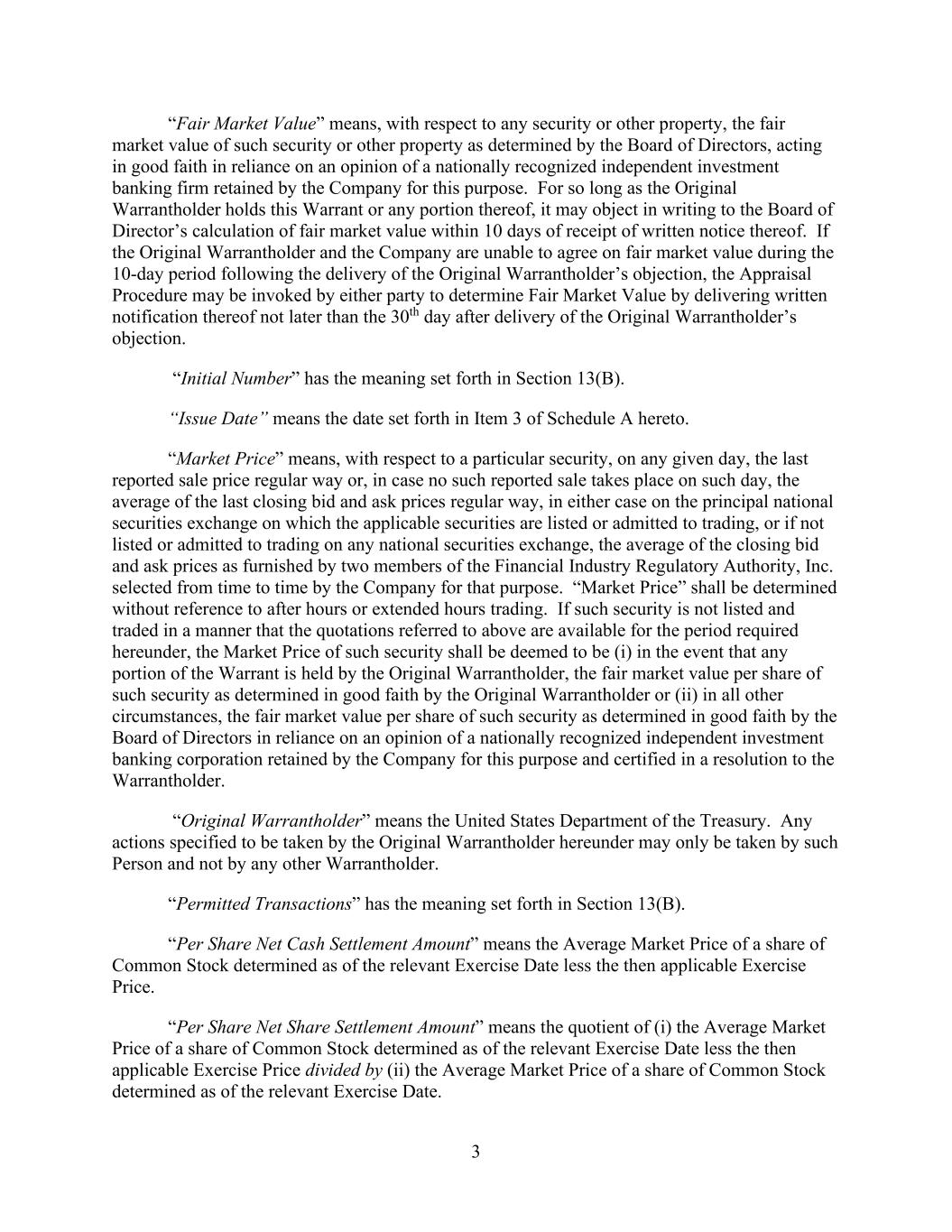 3 “Fair Market Value” means, with respect to any security or other property, the fair market value of such security or other property as determined by the Board of Directors, acting in good faith in reliance on an opinion of a nationally recognized independent investment banking firm retained by the Company for this purpose. For so long as the Original Warrantholder holds this Warrant or any portion thereof, it may object in writing to the Board of Director’s calculation of fair market value within 10 days of receipt of written notice thereof. If the Original Warrantholder and the Company are unable to agree on fair market value during the 10-day period following the delivery of the Original Warrantholder’s objection, the Appraisal Procedure may be invoked by either party to determine Fair Market Value by delivering written notification thereof not later than the 30th day after delivery of the Original Warrantholder’s objection. “Initial Number” has the meaning set forth in Section 13(B). “Issue Date” means the date set forth in Item 3 of Schedule A hereto. “Market Price” means, with respect to a particular security, on any given day, the last reported sale price regular way or, in case no such reported sale takes place on such day, the average of the last closing bid and ask prices regular way, in either case on the principal national securities exchange on which the applicable securities are listed or admitted to trading, or if not listed or admitted to trading on any national securities exchange, the average of the closing bid and ask prices as furnished by two members of the Financial Industry Regulatory Authority, Inc. selected from time to time by the Company for that purpose. “Market Price” shall be determined without reference to after hours or extended hours trading. If such security is not listed and traded in a manner that the quotations referred to above are available for the period required hereunder, the Market Price of such security shall be deemed to be (i) in the event that any portion of the Warrant is held by the Original Warrantholder, the fair market value per share of such security as determined in good faith by the Original Warrantholder or (ii) in all other circumstances, the fair market value per share of such security as determined in good faith by the Board of Directors in reliance on an opinion of a nationally recognized independent investment banking corporation retained by the Company for this purpose and certified in a resolution to the Warrantholder. “Original Warrantholder” means the United States Department of the Treasury. Any actions specified to be taken by the Original Warrantholder hereunder may only be taken by such Person and not by any other Warrantholder. “Permitted Transactions” has the meaning set forth in Section 13(B). “Per Share Net Cash Settlement Amount” means the Average Market Price of a share of Common Stock determined as of the relevant Exercise Date less the then applicable Exercise Price. “Per Share Net Share Settlement Amount” means the quotient of (i) the Average Market Price of a share of Common Stock determined as of the relevant Exercise Date less the then applicable Exercise Price divided by (ii) the Average Market Price of a share of Common Stock determined as of the relevant Exercise Date.
