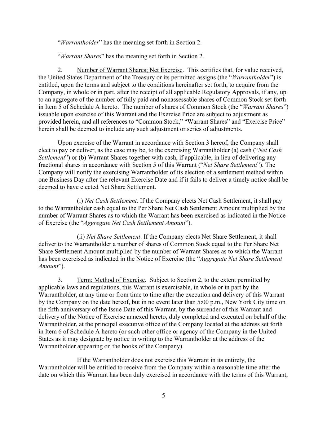 5 “Warrantholder” has the meaning set forth in Section 2. “Warrant Shares” has the meaning set forth in Section 2. 2. Number of Warrant Shares; Net Exercise. This certifies that, for value received, the United States Department of the Treasury or its permitted assigns (the “Warrantholder”) is entitled, upon the terms and subject to the conditions hereinafter set forth, to acquire from the Company, in whole or in part, after the receipt of all applicable Regulatory Approvals, if any, up to an aggregate of the number of fully paid and nonassessable shares of Common Stock set forth in Item 5 of Schedule A hereto. The number of shares of Common Stock (the “Warrant Shares”) issuable upon exercise of this Warrant and the Exercise Price are subject to adjustment as provided herein, and all references to “Common Stock,” “Warrant Shares” and “Exercise Price” herein shall be deemed to include any such adjustment or series of adjustments. Upon exercise of the Warrant in accordance with Section 3 hereof, the Company shall elect to pay or deliver, as the case may be, to the exercising Warrantholder (a) cash (“Net Cash Settlement”) or (b) Warrant Shares together with cash, if applicable, in lieu of delivering any fractional shares in accordance with Section 5 of this Warrant (“Net Share Settlement”). The Company will notify the exercising Warrantholder of its election of a settlement method within one Business Day after the relevant Exercise Date and if it fails to deliver a timely notice shall be deemed to have elected Net Share Settlement. (i) Net Cash Settlement. If the Company elects Net Cash Settlement, it shall pay to the Warrantholder cash equal to the Per Share Net Cash Settlement Amount multiplied by the number of Warrant Shares as to which the Warrant has been exercised as indicated in the Notice of Exercise (the “Aggregate Net Cash Settlement Amount”). (ii) Net Share Settlement. If the Company elects Net Share Settlement, it shall deliver to the Warrantholder a number of shares of Common Stock equal to the Per Share Net Share Settlement Amount multiplied by the number of Warrant Shares as to which the Warrant has been exercised as indicated in the Notice of Exercise (the “Aggregate Net Share Settlement Amount”). 3. Term; Method of Exercise. Subject to Section 2, to the extent permitted by applicable laws and regulations, this Warrant is exercisable, in whole or in part by the Warrantholder, at any time or from time to time after the execution and delivery of this Warrant by the Company on the date hereof, but in no event later than 5:00 p.m., New York City time on the fifth anniversary of the Issue Date of this Warrant, by the surrender of this Warrant and delivery of the Notice of Exercise annexed hereto, duly completed and executed on behalf of the Warrantholder, at the principal executive office of the Company located at the address set forth in Item 6 of Schedule A hereto (or such other office or agency of the Company in the United States as it may designate by notice in writing to the Warrantholder at the address of the Warrantholder appearing on the books of the Company). If the Warrantholder does not exercise this Warrant in its entirety, the Warrantholder will be entitled to receive from the Company within a reasonable time after the date on which this Warrant has been duly exercised in accordance with the terms of this Warrant,