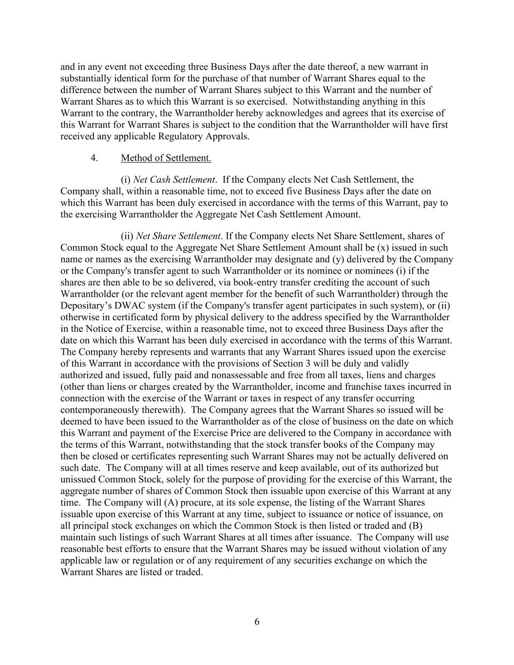 6 and in any event not exceeding three Business Days after the date thereof, a new warrant in substantially identical form for the purchase of that number of Warrant Shares equal to the difference between the number of Warrant Shares subject to this Warrant and the number of Warrant Shares as to which this Warrant is so exercised. Notwithstanding anything in this Warrant to the contrary, the Warrantholder hereby acknowledges and agrees that its exercise of this Warrant for Warrant Shares is subject to the condition that the Warrantholder will have first received any applicable Regulatory Approvals. 4. Method of Settlement. (i) Net Cash Settlement. If the Company elects Net Cash Settlement, the Company shall, within a reasonable time, not to exceed five Business Days after the date on which this Warrant has been duly exercised in accordance with the terms of this Warrant, pay to the exercising Warrantholder the Aggregate Net Cash Settlement Amount. (ii) Net Share Settlement. If the Company elects Net Share Settlement, shares of Common Stock equal to the Aggregate Net Share Settlement Amount shall be (x) issued in such name or names as the exercising Warrantholder may designate and (y) delivered by the Company or the Company's transfer agent to such Warrantholder or its nominee or nominees (i) if the shares are then able to be so delivered, via book-entry transfer crediting the account of such Warrantholder (or the relevant agent member for the benefit of such Warrantholder) through the Depositary’s DWAC system (if the Company's transfer agent participates in such system), or (ii) otherwise in certificated form by physical delivery to the address specified by the Warrantholder in the Notice of Exercise, within a reasonable time, not to exceed three Business Days after the date on which this Warrant has been duly exercised in accordance with the terms of this Warrant. The Company hereby represents and warrants that any Warrant Shares issued upon the exercise of this Warrant in accordance with the provisions of Section 3 will be duly and validly authorized and issued, fully paid and nonassessable and free from all taxes, liens and charges (other than liens or charges created by the Warrantholder, income and franchise taxes incurred in connection with the exercise of the Warrant or taxes in respect of any transfer occurring contemporaneously therewith). The Company agrees that the Warrant Shares so issued will be deemed to have been issued to the Warrantholder as of the close of business on the date on which this Warrant and payment of the Exercise Price are delivered to the Company in accordance with the terms of this Warrant, notwithstanding that the stock transfer books of the Company may then be closed or certificates representing such Warrant Shares may not be actually delivered on such date. The Company will at all times reserve and keep available, out of its authorized but unissued Common Stock, solely for the purpose of providing for the exercise of this Warrant, the aggregate number of shares of Common Stock then issuable upon exercise of this Warrant at any time. The Company will (A) procure, at its sole expense, the listing of the Warrant Shares issuable upon exercise of this Warrant at any time, subject to issuance or notice of issuance, on all principal stock exchanges on which the Common Stock is then listed or traded and (B) maintain such listings of such Warrant Shares at all times after issuance. The Company will use reasonable best efforts to ensure that the Warrant Shares may be issued without violation of any applicable law or regulation or of any requirement of any securities exchange on which the Warrant Shares are listed or traded.