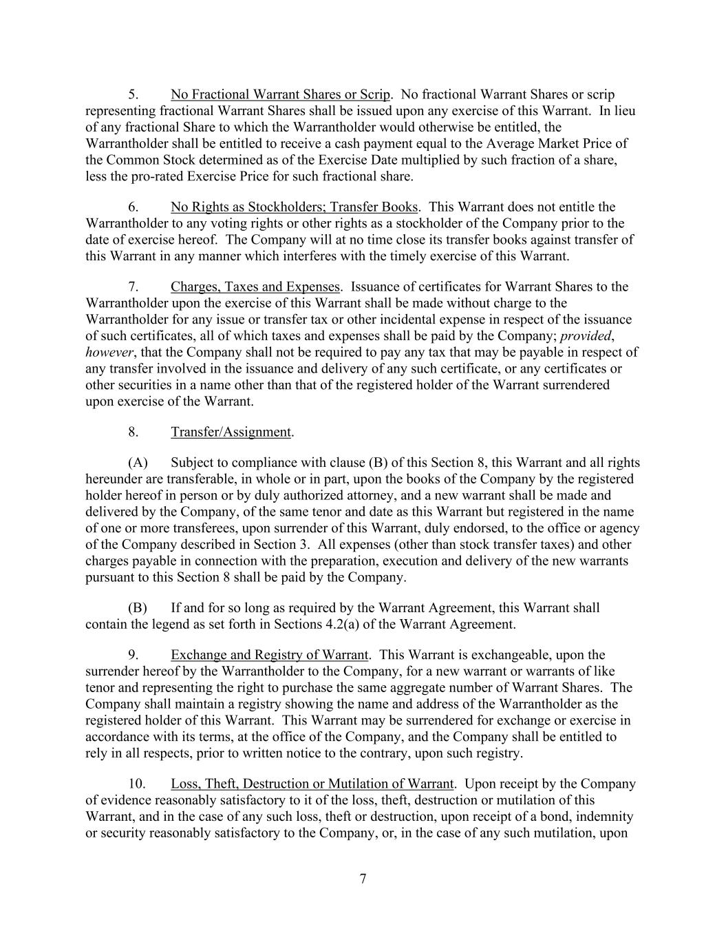 7 5. No Fractional Warrant Shares or Scrip. No fractional Warrant Shares or scrip representing fractional Warrant Shares shall be issued upon any exercise of this Warrant. In lieu of any fractional Share to which the Warrantholder would otherwise be entitled, the Warrantholder shall be entitled to receive a cash payment equal to the Average Market Price of the Common Stock determined as of the Exercise Date multiplied by such fraction of a share, less the pro-rated Exercise Price for such fractional share. 6. No Rights as Stockholders; Transfer Books. This Warrant does not entitle the Warrantholder to any voting rights or other rights as a stockholder of the Company prior to the date of exercise hereof. The Company will at no time close its transfer books against transfer of this Warrant in any manner which interferes with the timely exercise of this Warrant. 7. Charges, Taxes and Expenses. Issuance of certificates for Warrant Shares to the Warrantholder upon the exercise of this Warrant shall be made without charge to the Warrantholder for any issue or transfer tax or other incidental expense in respect of the issuance of such certificates, all of which taxes and expenses shall be paid by the Company; provided, however, that the Company shall not be required to pay any tax that may be payable in respect of any transfer involved in the issuance and delivery of any such certificate, or any certificates or other securities in a name other than that of the registered holder of the Warrant surrendered upon exercise of the Warrant. 8. Transfer/Assignment. (A) Subject to compliance with clause (B) of this Section 8, this Warrant and all rights hereunder are transferable, in whole or in part, upon the books of the Company by the registered holder hereof in person or by duly authorized attorney, and a new warrant shall be made and delivered by the Company, of the same tenor and date as this Warrant but registered in the name of one or more transferees, upon surrender of this Warrant, duly endorsed, to the office or agency of the Company described in Section 3. All expenses (other than stock transfer taxes) and other charges payable in connection with the preparation, execution and delivery of the new warrants pursuant to this Section 8 shall be paid by the Company. (B) If and for so long as required by the Warrant Agreement, this Warrant shall contain the legend as set forth in Sections 4.2(a) of the Warrant Agreement. 9. Exchange and Registry of Warrant. This Warrant is exchangeable, upon the surrender hereof by the Warrantholder to the Company, for a new warrant or warrants of like tenor and representing the right to purchase the same aggregate number of Warrant Shares. The Company shall maintain a registry showing the name and address of the Warrantholder as the registered holder of this Warrant. This Warrant may be surrendered for exchange or exercise in accordance with its terms, at the office of the Company, and the Company shall be entitled to rely in all respects, prior to written notice to the contrary, upon such registry. 10. Loss, Theft, Destruction or Mutilation of Warrant. Upon receipt by the Company of evidence reasonably satisfactory to it of the loss, theft, destruction or mutilation of this Warrant, and in the case of any such loss, theft or destruction, upon receipt of a bond, indemnity or security reasonably satisfactory to the Company, or, in the case of any such mutilation, upon