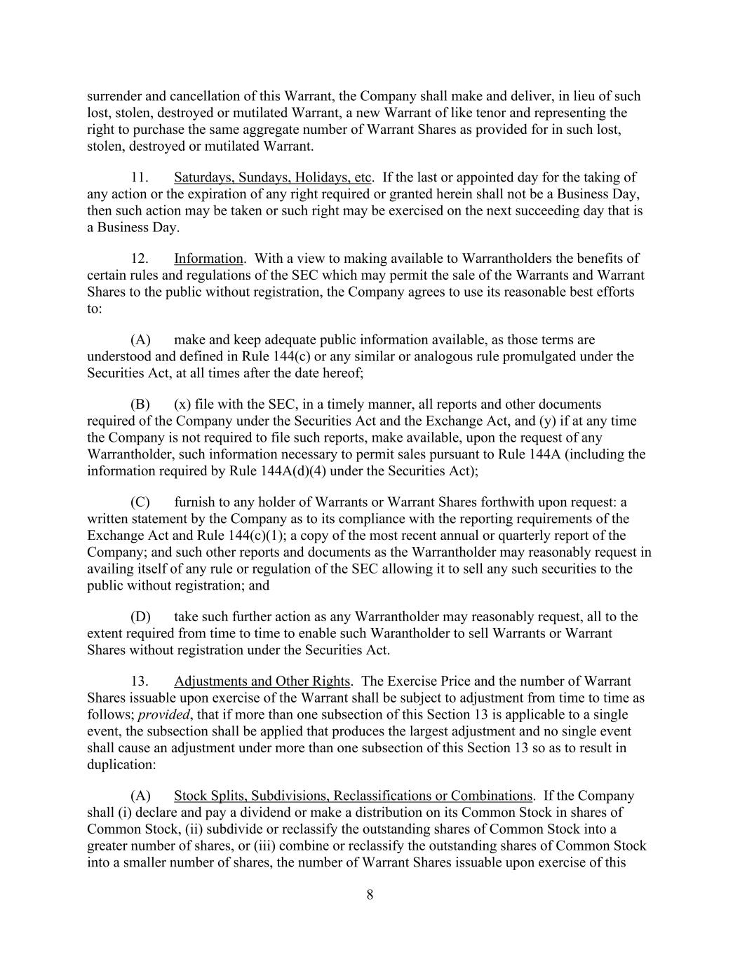 8 surrender and cancellation of this Warrant, the Company shall make and deliver, in lieu of such lost, stolen, destroyed or mutilated Warrant, a new Warrant of like tenor and representing the right to purchase the same aggregate number of Warrant Shares as provided for in such lost, stolen, destroyed or mutilated Warrant. 11. Saturdays, Sundays, Holidays, etc. If the last or appointed day for the taking of any action or the expiration of any right required or granted herein shall not be a Business Day, then such action may be taken or such right may be exercised on the next succeeding day that is a Business Day. 12. Information. With a view to making available to Warrantholders the benefits of certain rules and regulations of the SEC which may permit the sale of the Warrants and Warrant Shares to the public without registration, the Company agrees to use its reasonable best efforts to: (A) make and keep adequate public information available, as those terms are understood and defined in Rule 144(c) or any similar or analogous rule promulgated under the Securities Act, at all times after the date hereof; (B) (x) file with the SEC, in a timely manner, all reports and other documents required of the Company under the Securities Act and the Exchange Act, and (y) if at any time the Company is not required to file such reports, make available, upon the request of any Warrantholder, such information necessary to permit sales pursuant to Rule 144A (including the information required by Rule 144A(d)(4) under the Securities Act); (C) furnish to any holder of Warrants or Warrant Shares forthwith upon request: a written statement by the Company as to its compliance with the reporting requirements of the Exchange Act and Rule 144(c)(1); a copy of the most recent annual or quarterly report of the Company; and such other reports and documents as the Warrantholder may reasonably request in availing itself of any rule or regulation of the SEC allowing it to sell any such securities to the public without registration; and (D) take such further action as any Warrantholder may reasonably request, all to the extent required from time to time to enable such Warantholder to sell Warrants or Warrant Shares without registration under the Securities Act. 13. Adjustments and Other Rights. The Exercise Price and the number of Warrant Shares issuable upon exercise of the Warrant shall be subject to adjustment from time to time as follows; provided, that if more than one subsection of this Section 13 is applicable to a single event, the subsection shall be applied that produces the largest adjustment and no single event shall cause an adjustment under more than one subsection of this Section 13 so as to result in duplication: (A) Stock Splits, Subdivisions, Reclassifications or Combinations. If the Company shall (i) declare and pay a dividend or make a distribution on its Common Stock in shares of Common Stock, (ii) subdivide or reclassify the outstanding shares of Common Stock into a greater number of shares, or (iii) combine or reclassify the outstanding shares of Common Stock into a smaller number of shares, the number of Warrant Shares issuable upon exercise of this