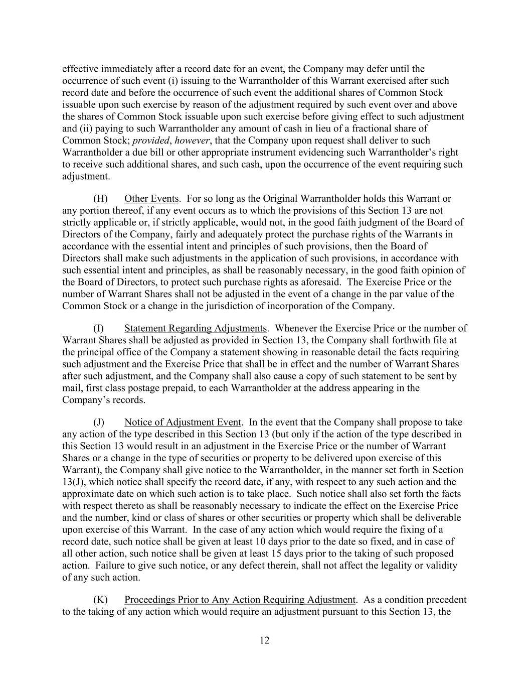 12 effective immediately after a record date for an event, the Company may defer until the occurrence of such event (i) issuing to the Warrantholder of this Warrant exercised after such record date and before the occurrence of such event the additional shares of Common Stock issuable upon such exercise by reason of the adjustment required by such event over and above the shares of Common Stock issuable upon such exercise before giving effect to such adjustment and (ii) paying to such Warrantholder any amount of cash in lieu of a fractional share of Common Stock; provided, however, that the Company upon request shall deliver to such Warrantholder a due bill or other appropriate instrument evidencing such Warrantholder’s right to receive such additional shares, and such cash, upon the occurrence of the event requiring such adjustment. (H) Other Events. For so long as the Original Warrantholder holds this Warrant or any portion thereof, if any event occurs as to which the provisions of this Section 13 are not strictly applicable or, if strictly applicable, would not, in the good faith judgment of the Board of Directors of the Company, fairly and adequately protect the purchase rights of the Warrants in accordance with the essential intent and principles of such provisions, then the Board of Directors shall make such adjustments in the application of such provisions, in accordance with such essential intent and principles, as shall be reasonably necessary, in the good faith opinion of the Board of Directors, to protect such purchase rights as aforesaid. The Exercise Price or the number of Warrant Shares shall not be adjusted in the event of a change in the par value of the Common Stock or a change in the jurisdiction of incorporation of the Company. (I) Statement Regarding Adjustments. Whenever the Exercise Price or the number of Warrant Shares shall be adjusted as provided in Section 13, the Company shall forthwith file at the principal office of the Company a statement showing in reasonable detail the facts requiring such adjustment and the Exercise Price that shall be in effect and the number of Warrant Shares after such adjustment, and the Company shall also cause a copy of such statement to be sent by mail, first class postage prepaid, to each Warrantholder at the address appearing in the Company’s records. (J) Notice of Adjustment Event. In the event that the Company shall propose to take any action of the type described in this Section 13 (but only if the action of the type described in this Section 13 would result in an adjustment in the Exercise Price or the number of Warrant Shares or a change in the type of securities or property to be delivered upon exercise of this Warrant), the Company shall give notice to the Warrantholder, in the manner set forth in Section 13(J), which notice shall specify the record date, if any, with respect to any such action and the approximate date on which such action is to take place. Such notice shall also set forth the facts with respect thereto as shall be reasonably necessary to indicate the effect on the Exercise Price and the number, kind or class of shares or other securities or property which shall be deliverable upon exercise of this Warrant. In the case of any action which would require the fixing of a record date, such notice shall be given at least 10 days prior to the date so fixed, and in case of all other action, such notice shall be given at least 15 days prior to the taking of such proposed action. Failure to give such notice, or any defect therein, shall not affect the legality or validity of any such action. (K) Proceedings Prior to Any Action Requiring Adjustment. As a condition precedent to the taking of any action which would require an adjustment pursuant to this Section 13, the